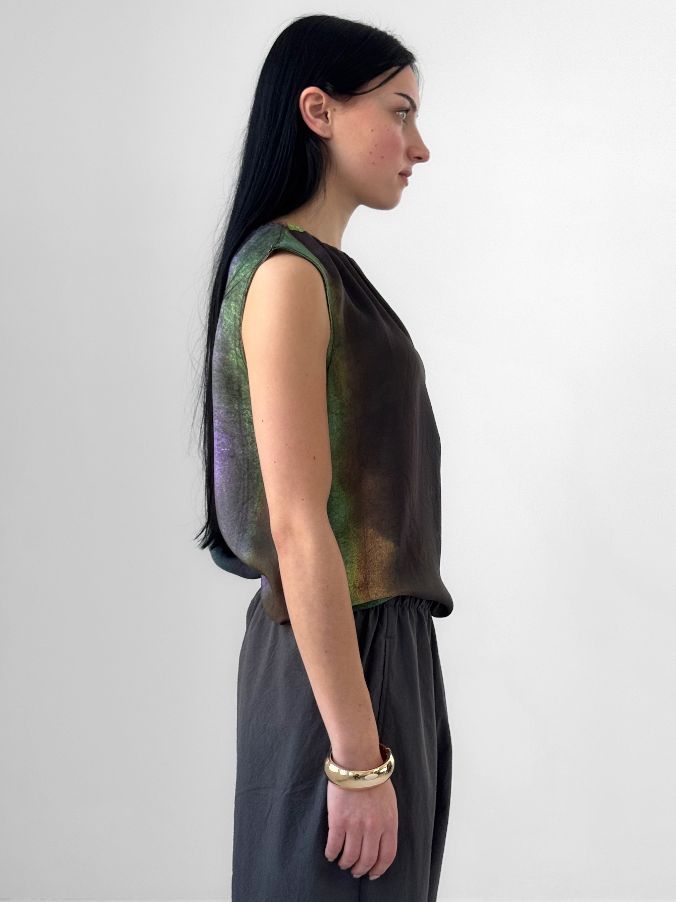 The Space print, inspired by shifting atmospheres and distant horizons, gives each piece a unique character with organic variations from one garment to the next. A softly gathered elastic neckline adds gentle structure, while raw edge sleeves bring a tactile, handcrafted finish.
