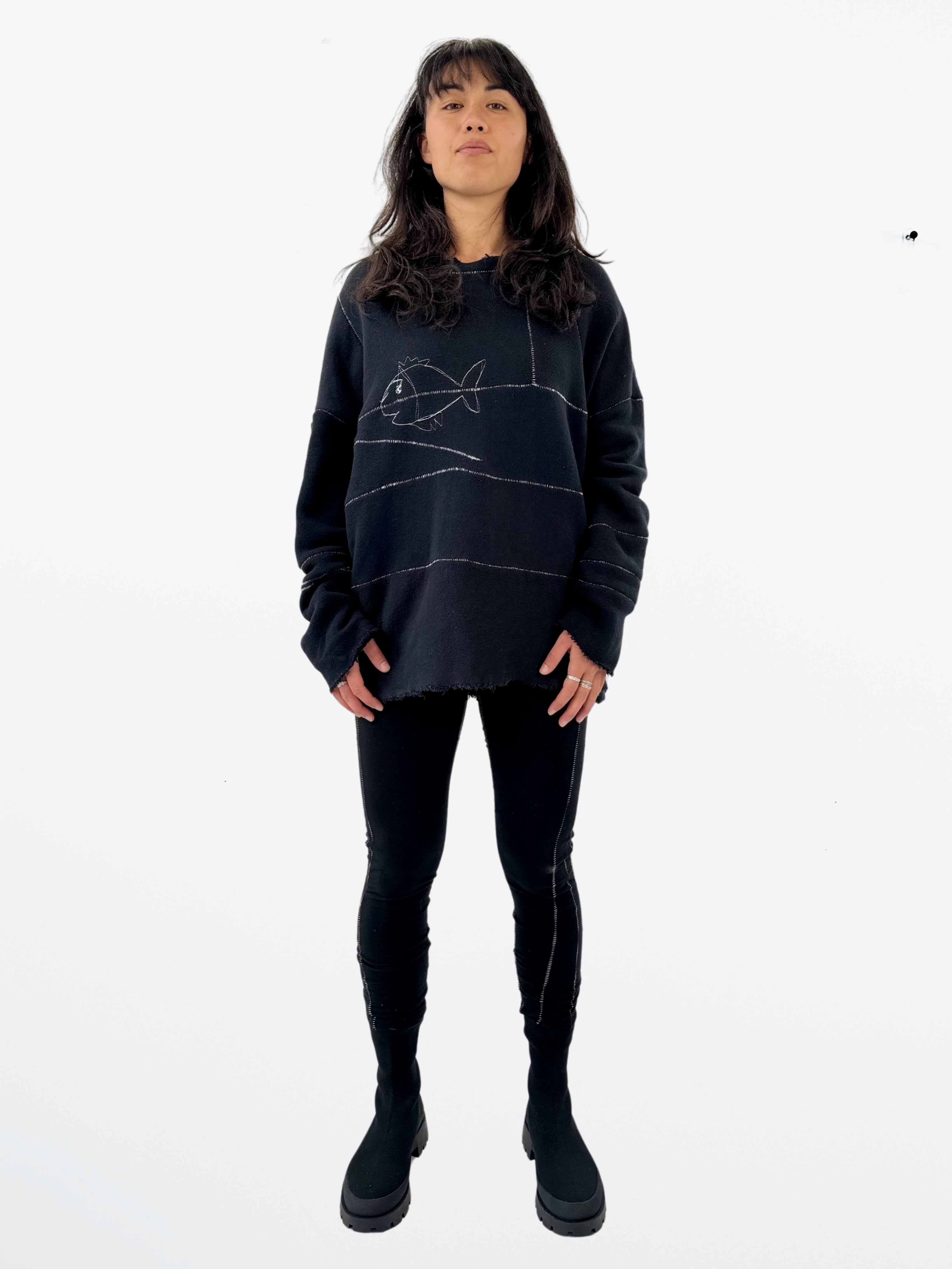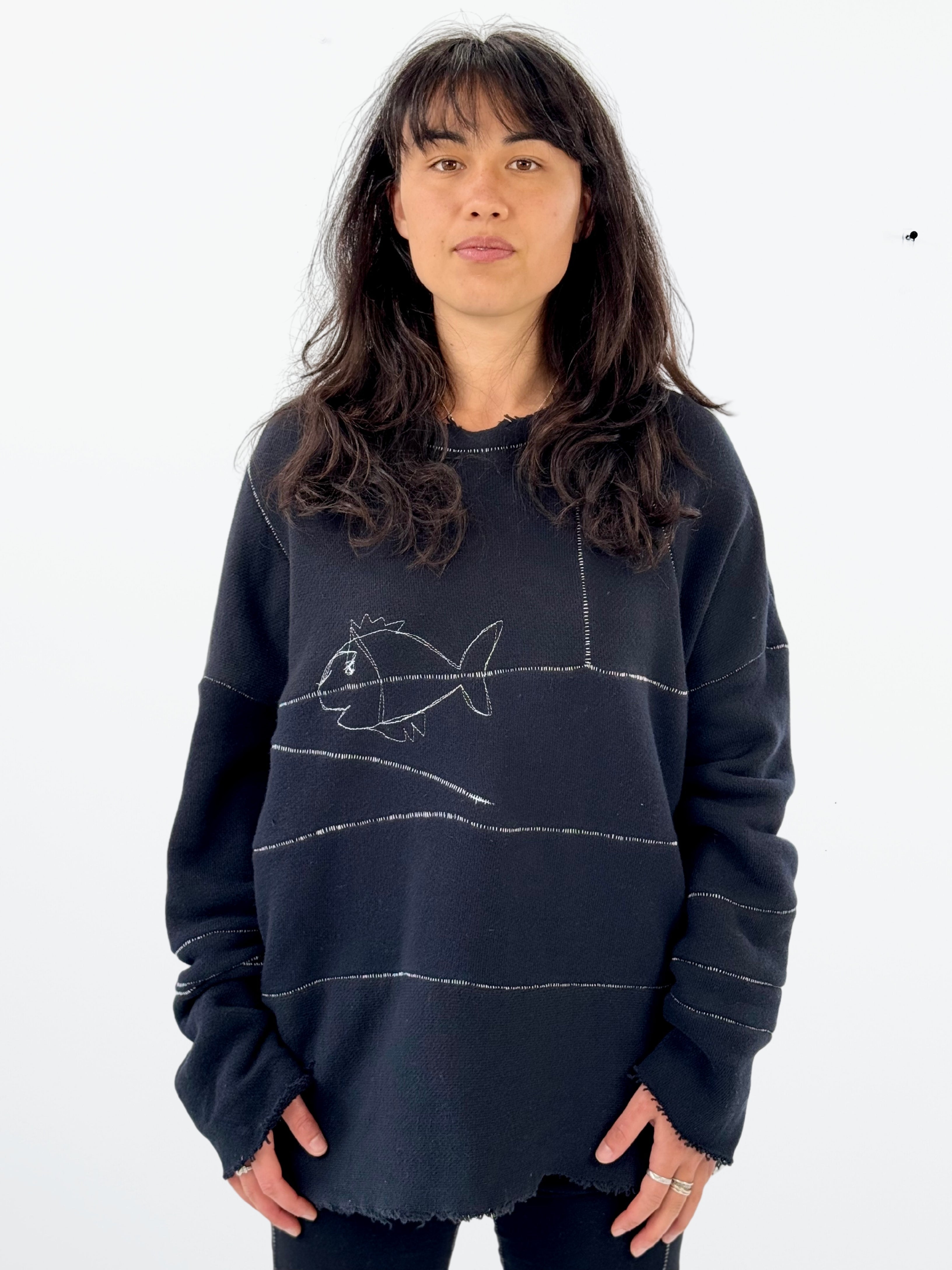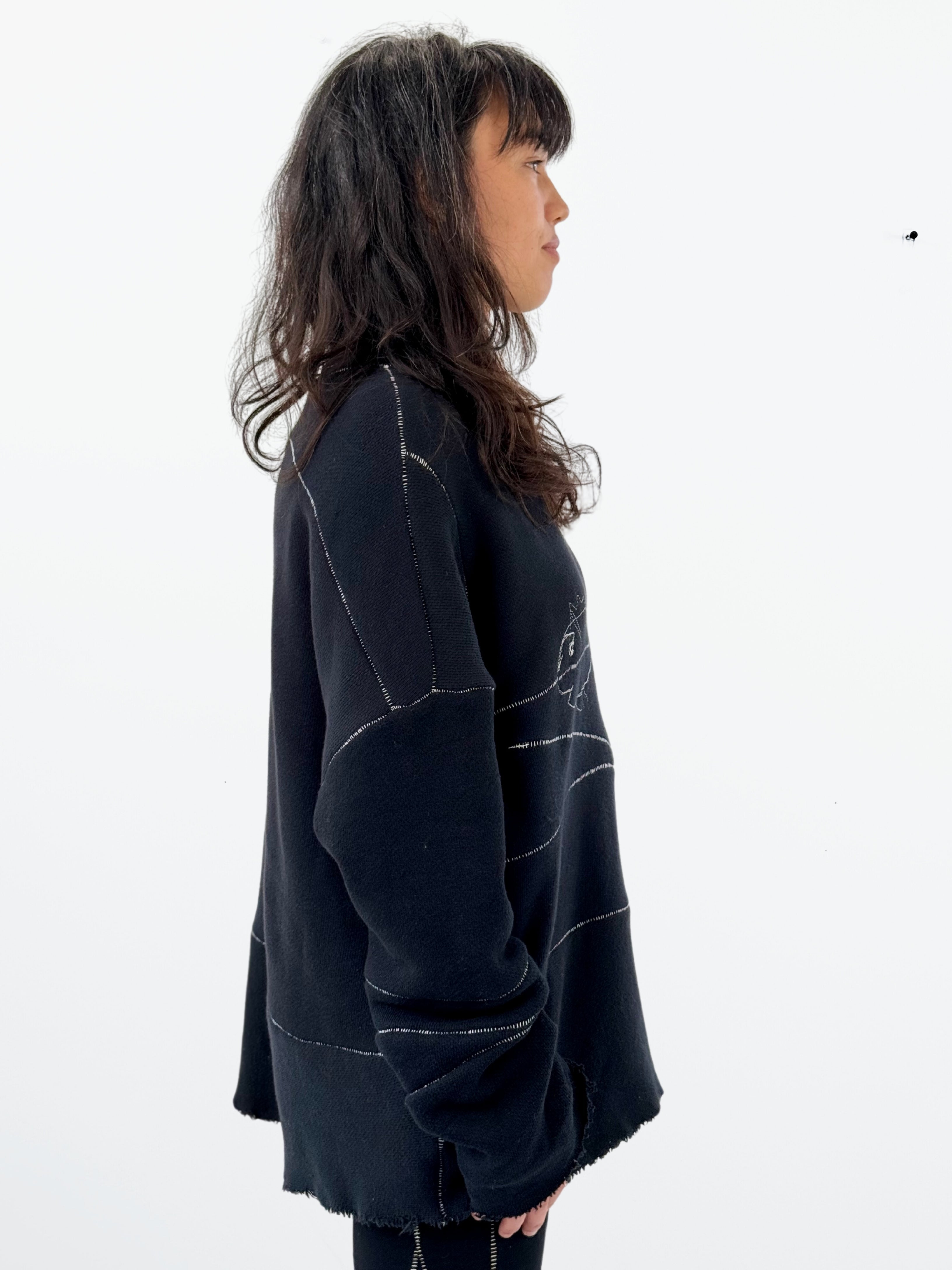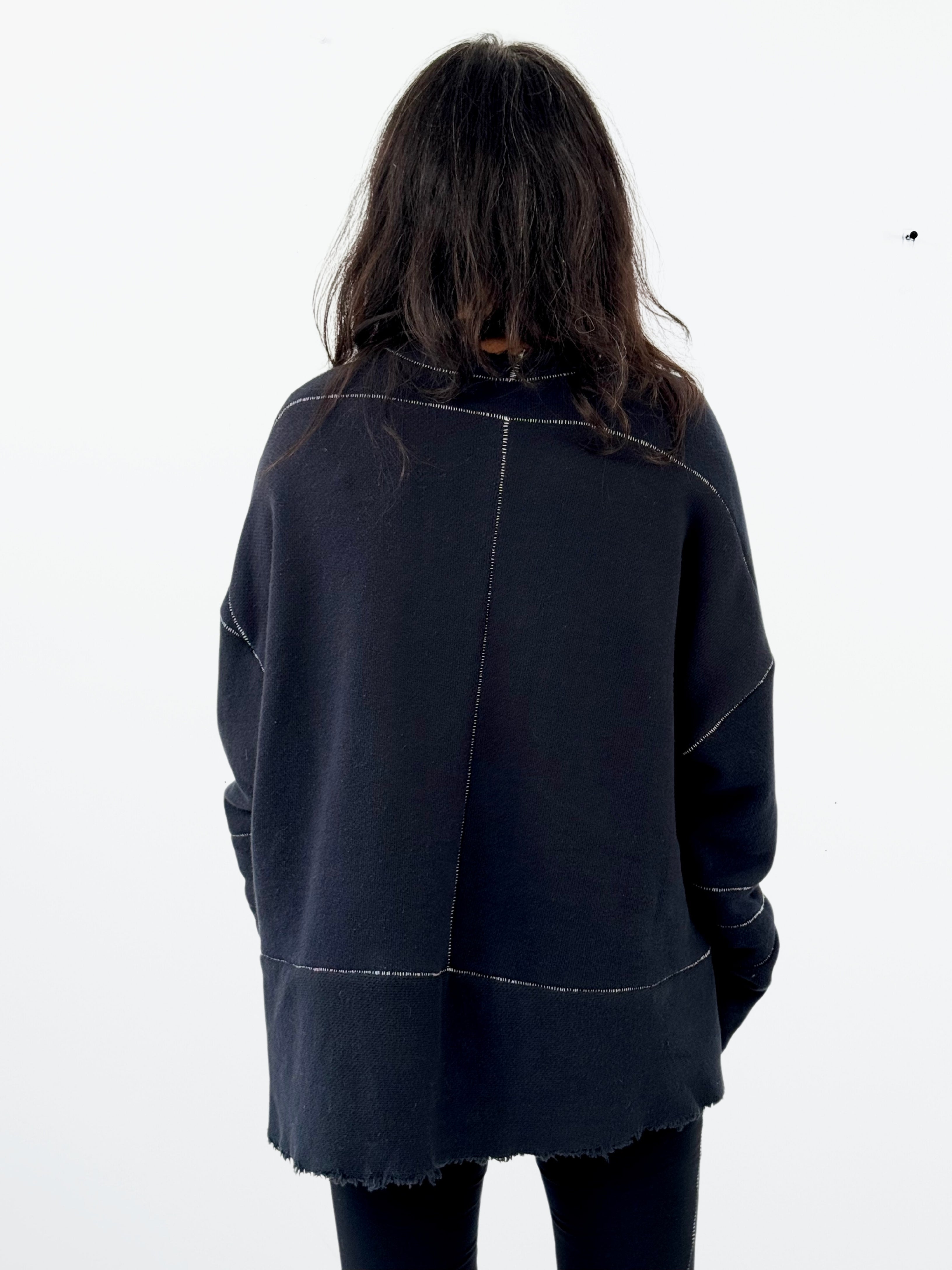 Oversized loose fitting pullover with open seam detailing and raw edges at the neck, sleeves, and hem. Crafted with our luxurious, big loop terry fabric.