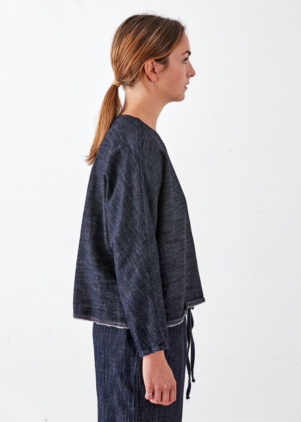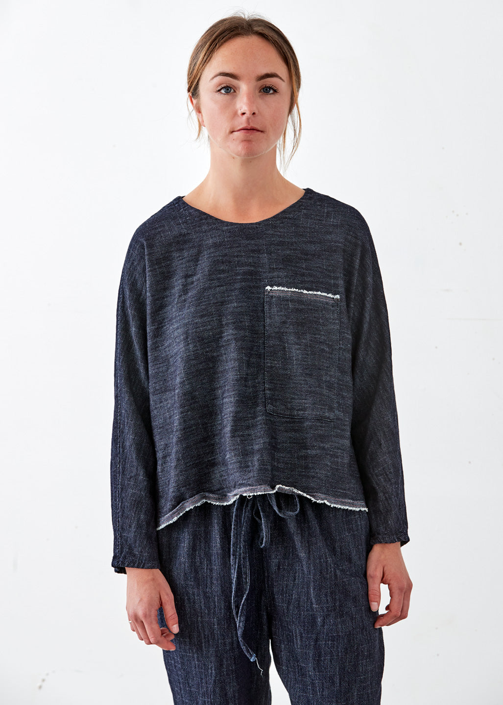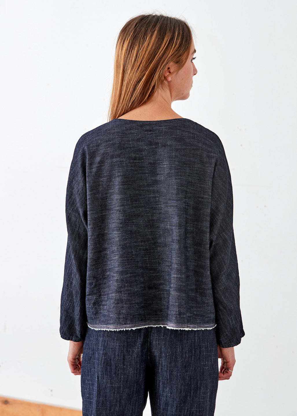 Crafted with heavyweight washed denim, this shell offers a relaxed fit with dolman sleeves and finished with a selvage edge detail at the hem and pockets.
