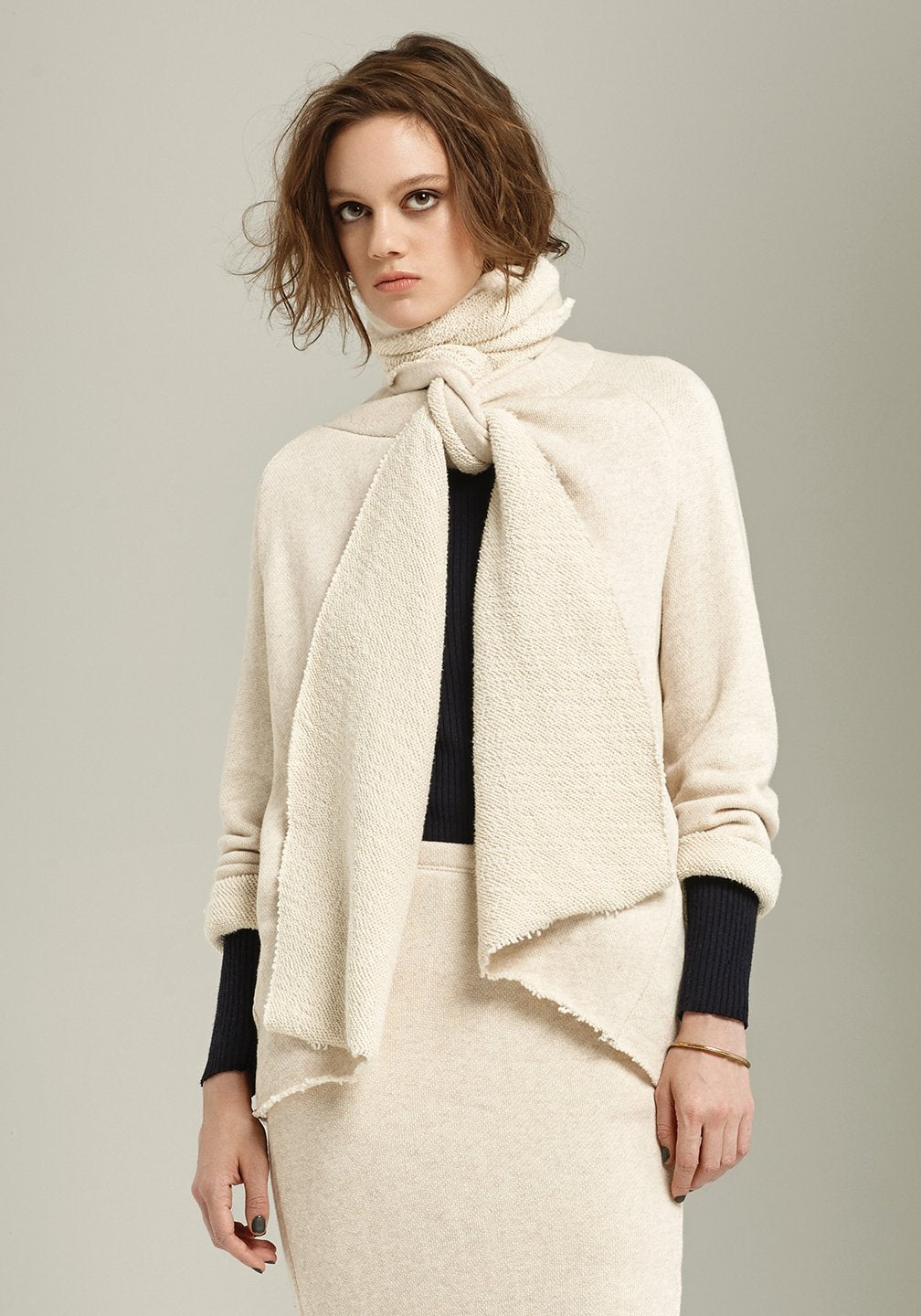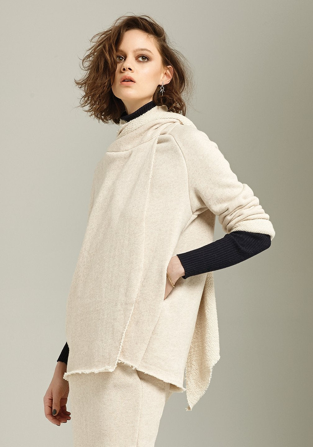 Celestine has raw edges along the front, scarf, hem and sleeves.