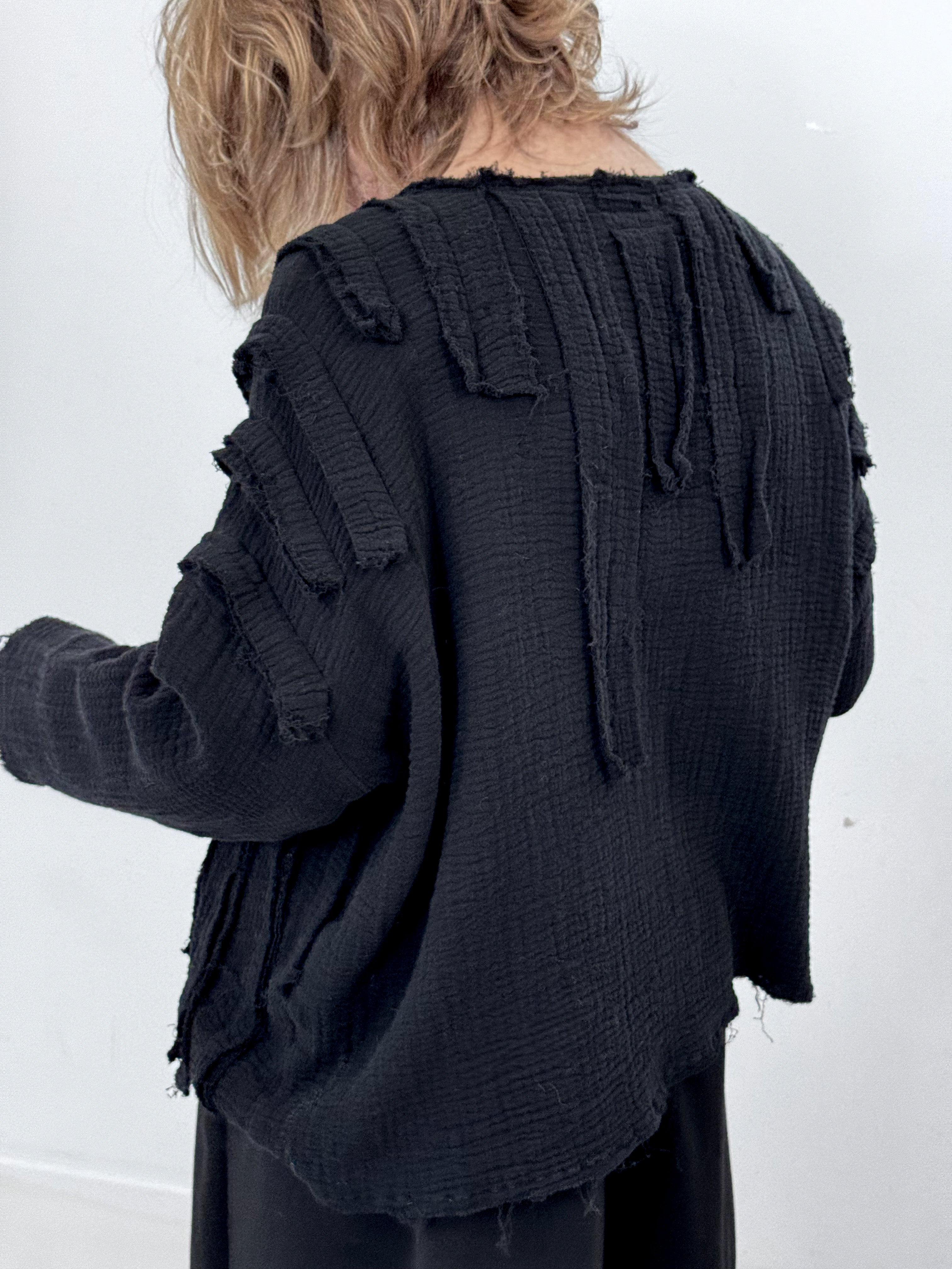 The Cheyenne is crafted in pure triple-gauze cotton and finished entirely by hand, making each piece truly unique. Raw-edge strips are individually applied to create a sculpted, weathered texture that feels both artisanal and effortless. Lightweight with a soft, relaxed drape, the Cheyenne moves with subtle texture and organic character.