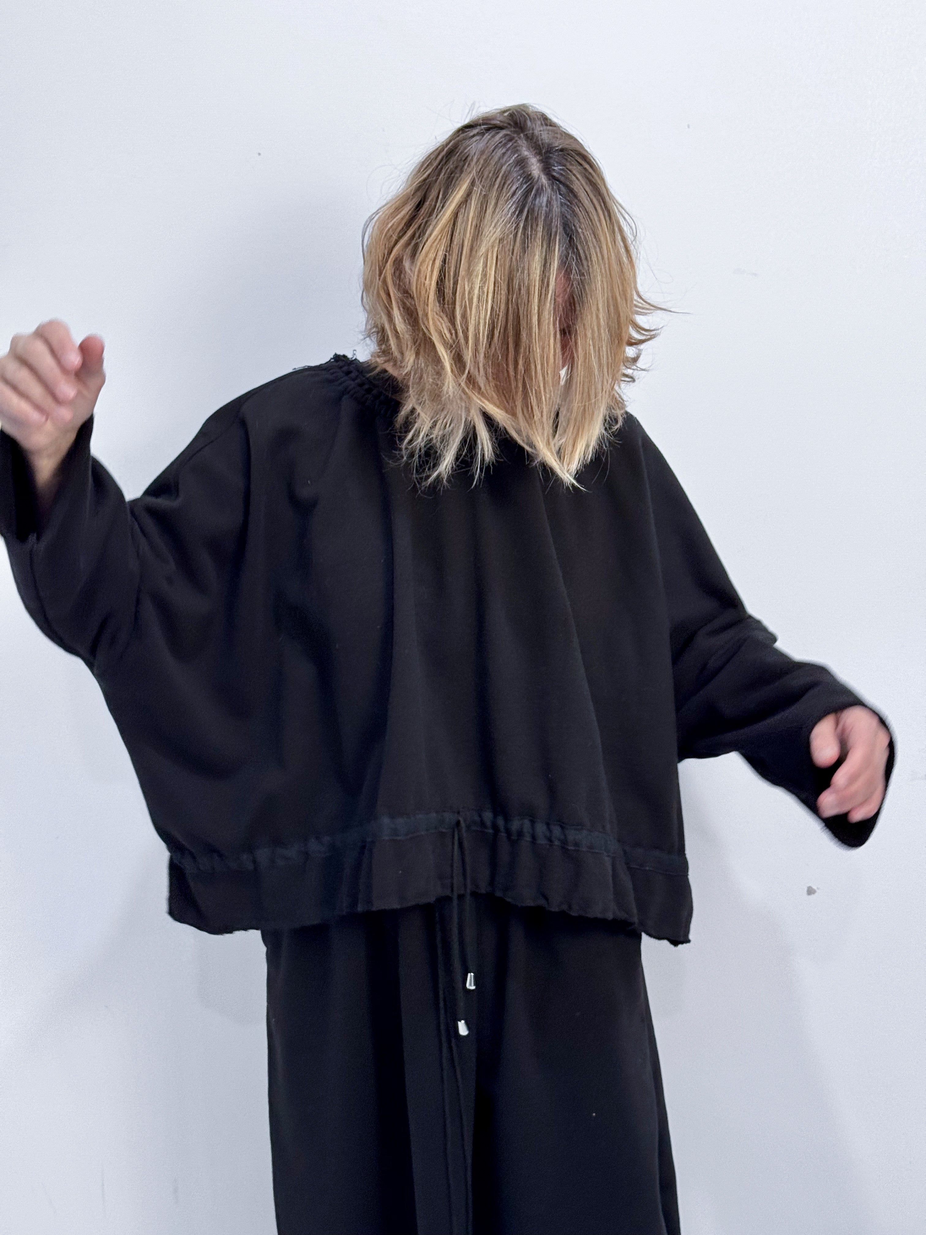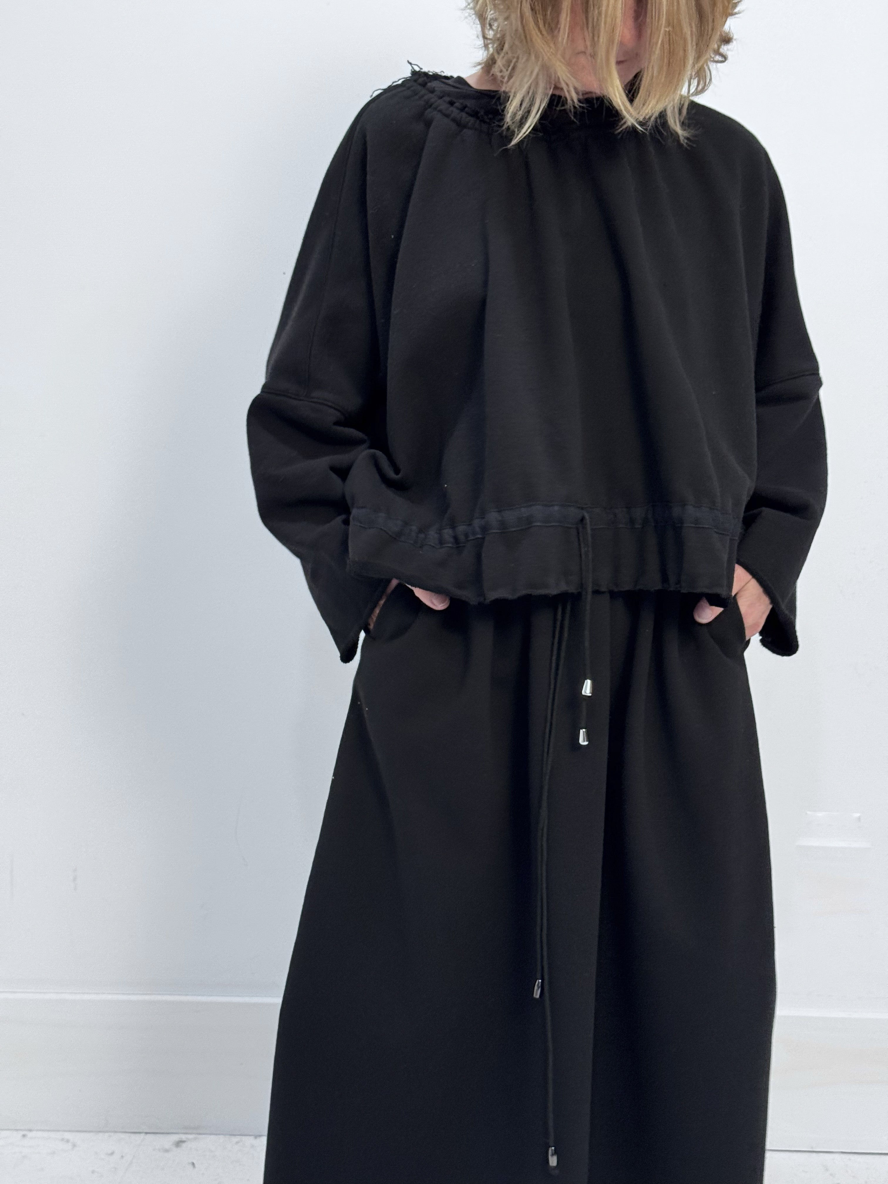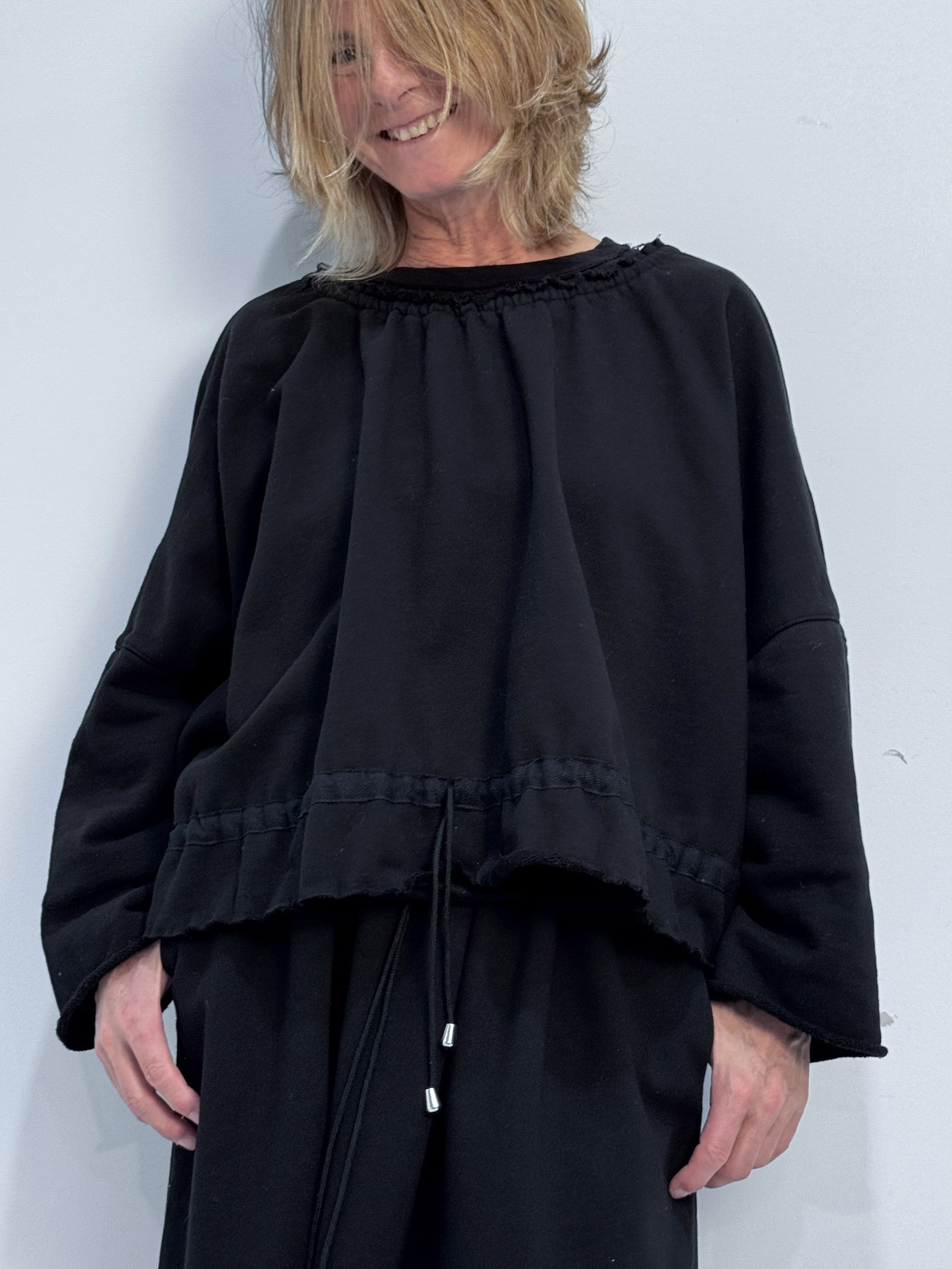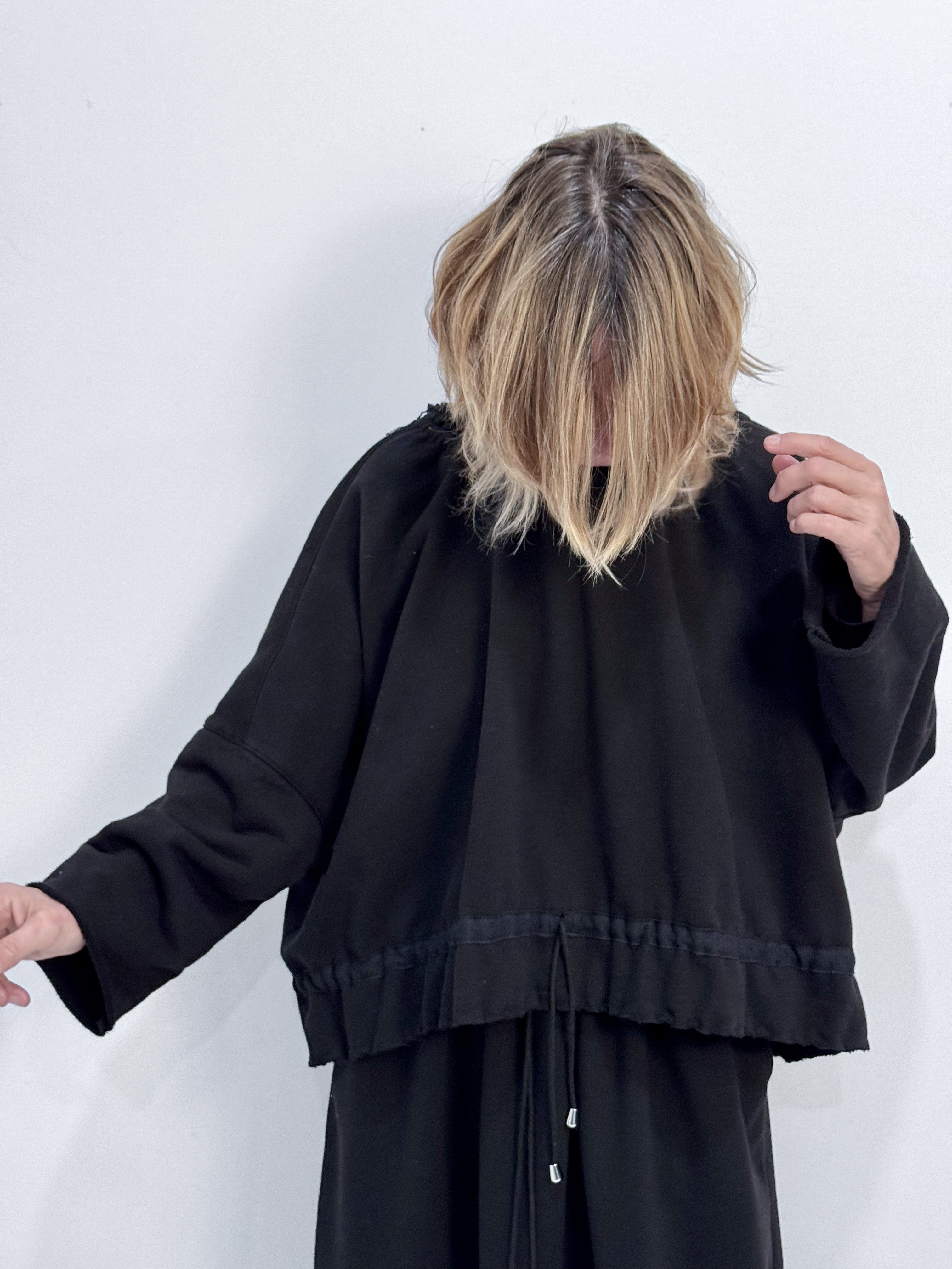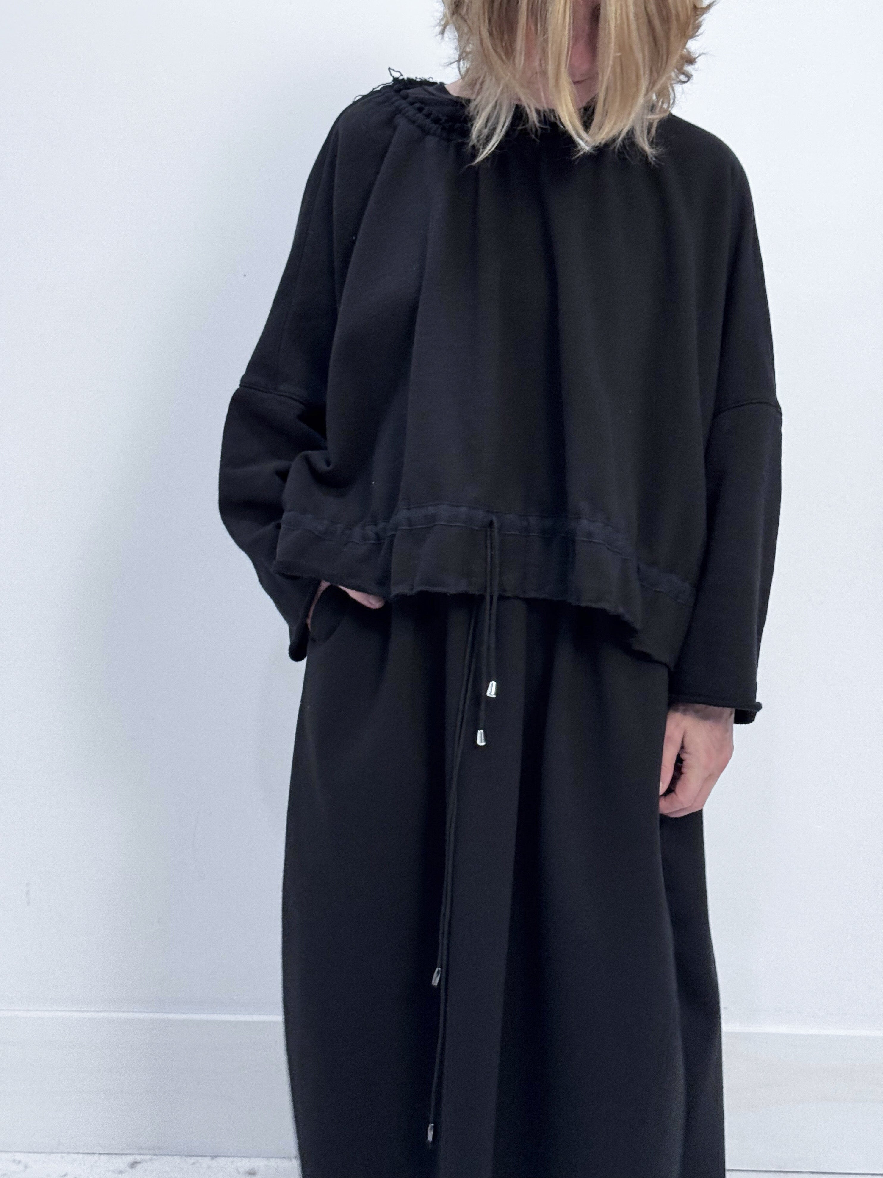 Soft, sculptural, and effortlessly feminine. This sweatshirt is crafted in a thick black cotton fleece that drapes beautifully while holding subtle volume. The gathered neckline with adjustable drawstring at neck and waist creates gentle, natural pleats that frame the shoulders and soften the silhouette. Wide sleeves and a relaxed, boxy shape give the piece a quiet elegance—easy, comfortable, and distinctly refined.