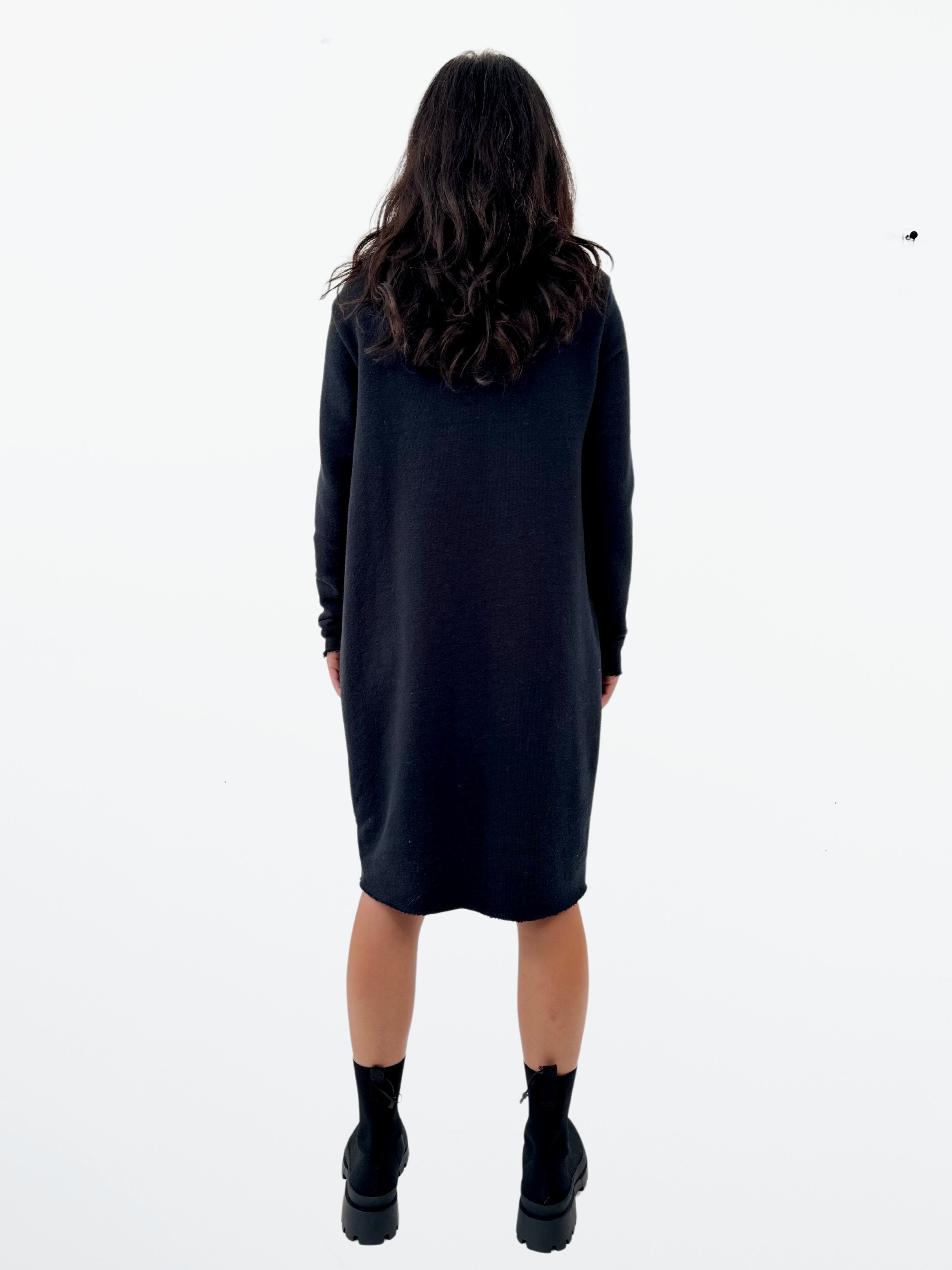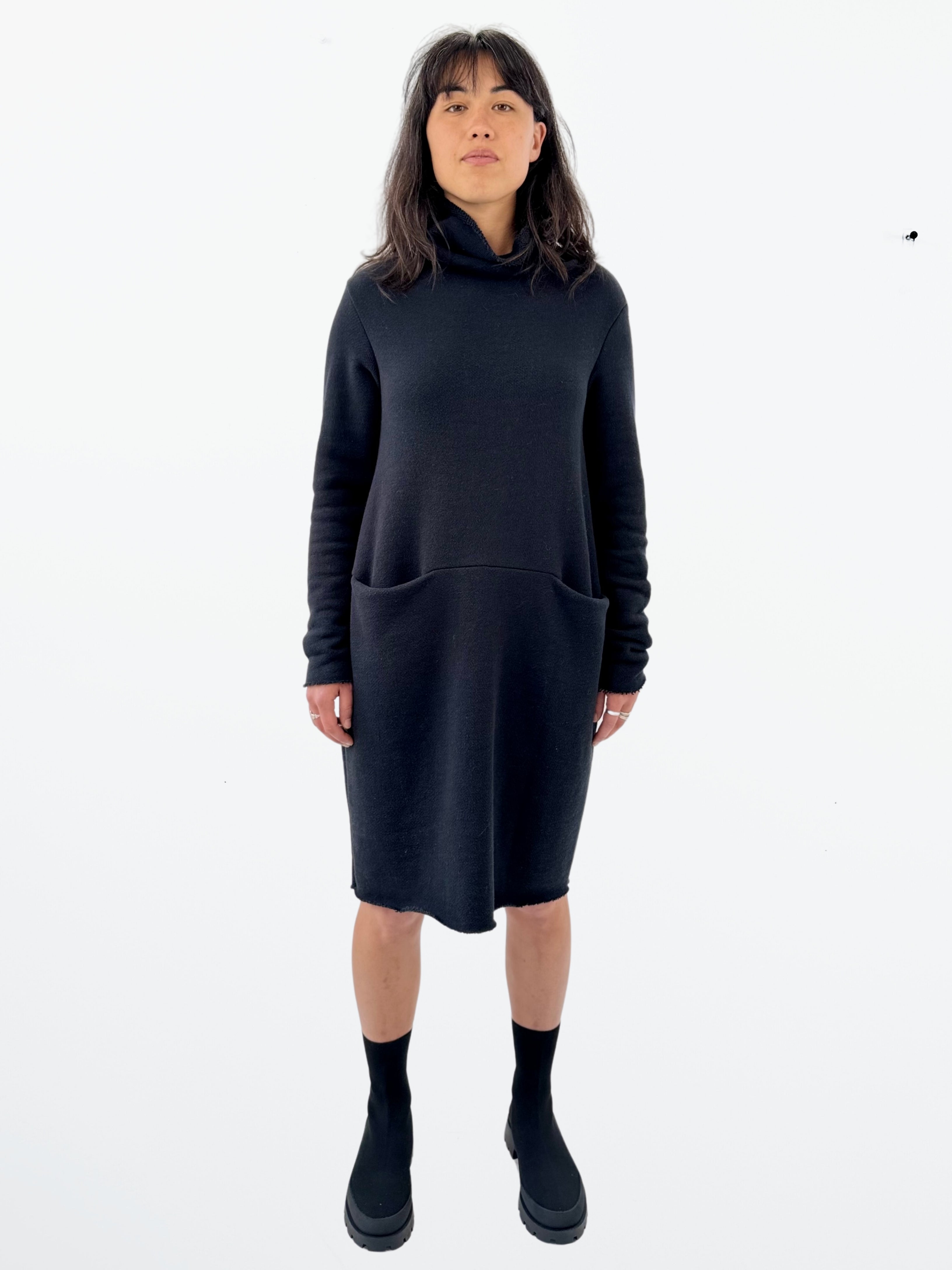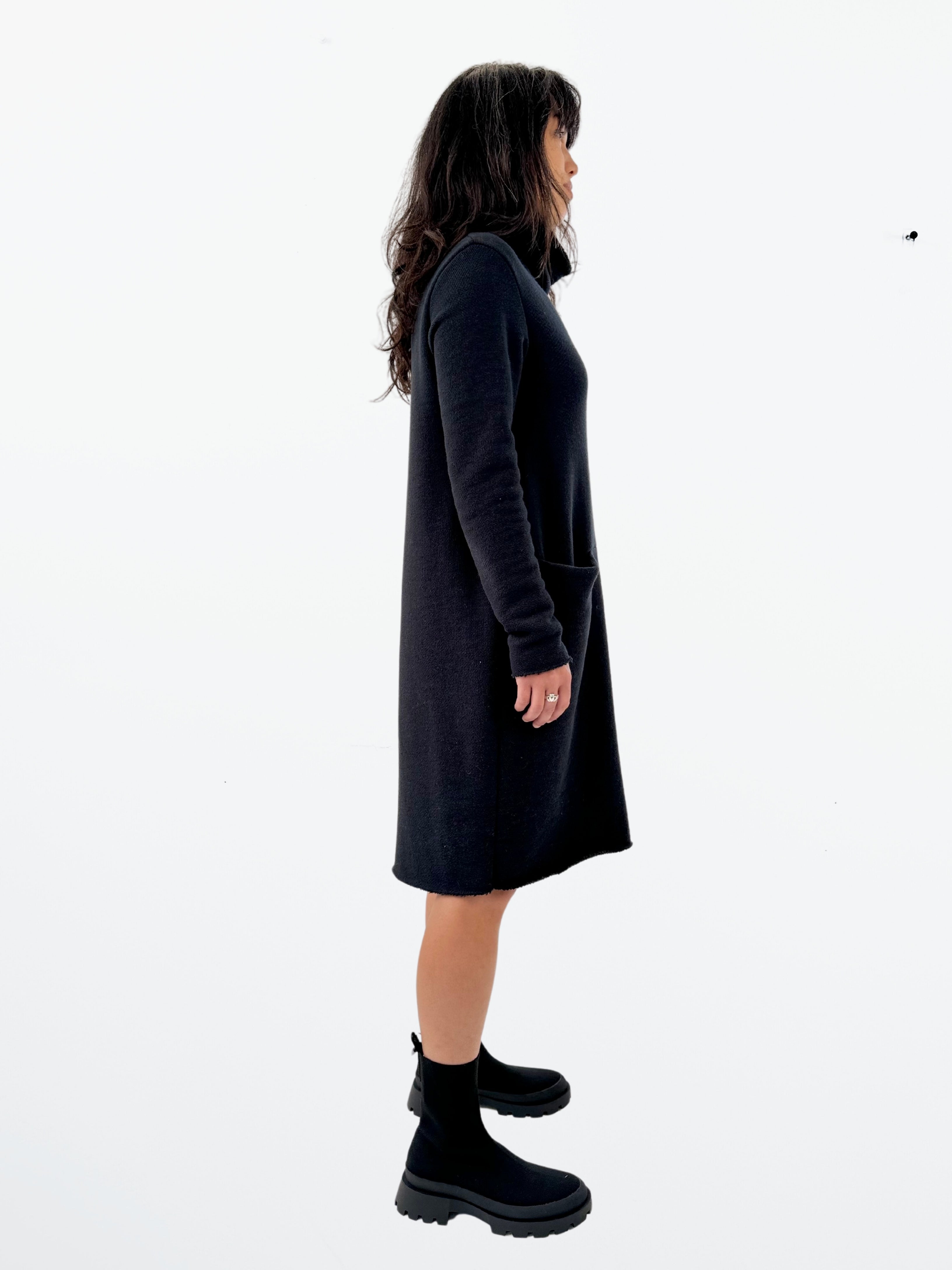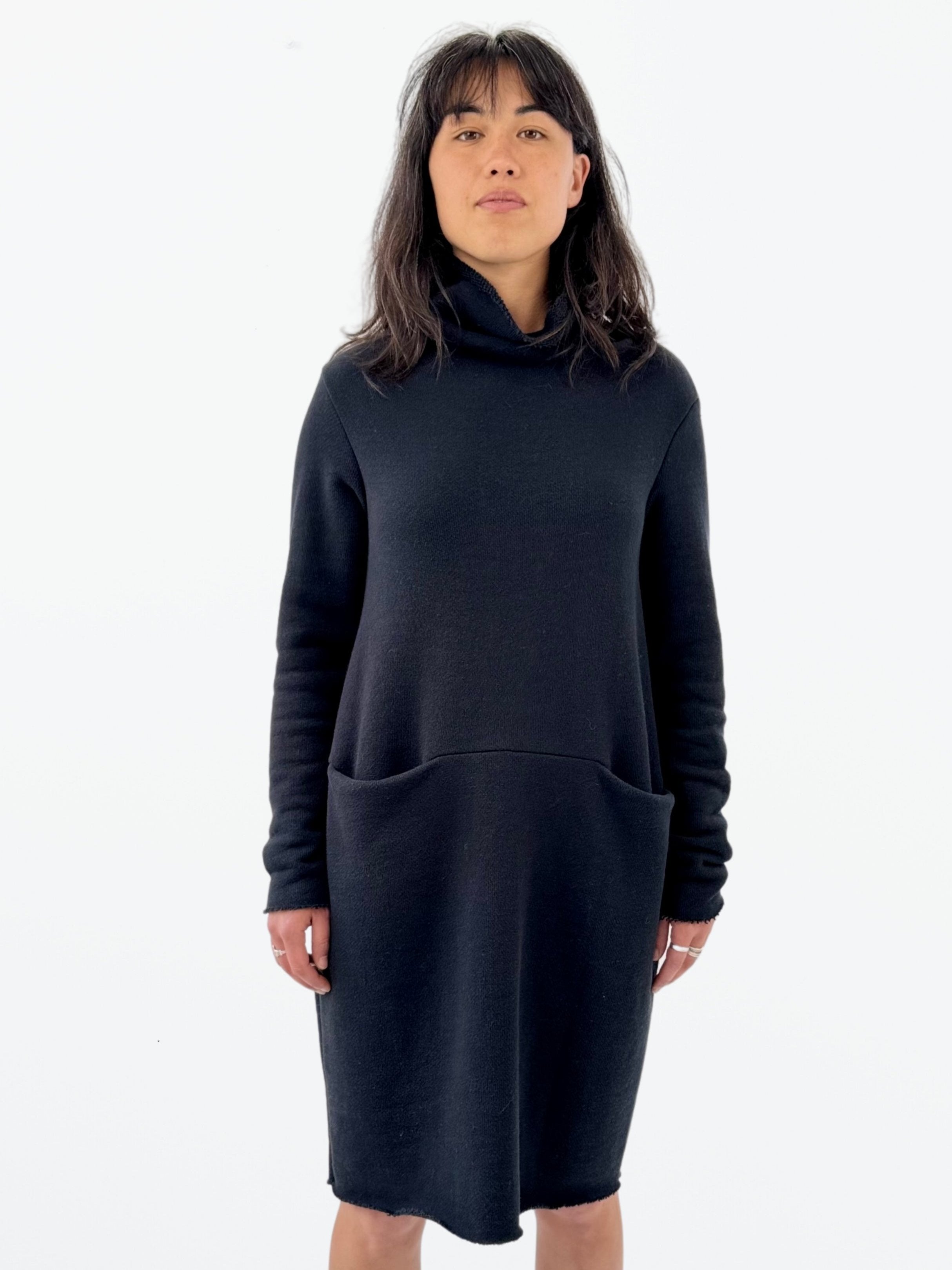 Luxuriously comfortable and figure-flattering dress featuring convenient front pockets and a cozy funnel neck. The Cordelia dress has raw edges at neck sleeves and hem. Crafted with our luxurious, large loop terry fabric.