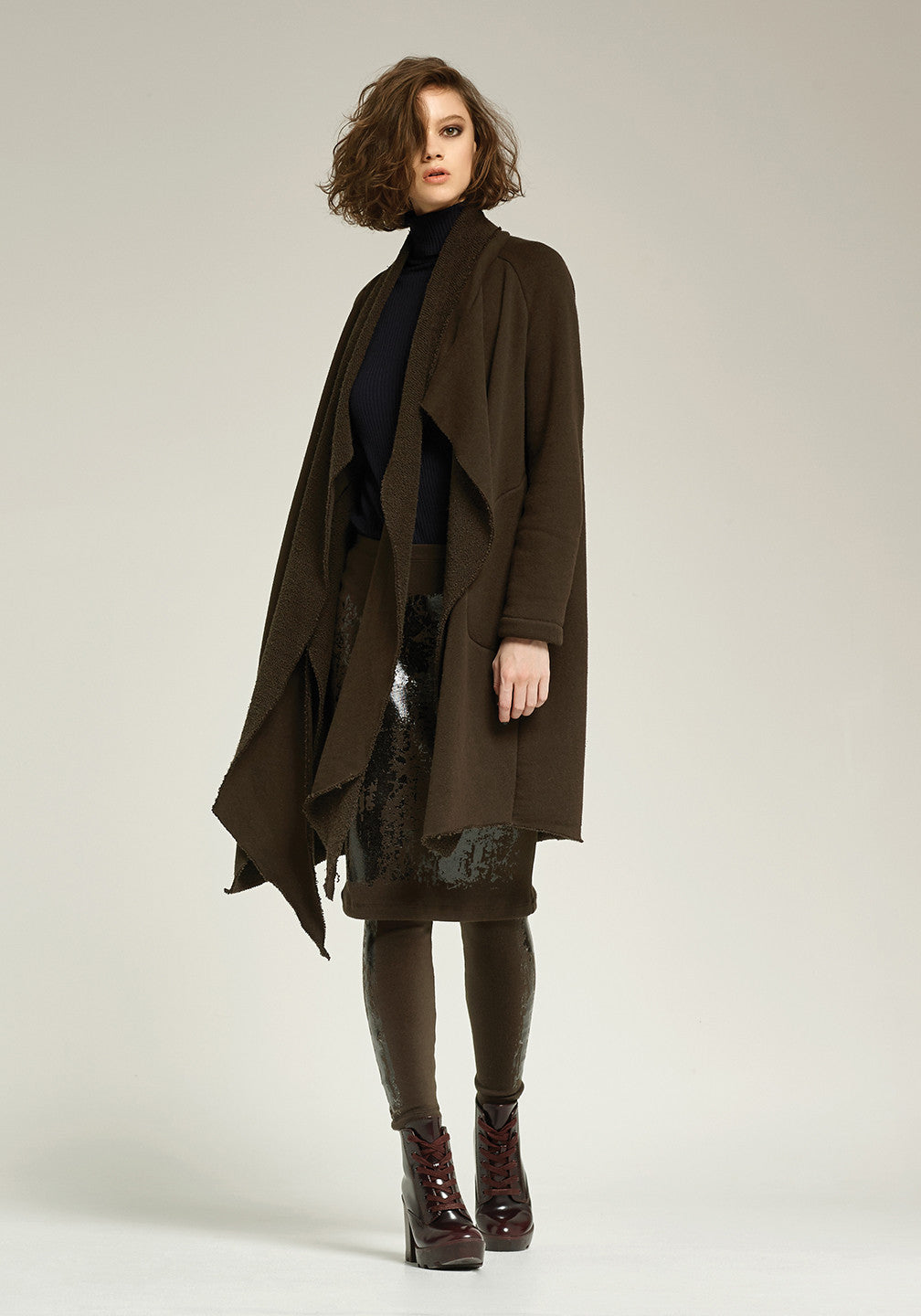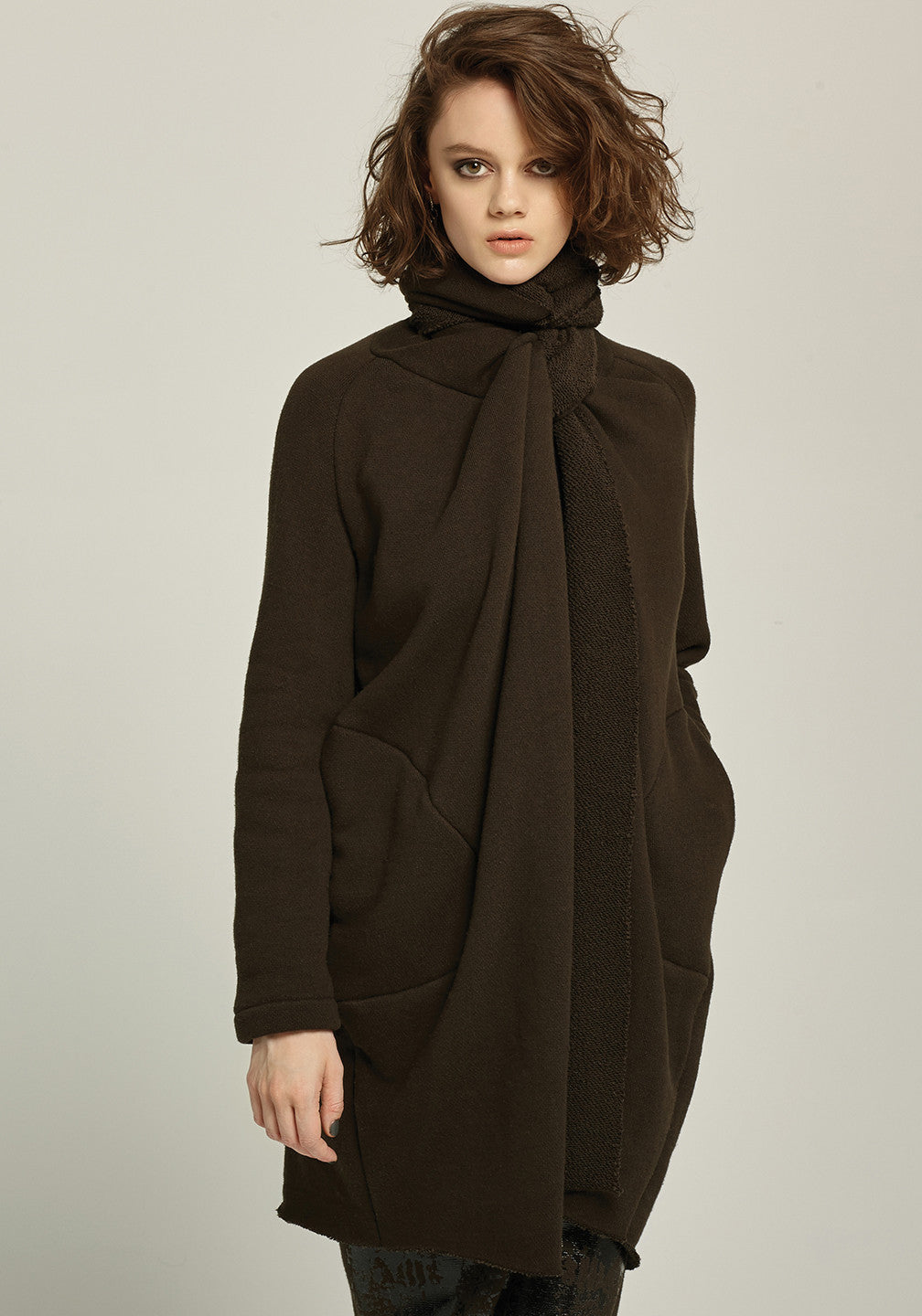 This knee length wrap jacket with side pocket closes by wrapping the attached scarf to your liking.