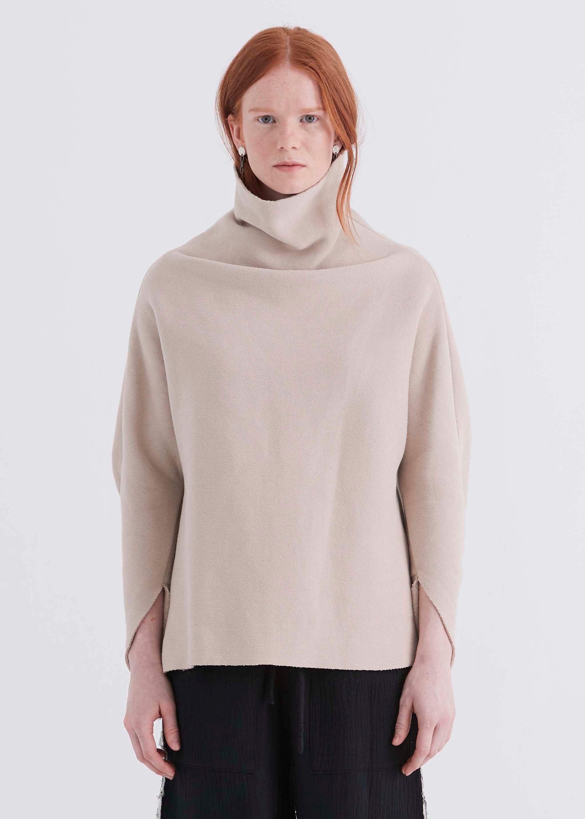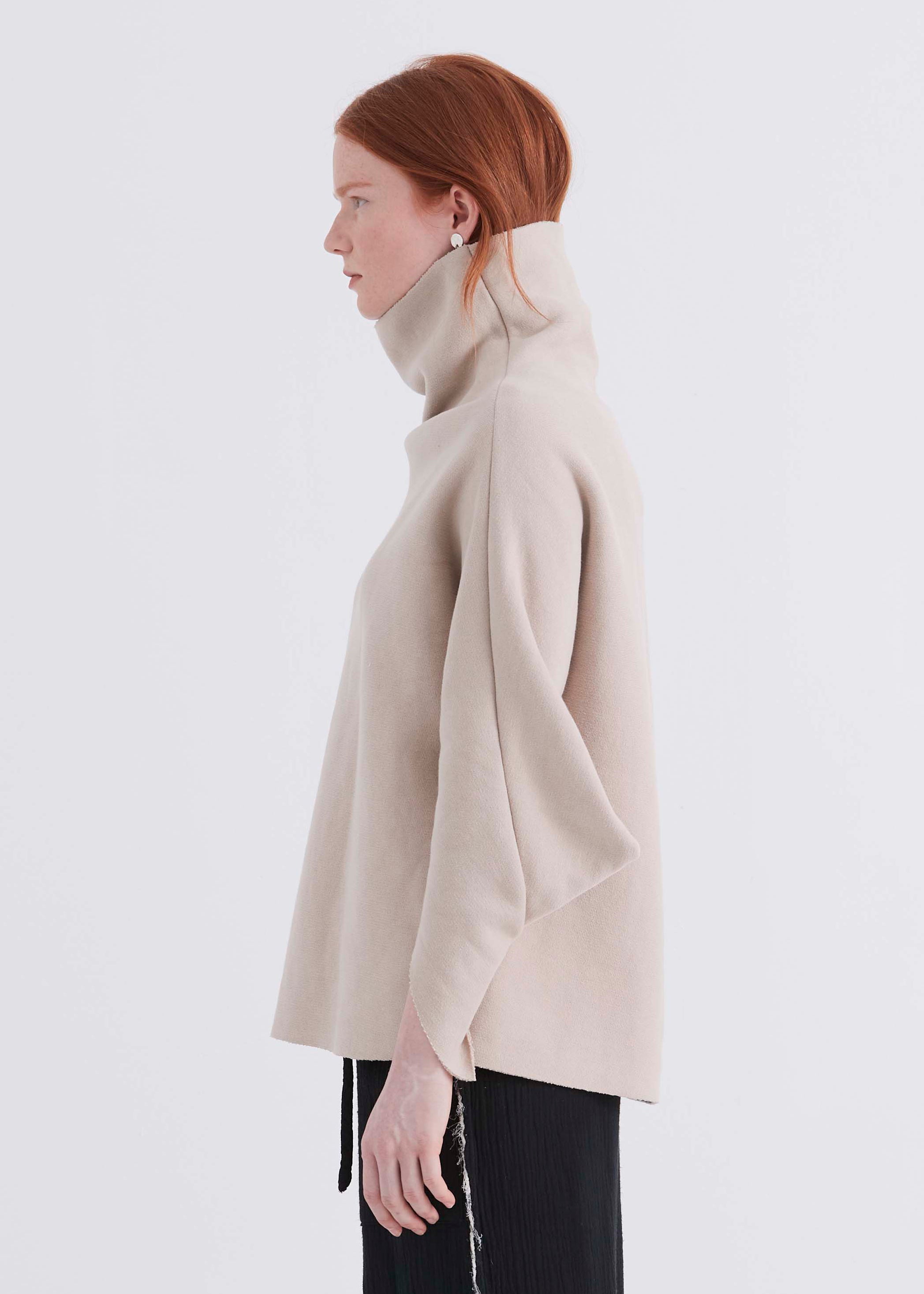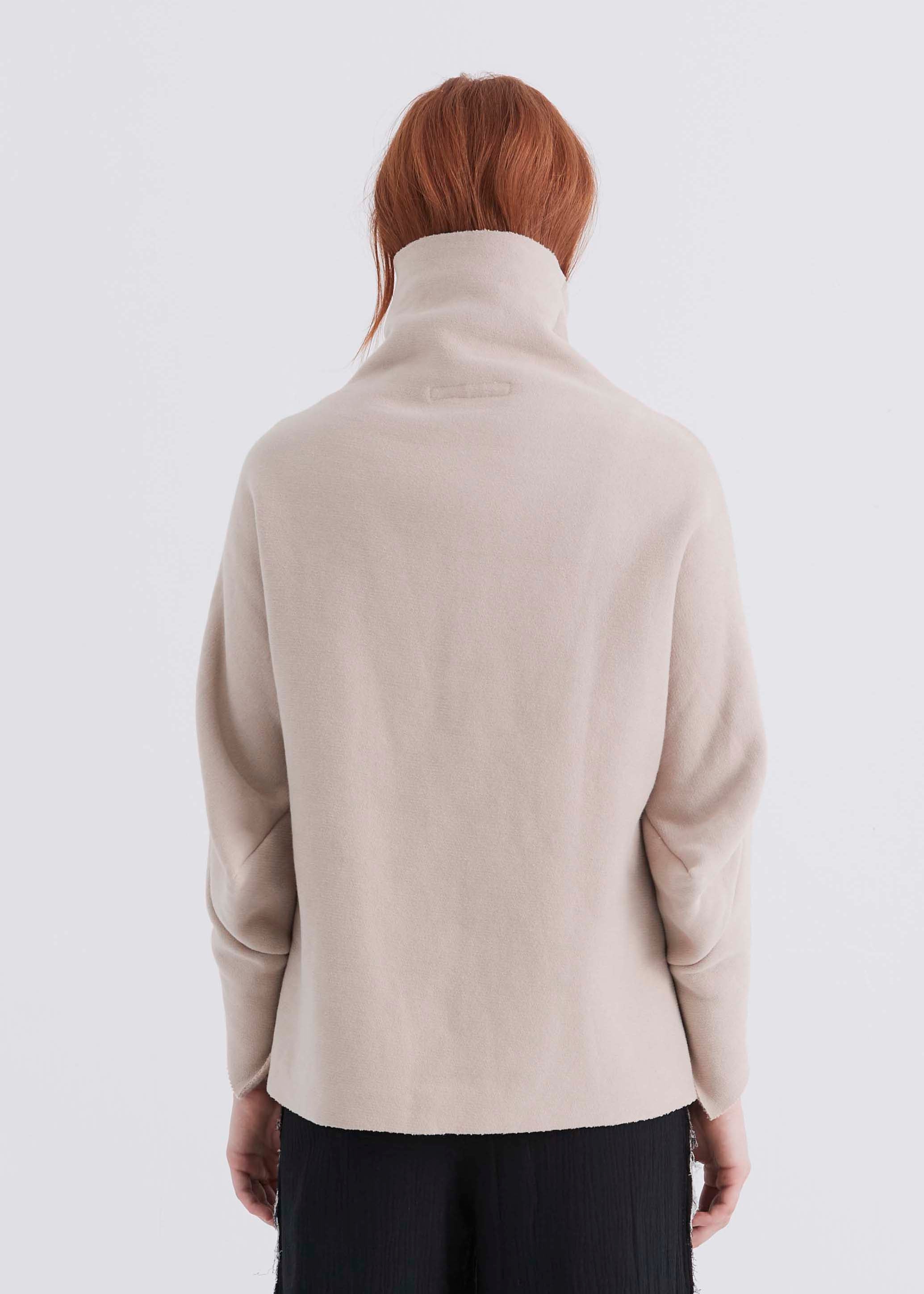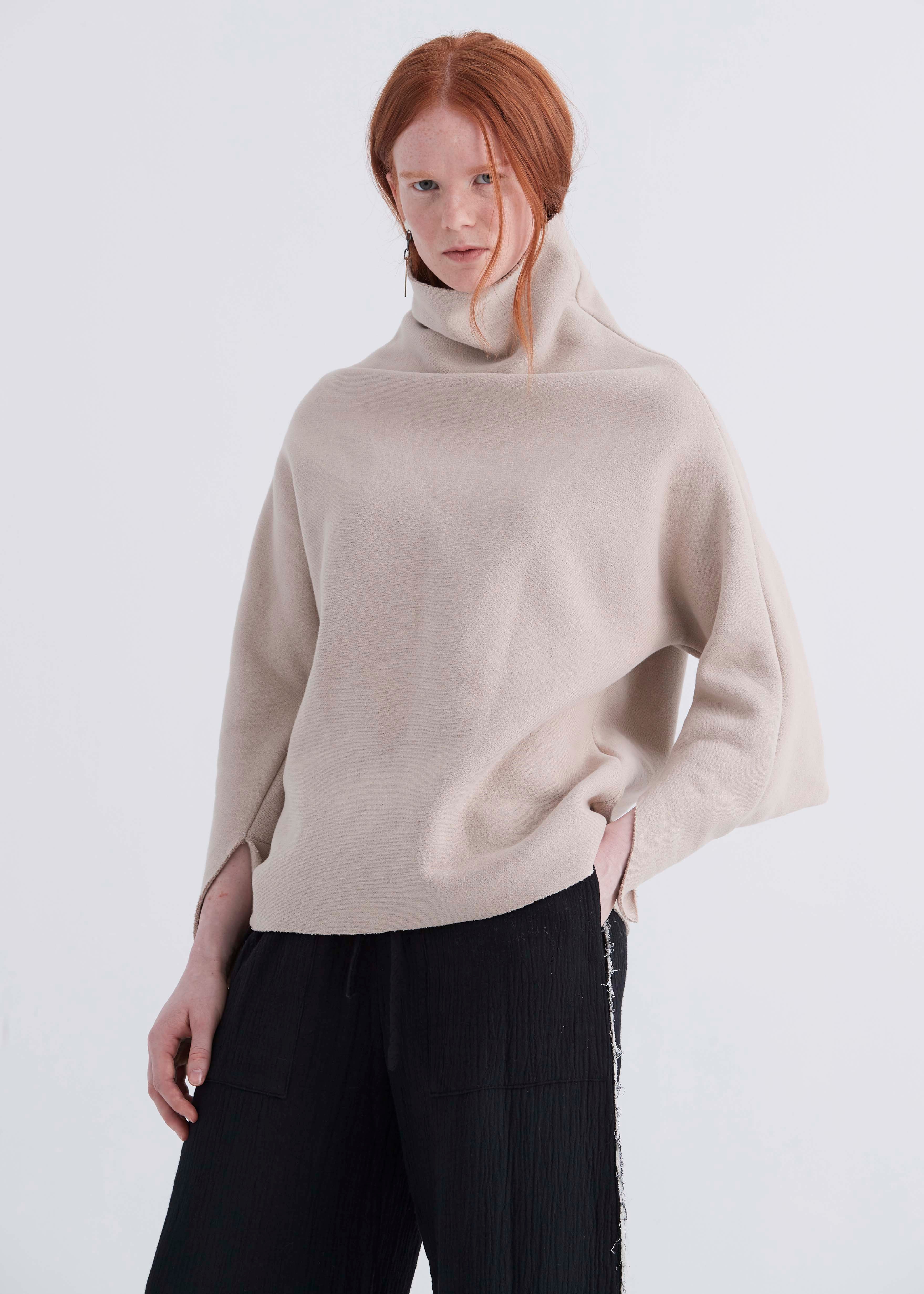 Ultra-cozy loose fit pullover with structured dolman sleeve and funnel neck and raw edges