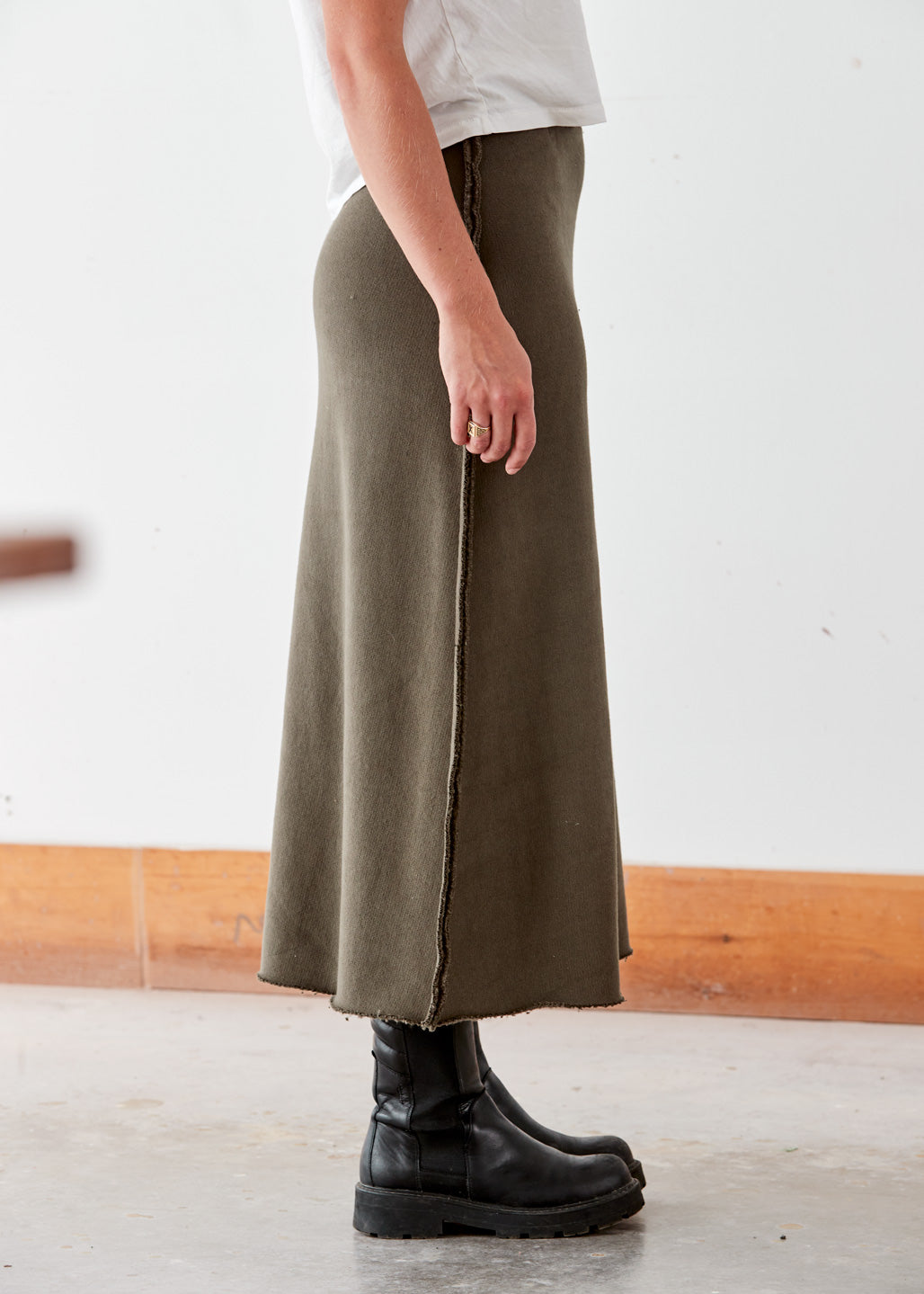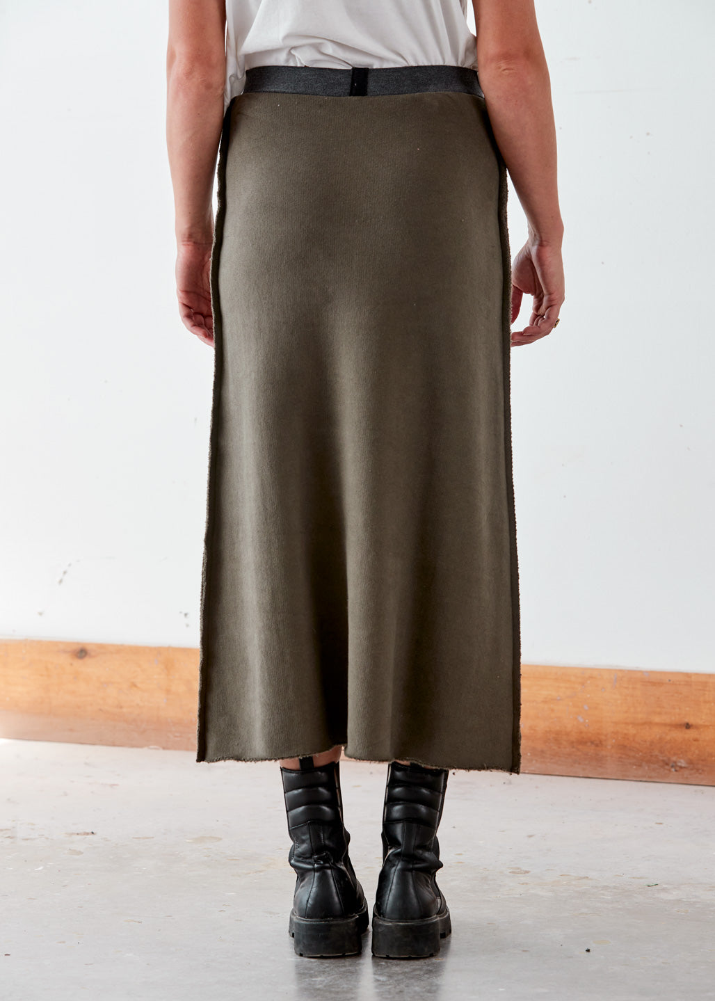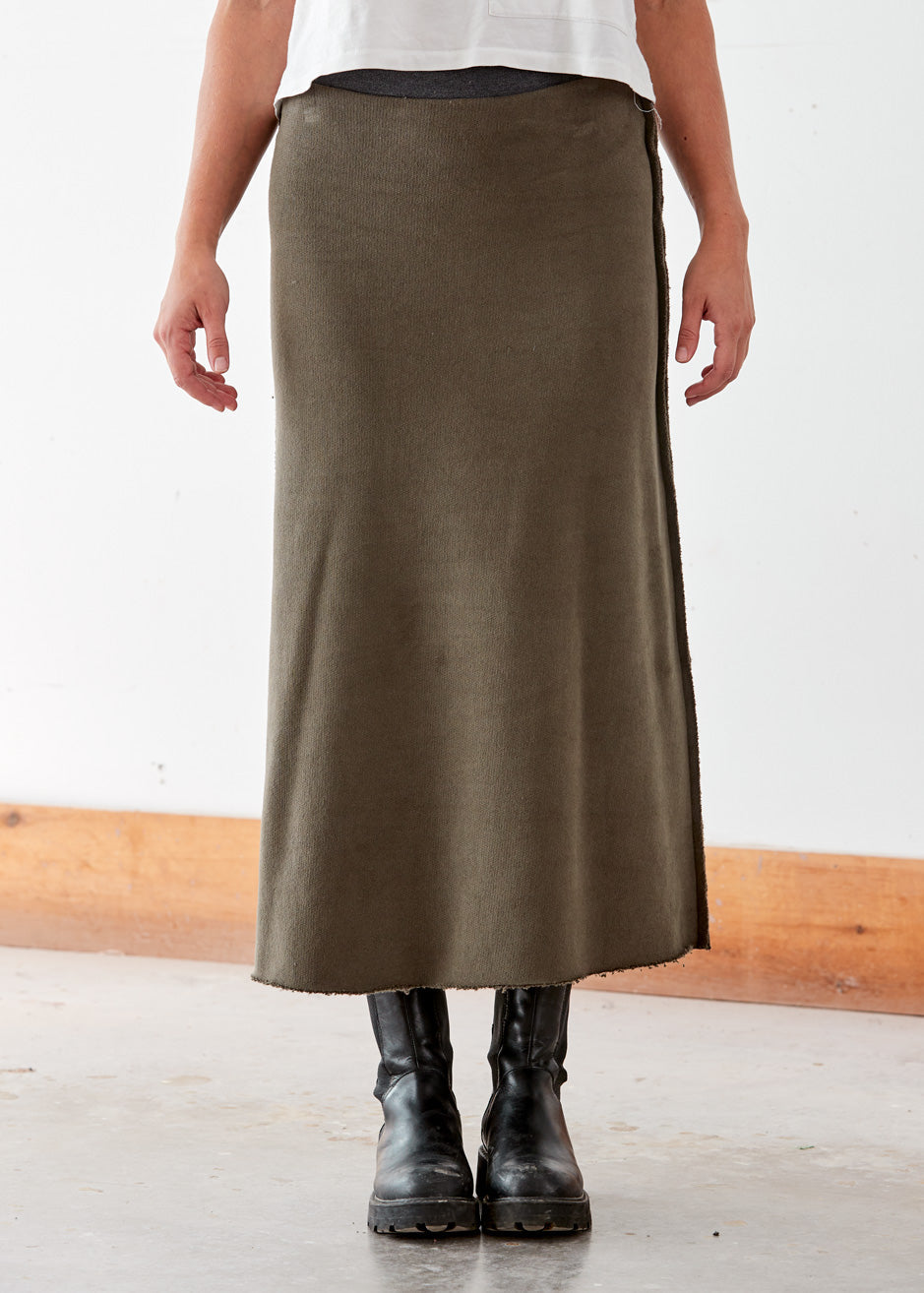 Crafted with comfort in mind, this practical long skirt provides a flattering silhouette with raw edge seams down each side, an elastic waistband, and a raw edge at the hemline.