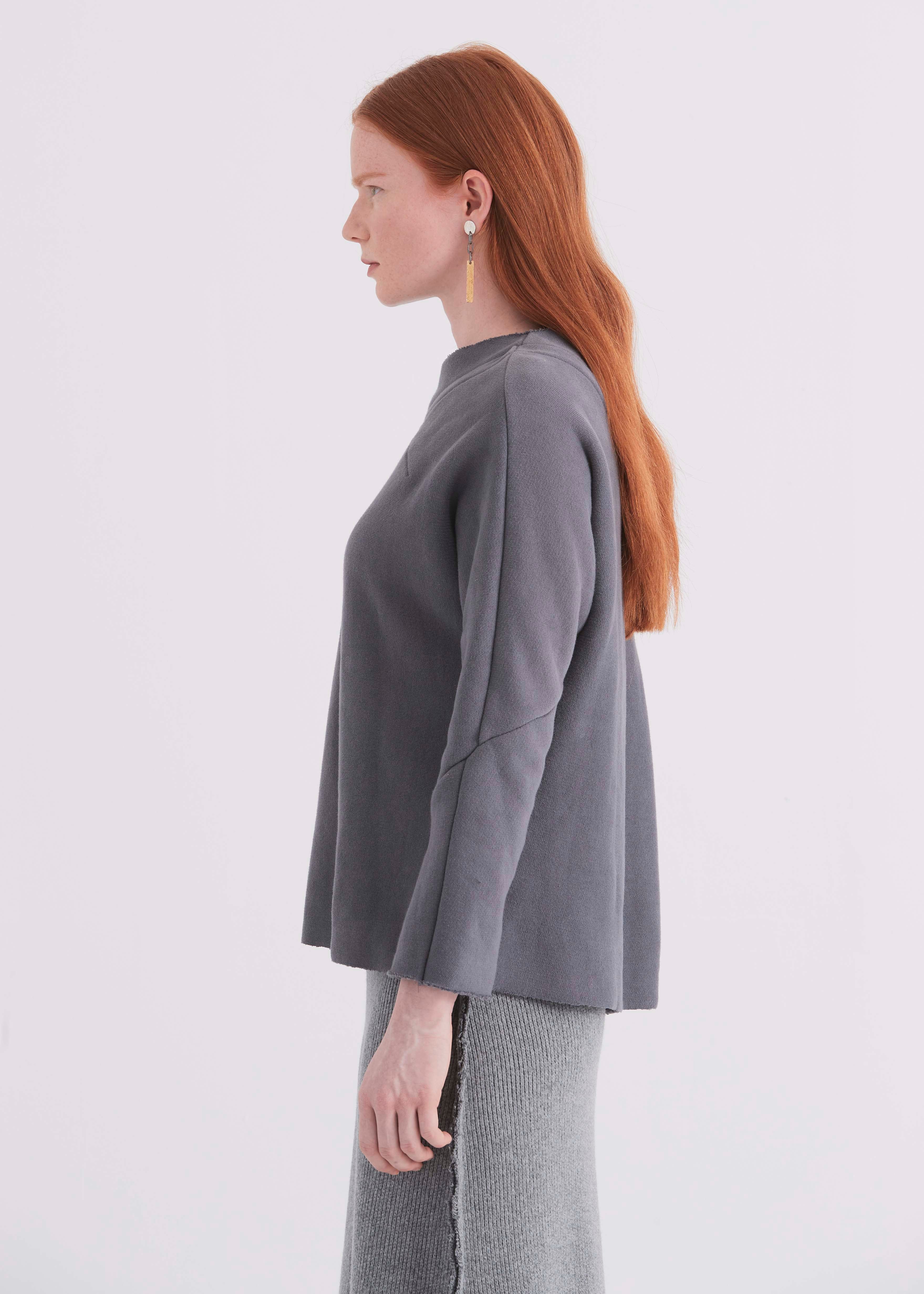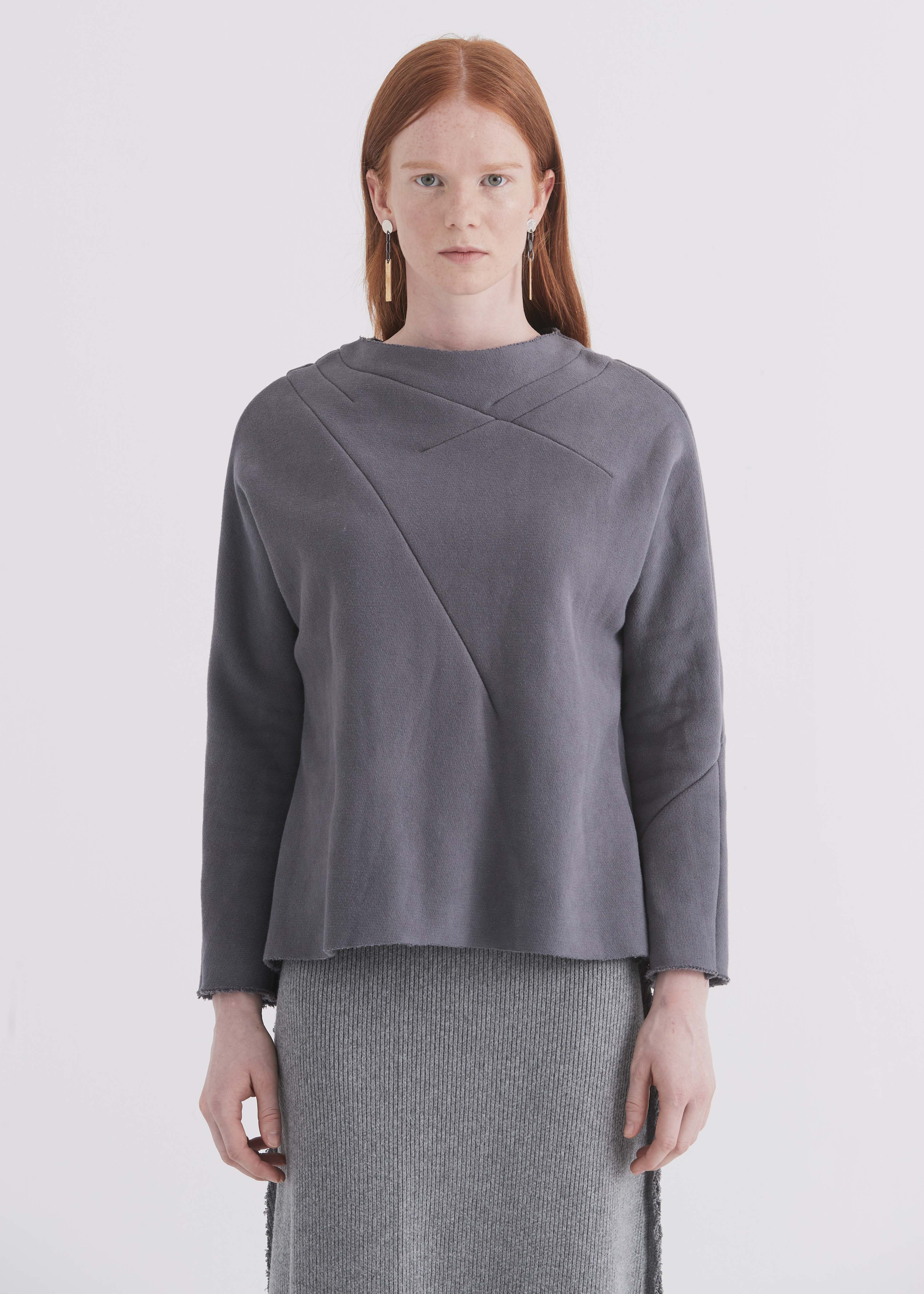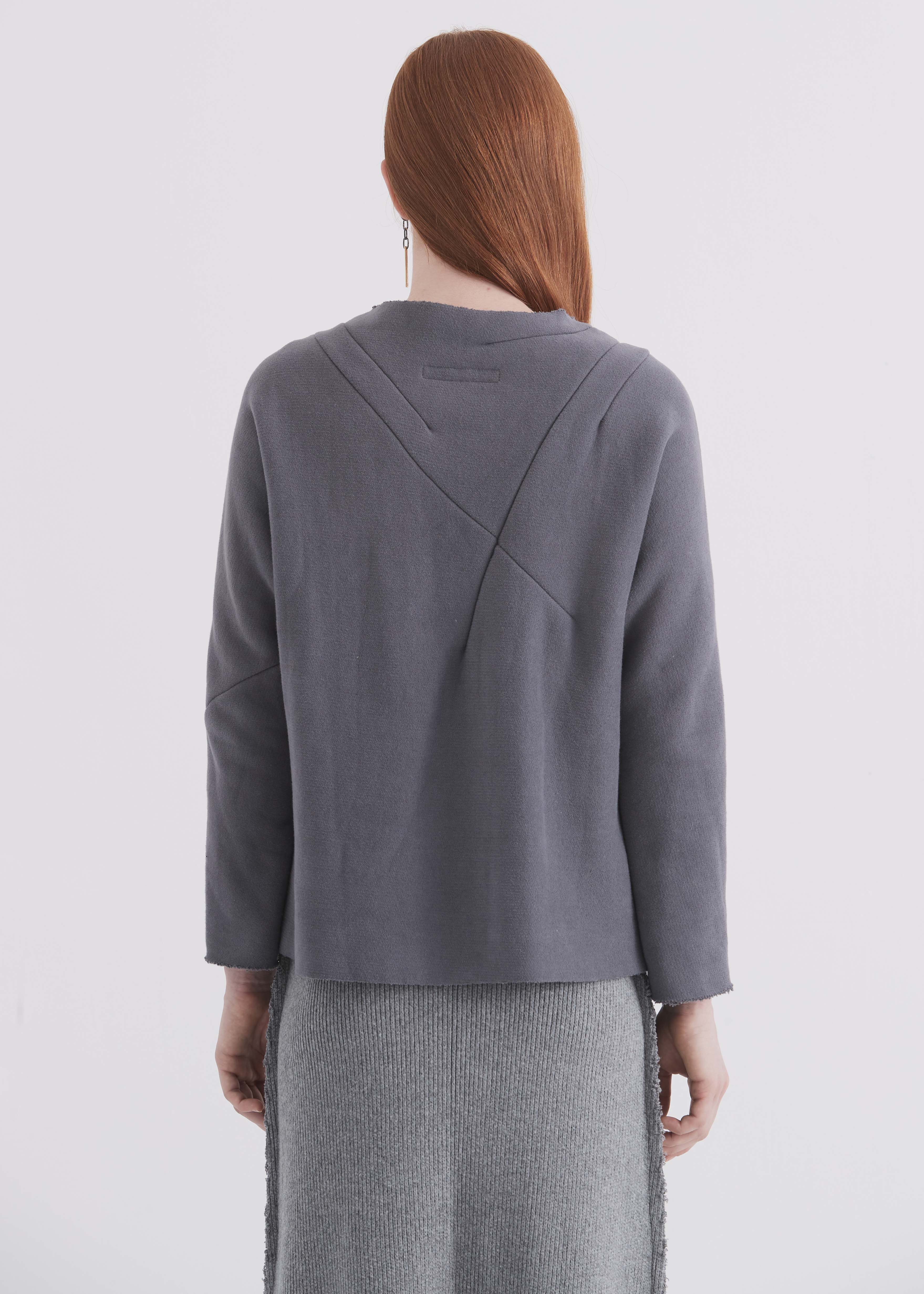 Ultra-cozy loose fit pullover featuring crew neck, random detailed seaming and raw edges