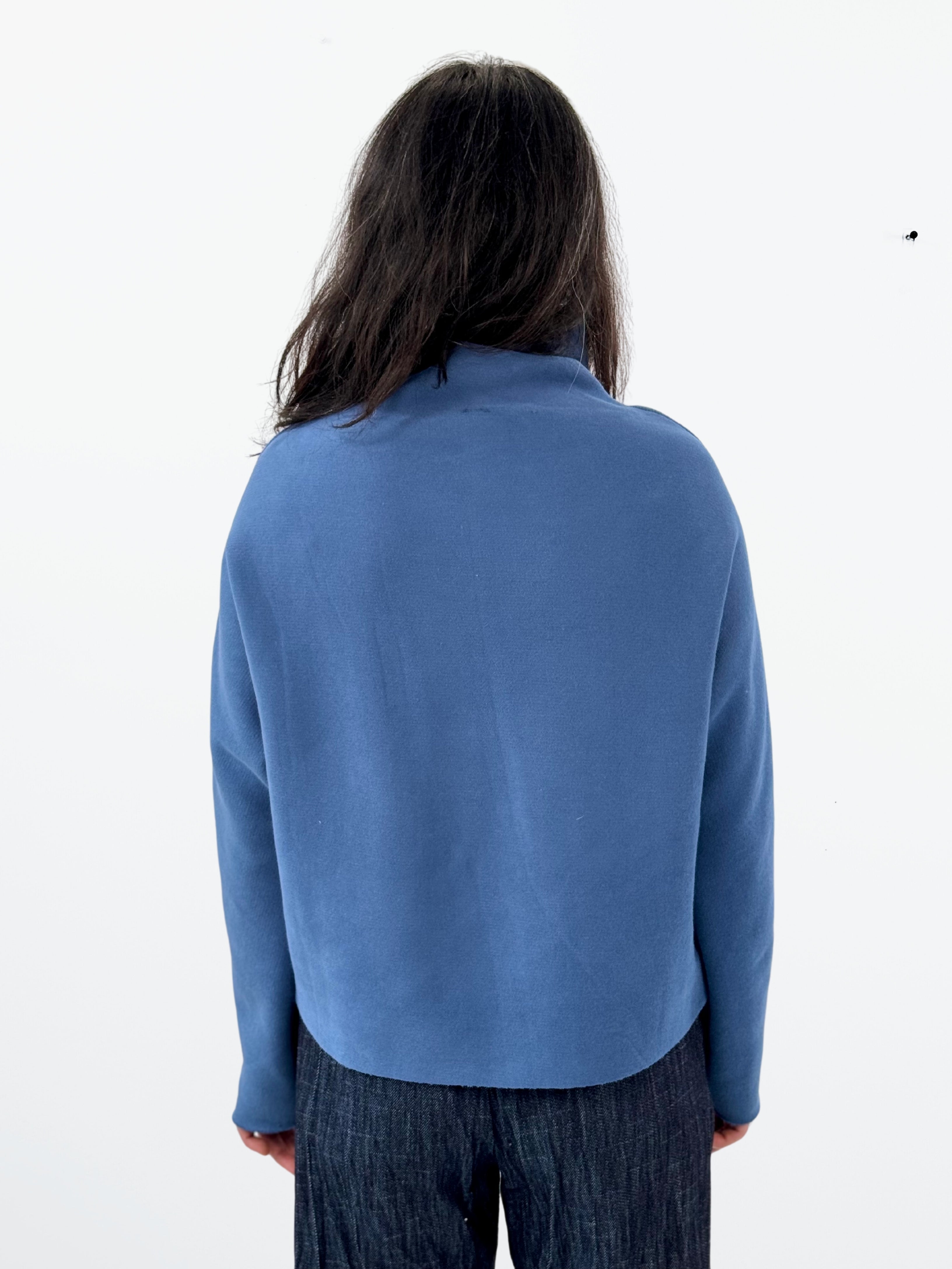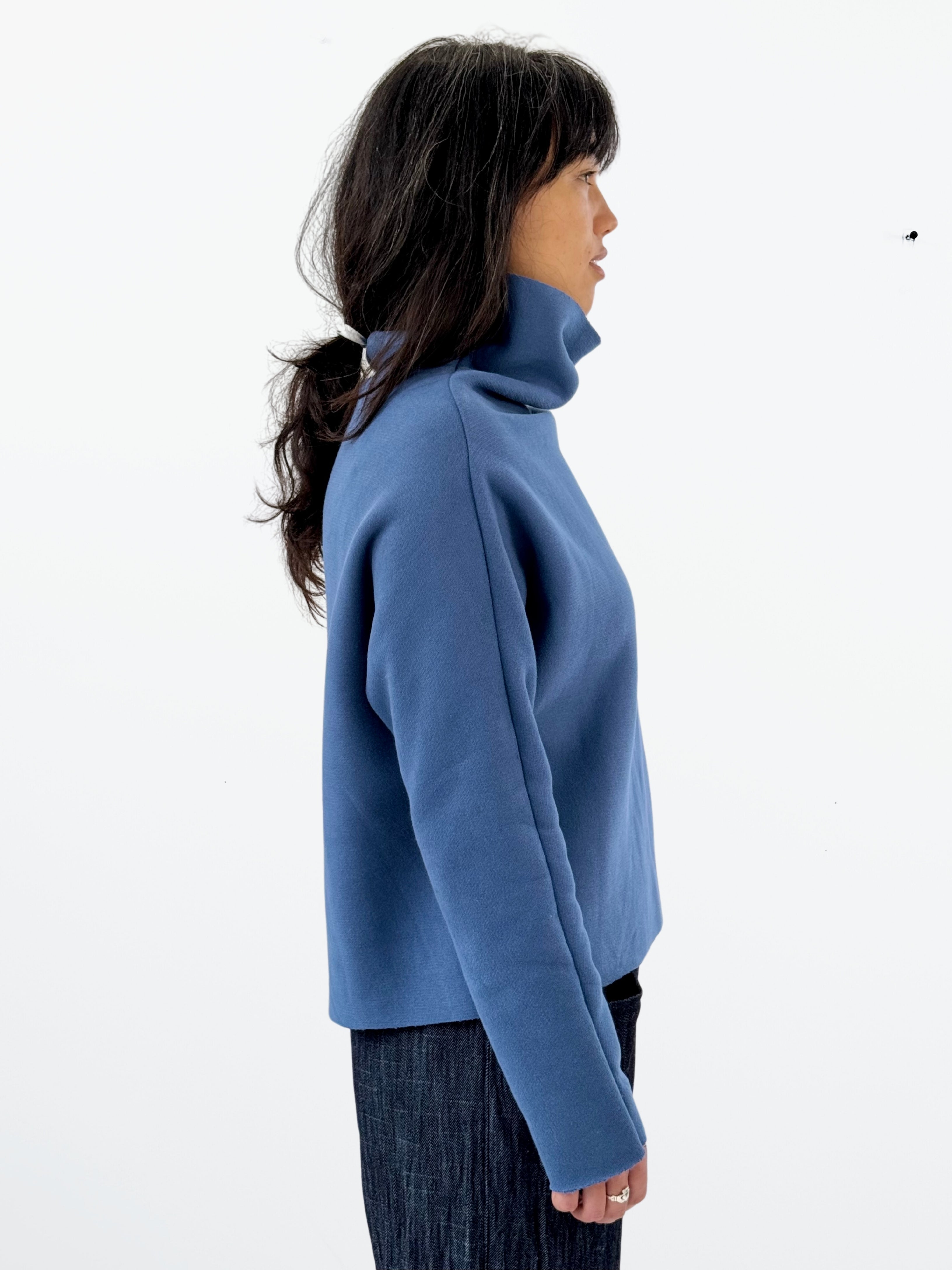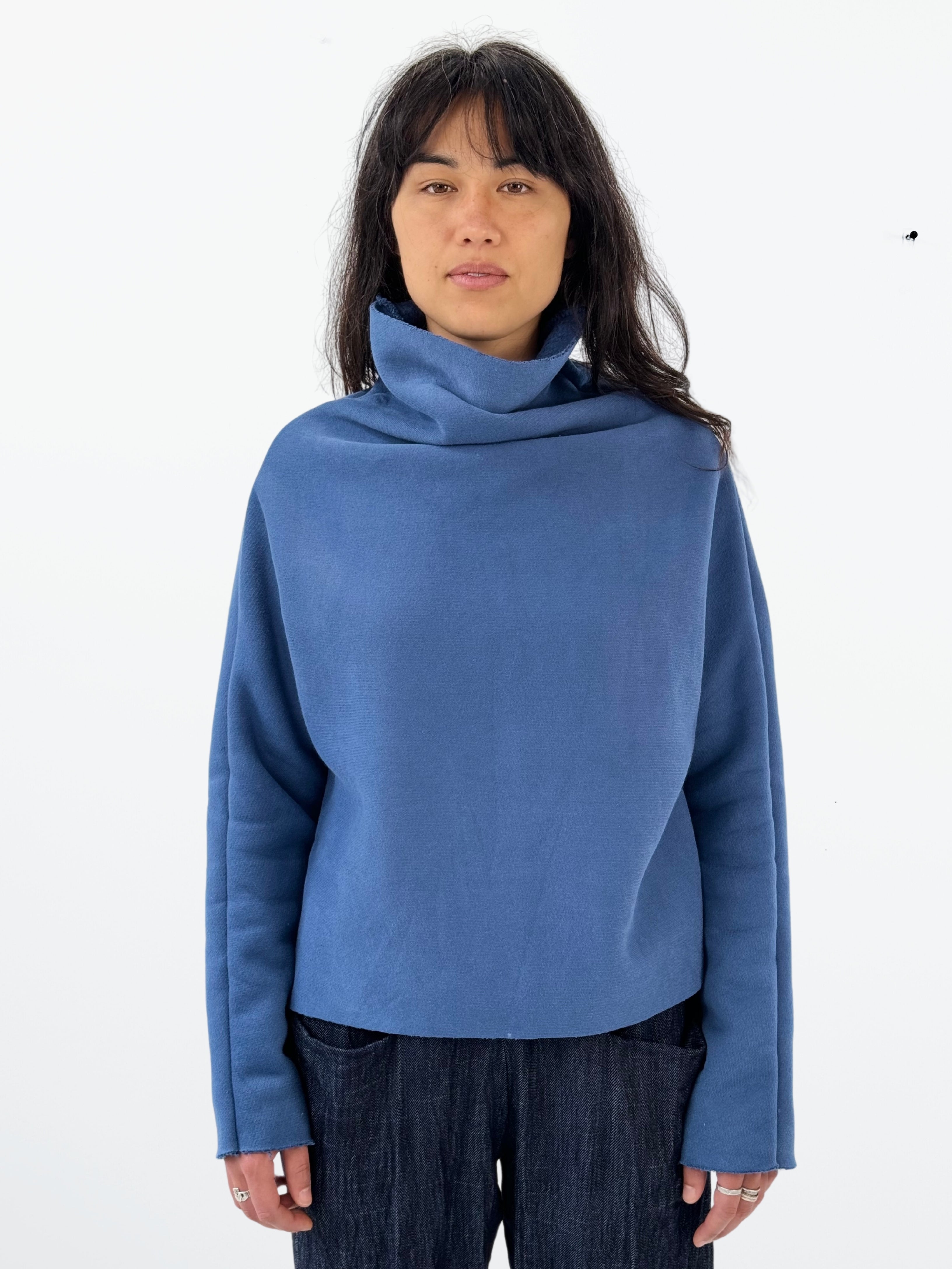 Ultra-cozy loose fit pullover with structured dolman sleeve, funnel neck and raw edge at neck sleeve and hem. Crafted in our luxurious velvet fleece
