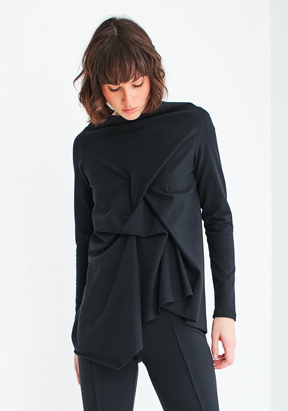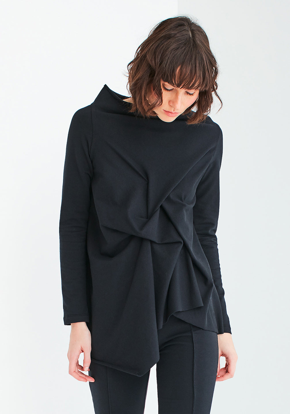 Boat neck fleece top with front pleating and raw edge at neck and hemline