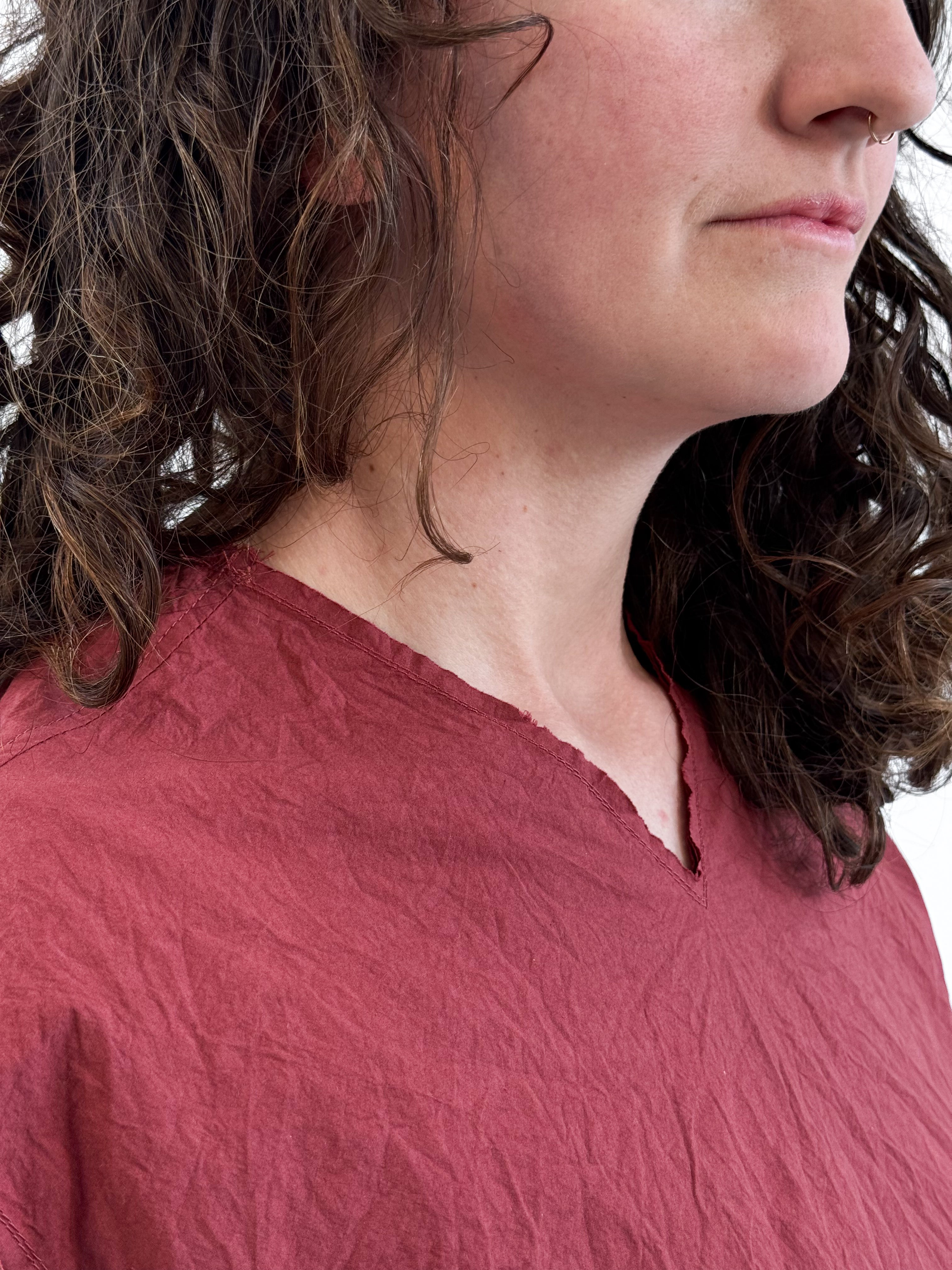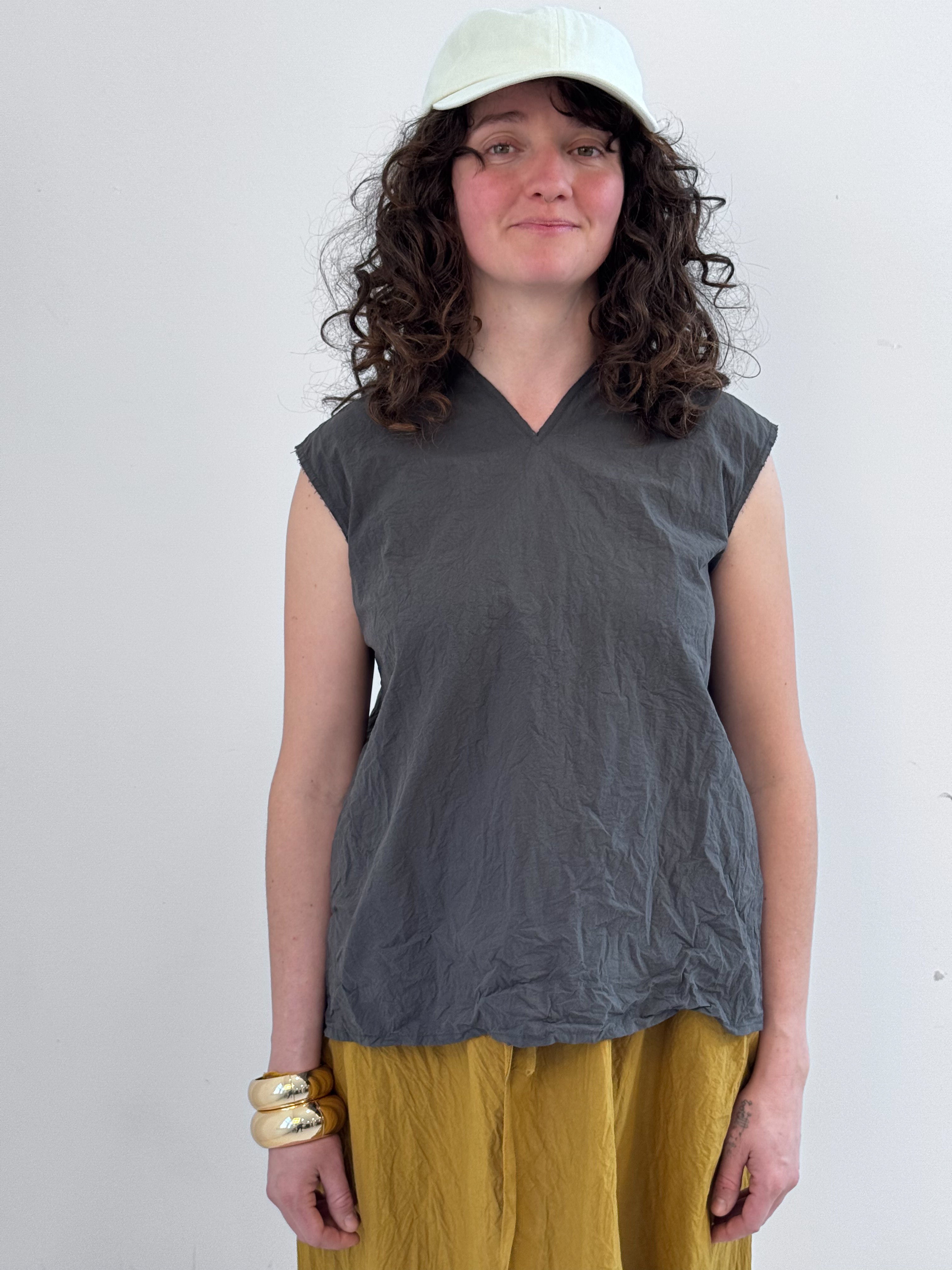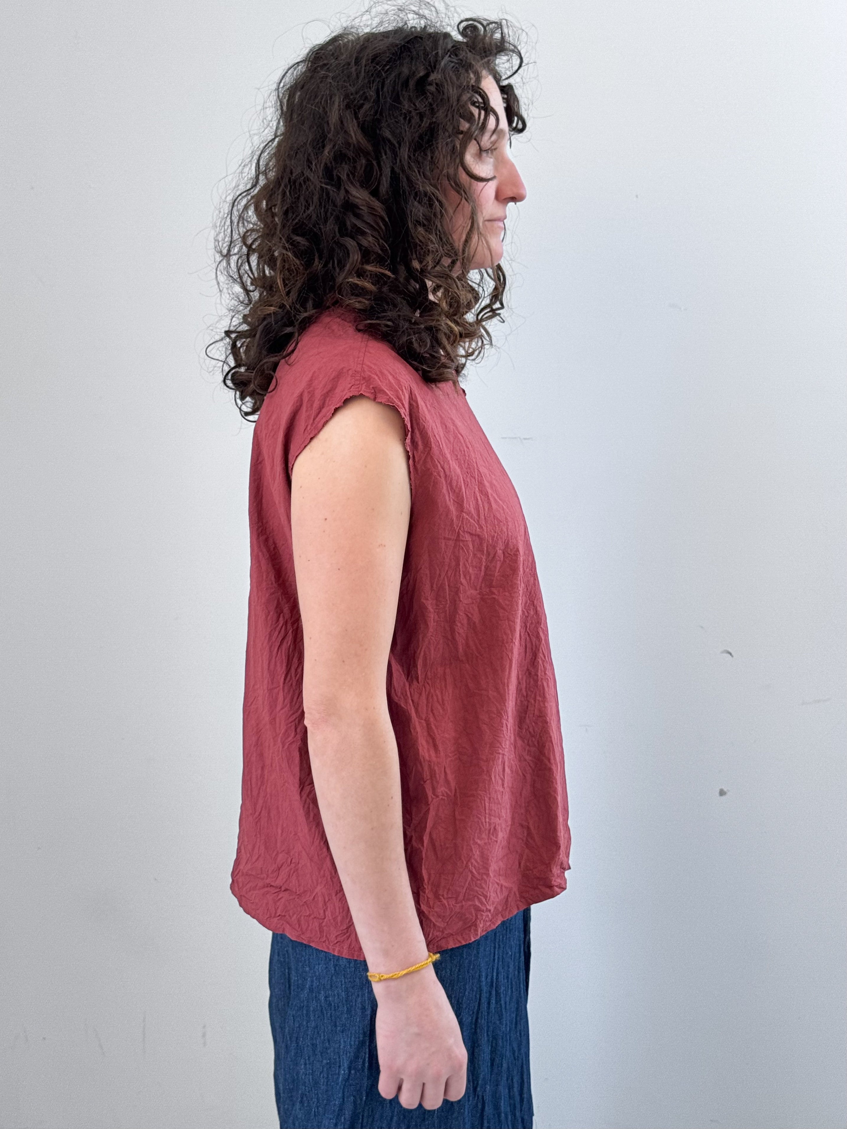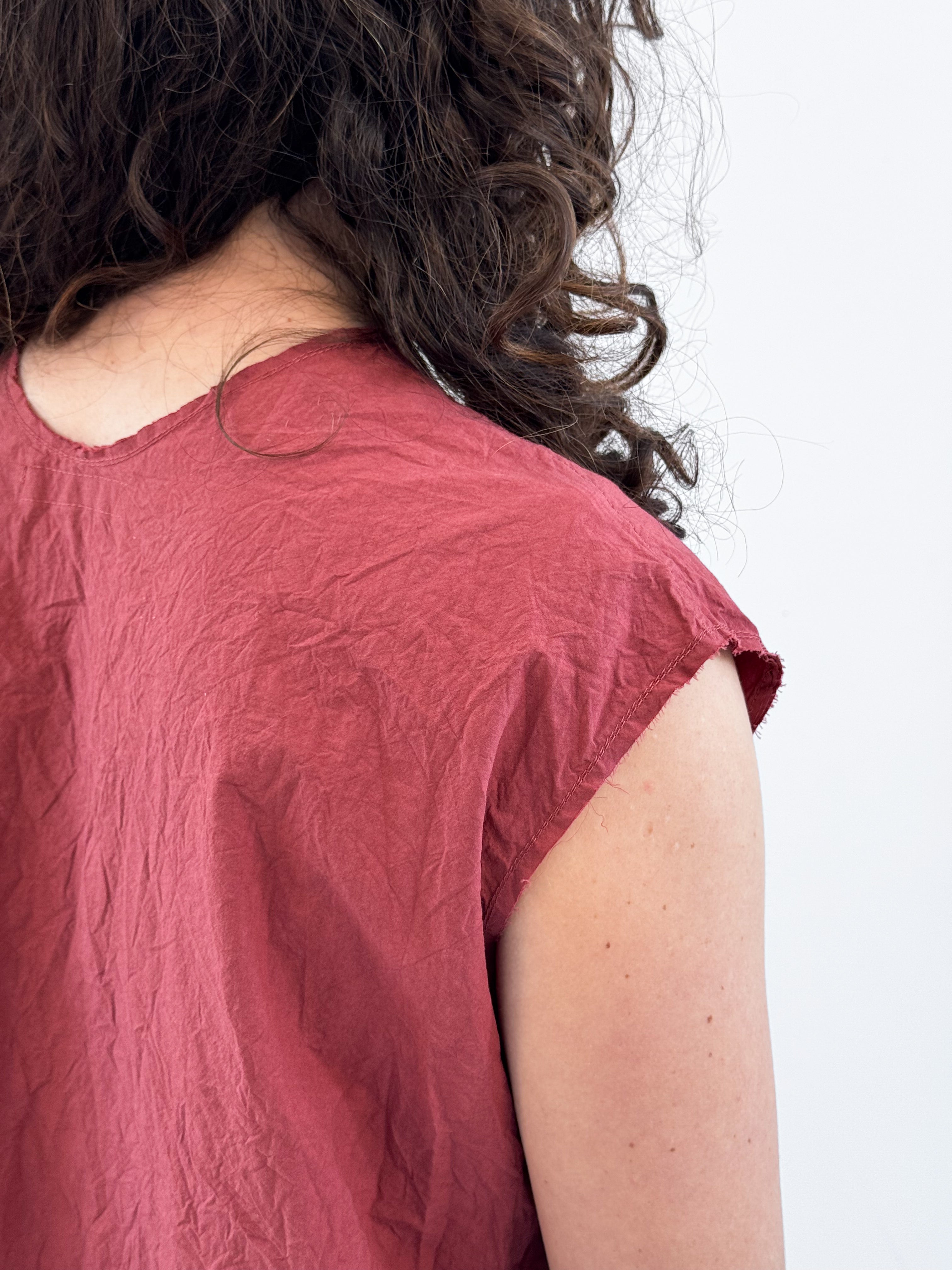 Upgrade your wardrobe with EDEN, an easy pre-washed top crafted from crisp paper cotton. Featuring an edgy high V-neck with raw edge at neck and sleeves