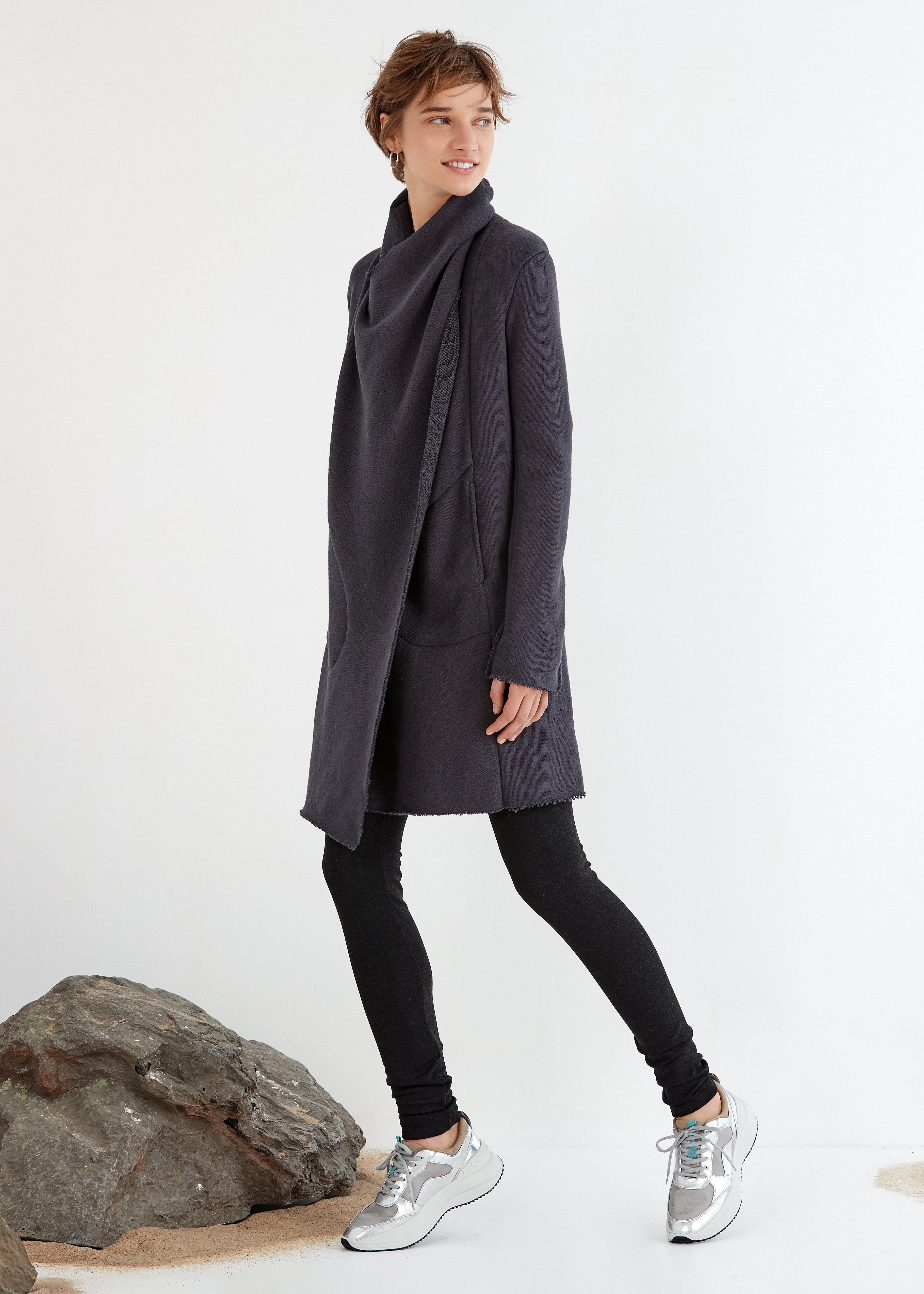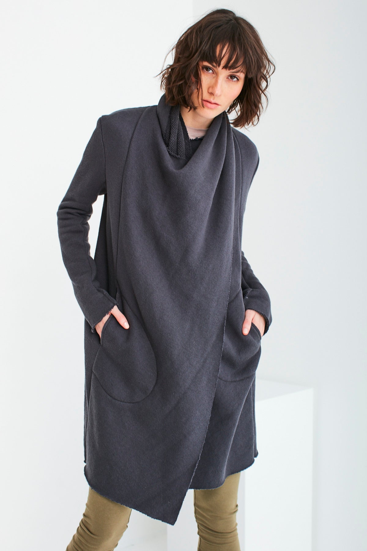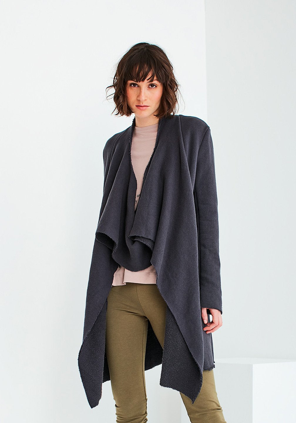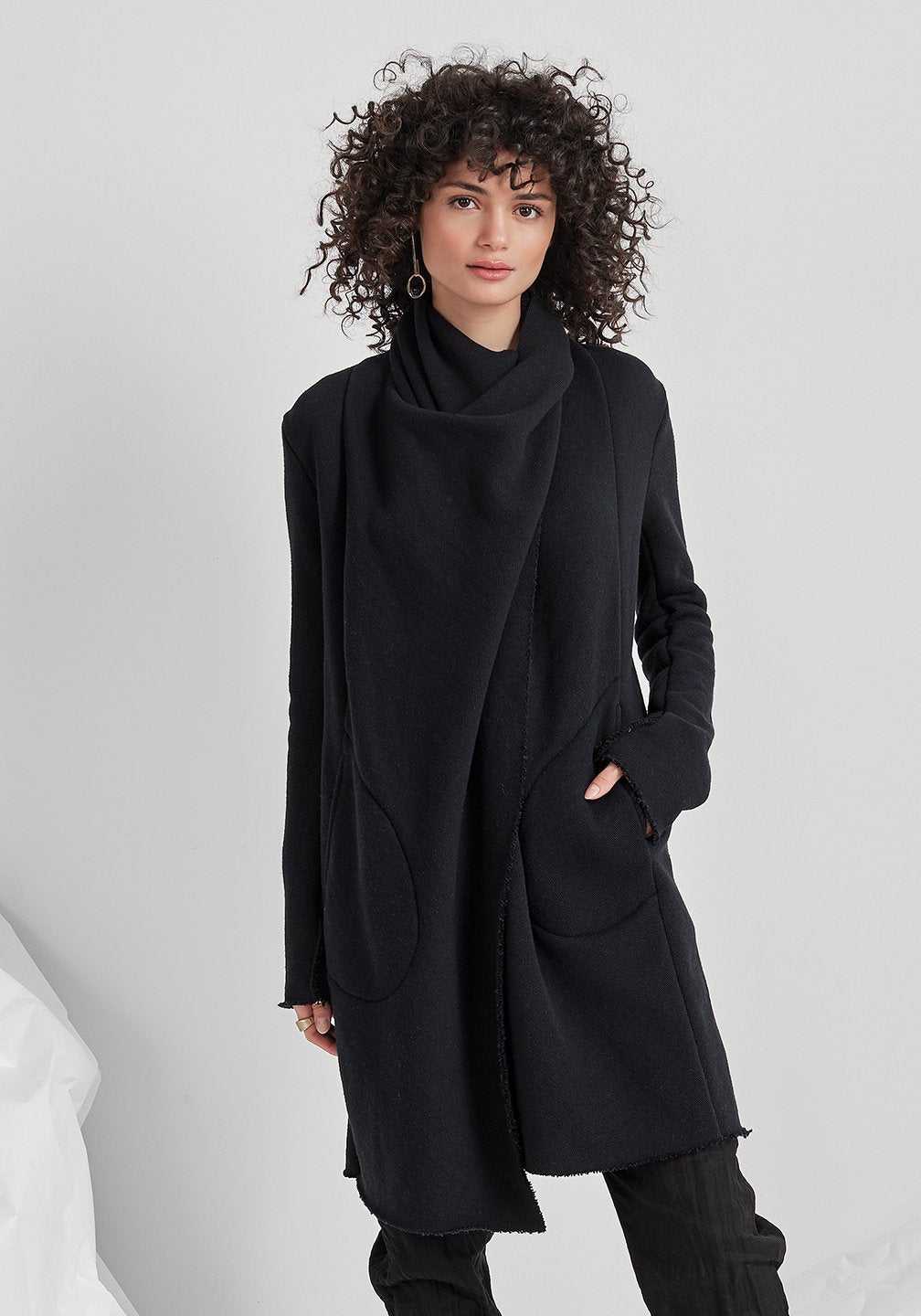 Our most popular style! 4 Jackets in 1! This fun wrap jacket can be worn 4 different ways! Drape the scarf around your neck, behind your head or simply leave it hanging. It's up to you to figure out the fourth way! Montana has a raw edge along the front, scarf, hem and sleeves.