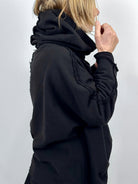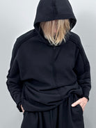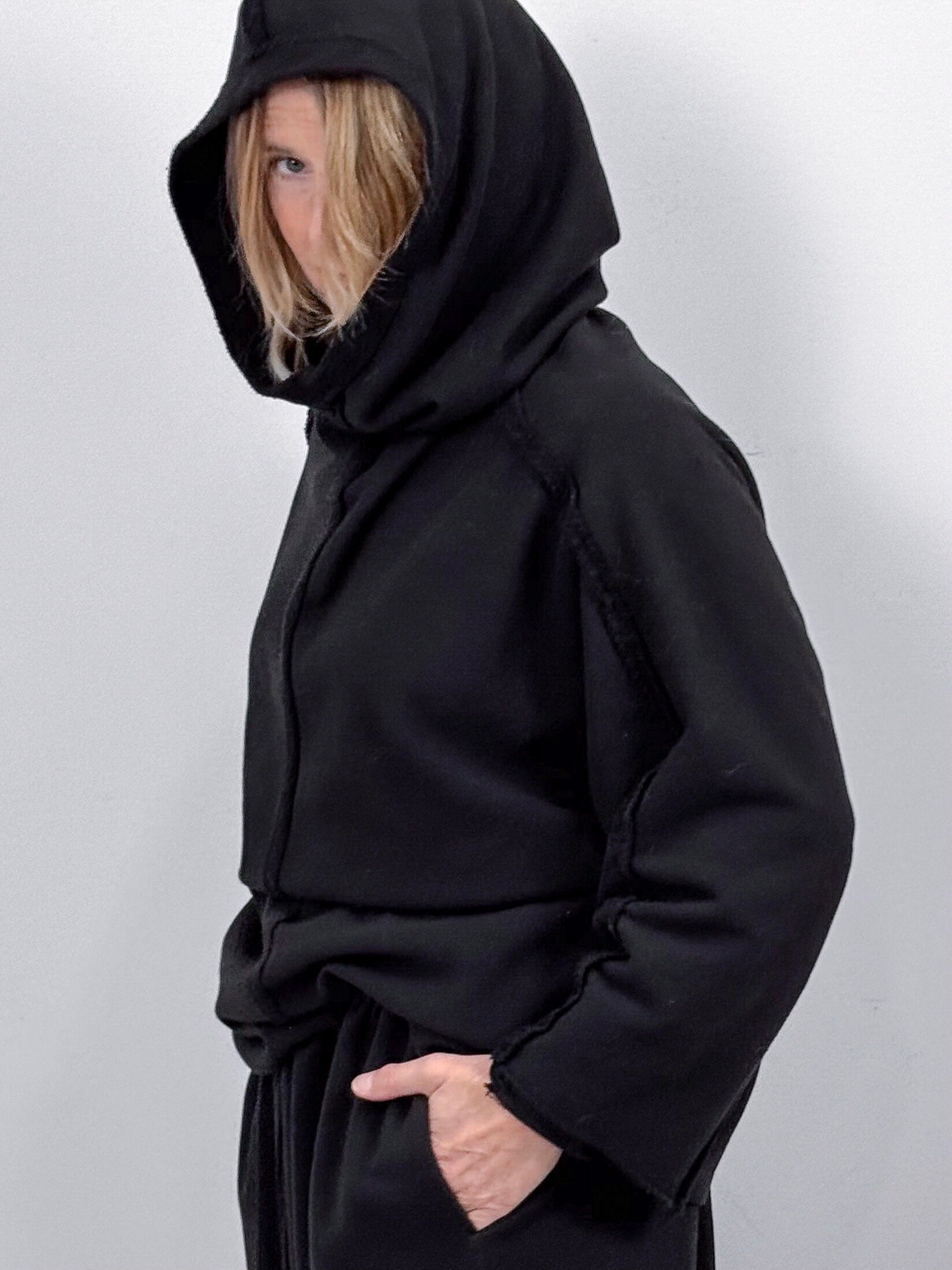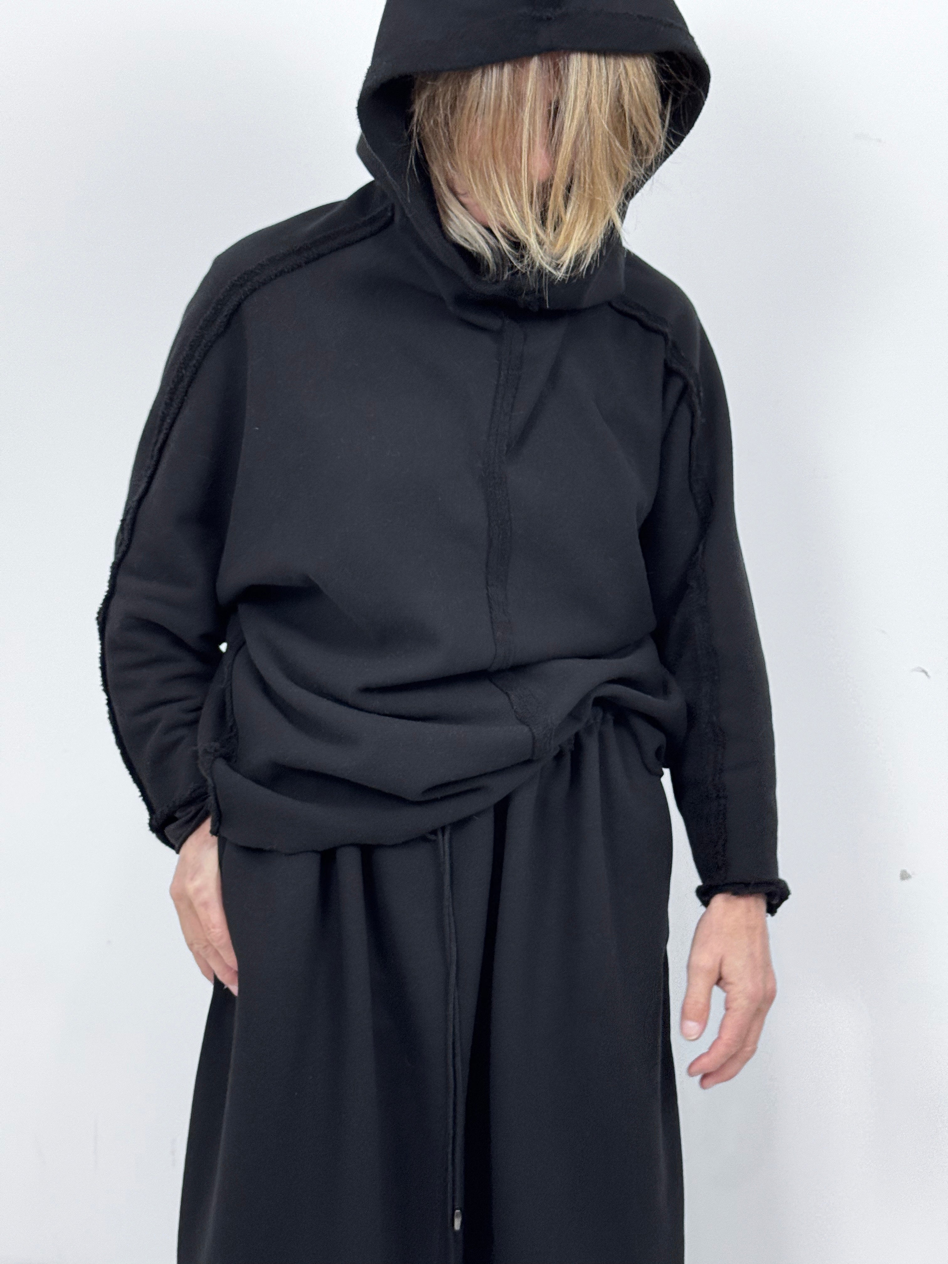 A modern, minimalist pullover crafted in thick cotton fleece for warmth, structure, and comfort. This relaxed silhouette features a soft funnel neck, generous hood, and dolman sleeves for an effortlessly oversized fit. Raw exposed seams along the sleeves, front, and side panels add subtle detailing, while the raw hem keeps the look clean and contemporary.