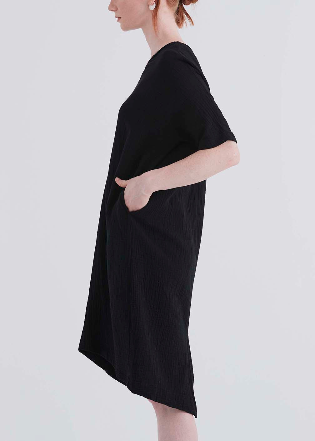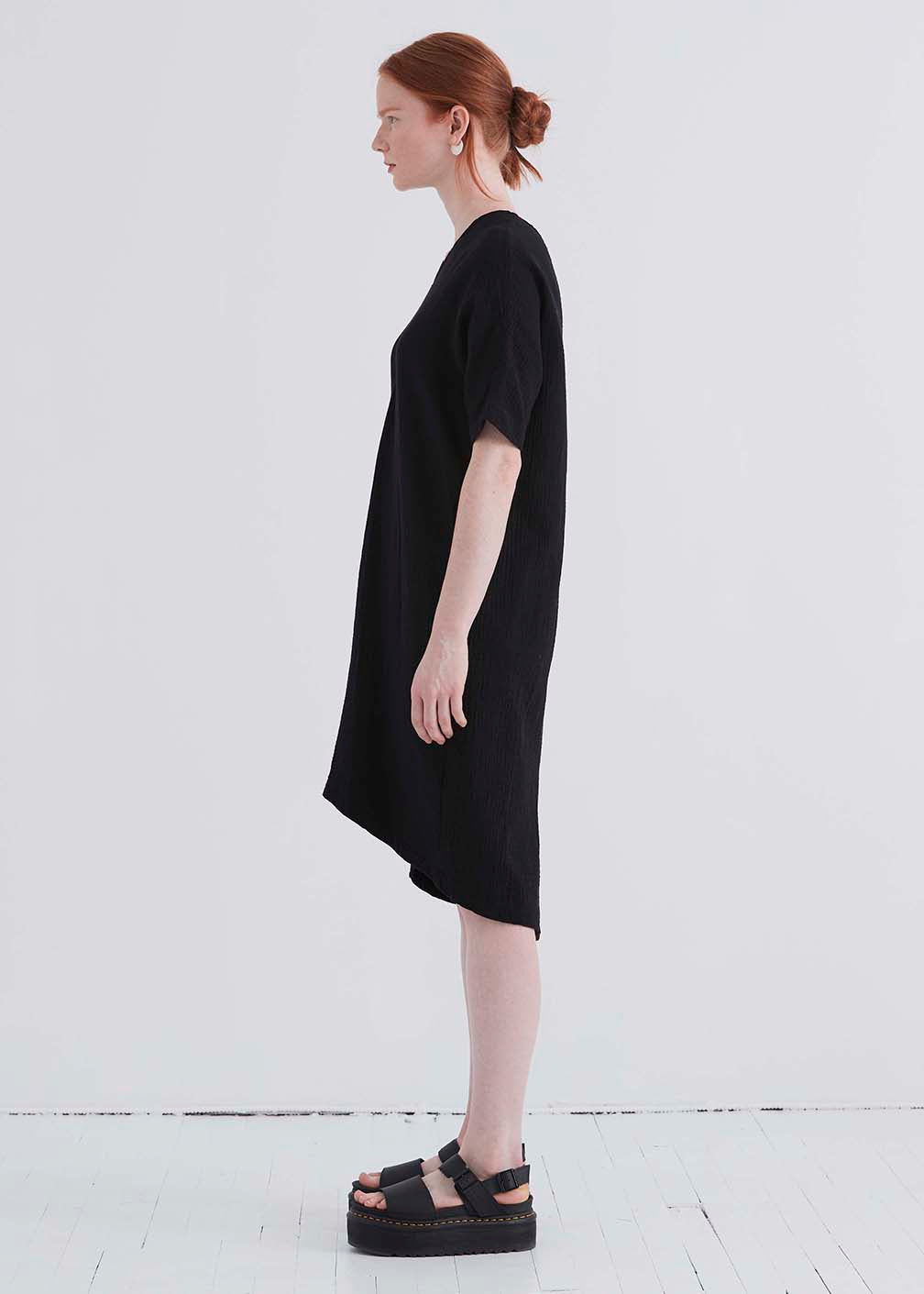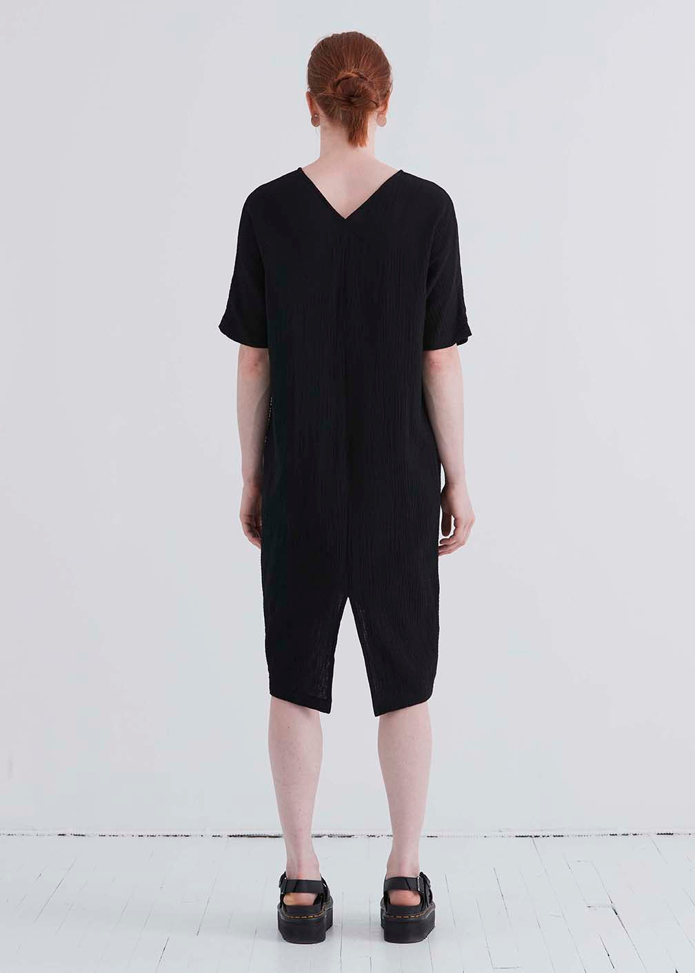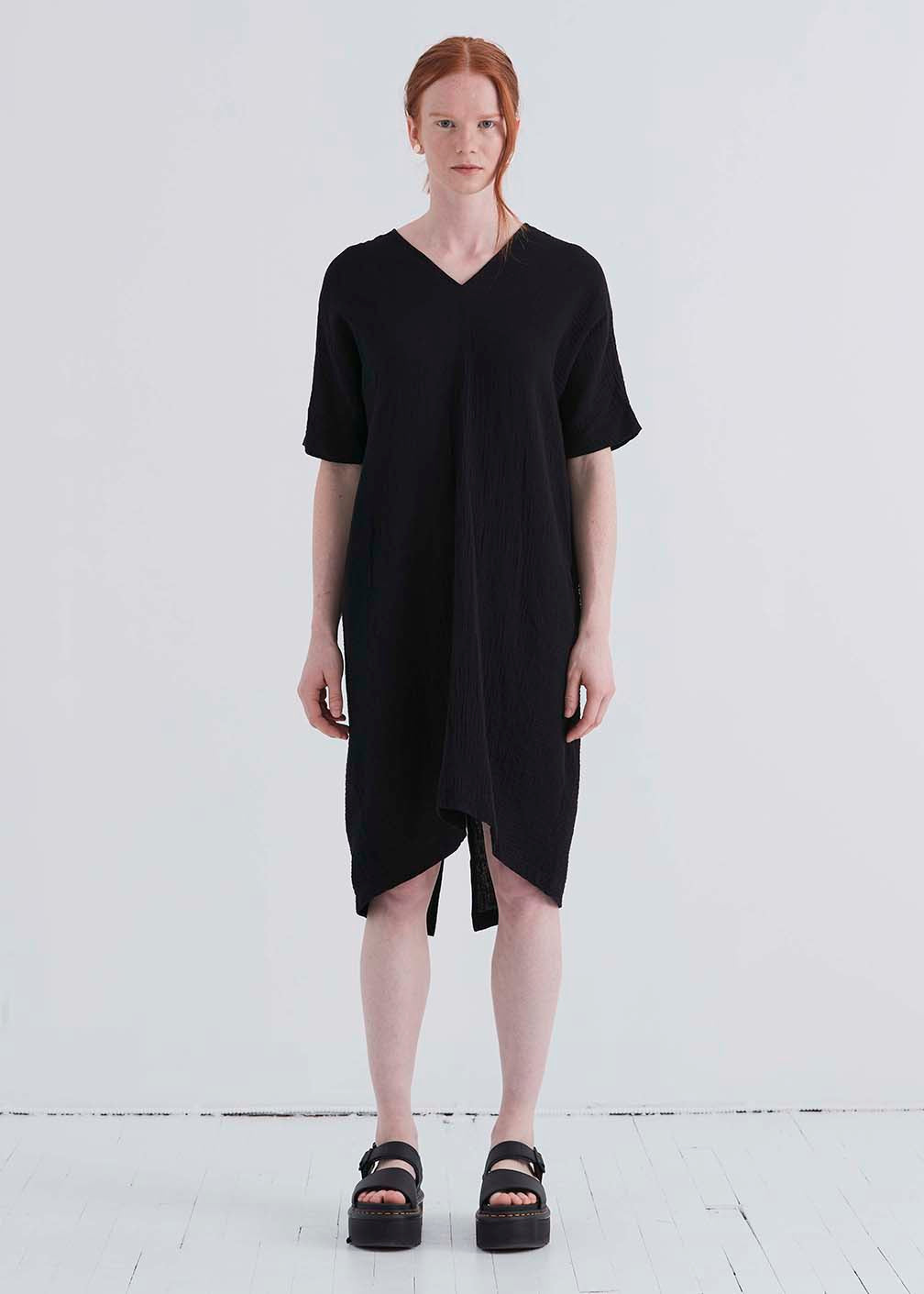 Deep cut v-neck dress with side pockets and slit at center back. Hem is longer in the back