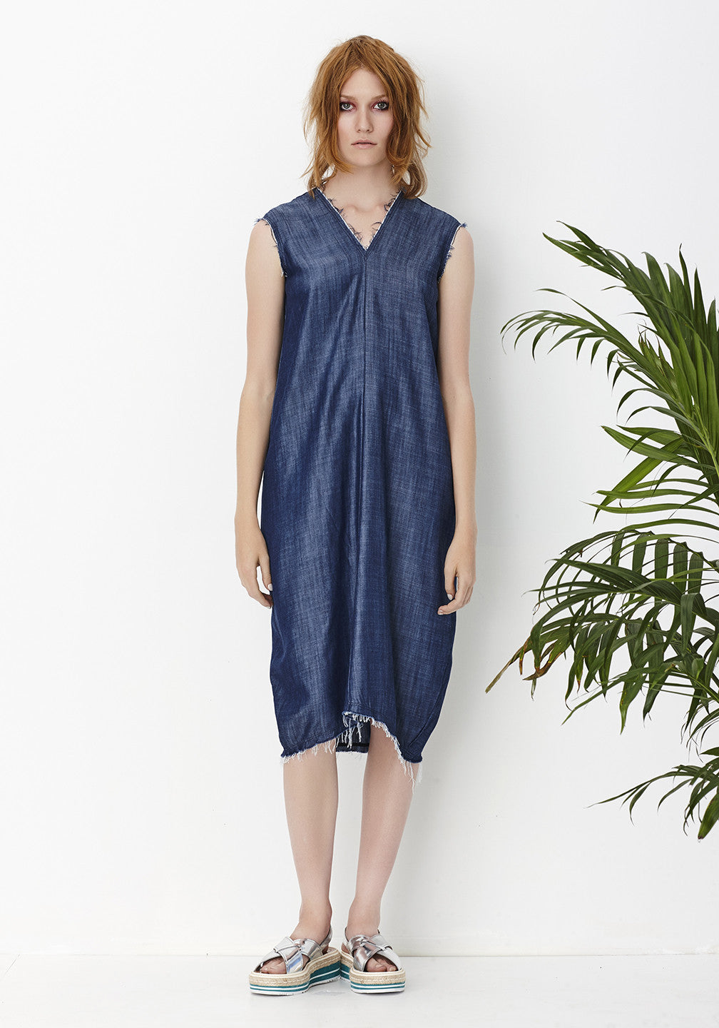 V-neck cocoon shape denim dress with raw edge at neck, armhole and hem