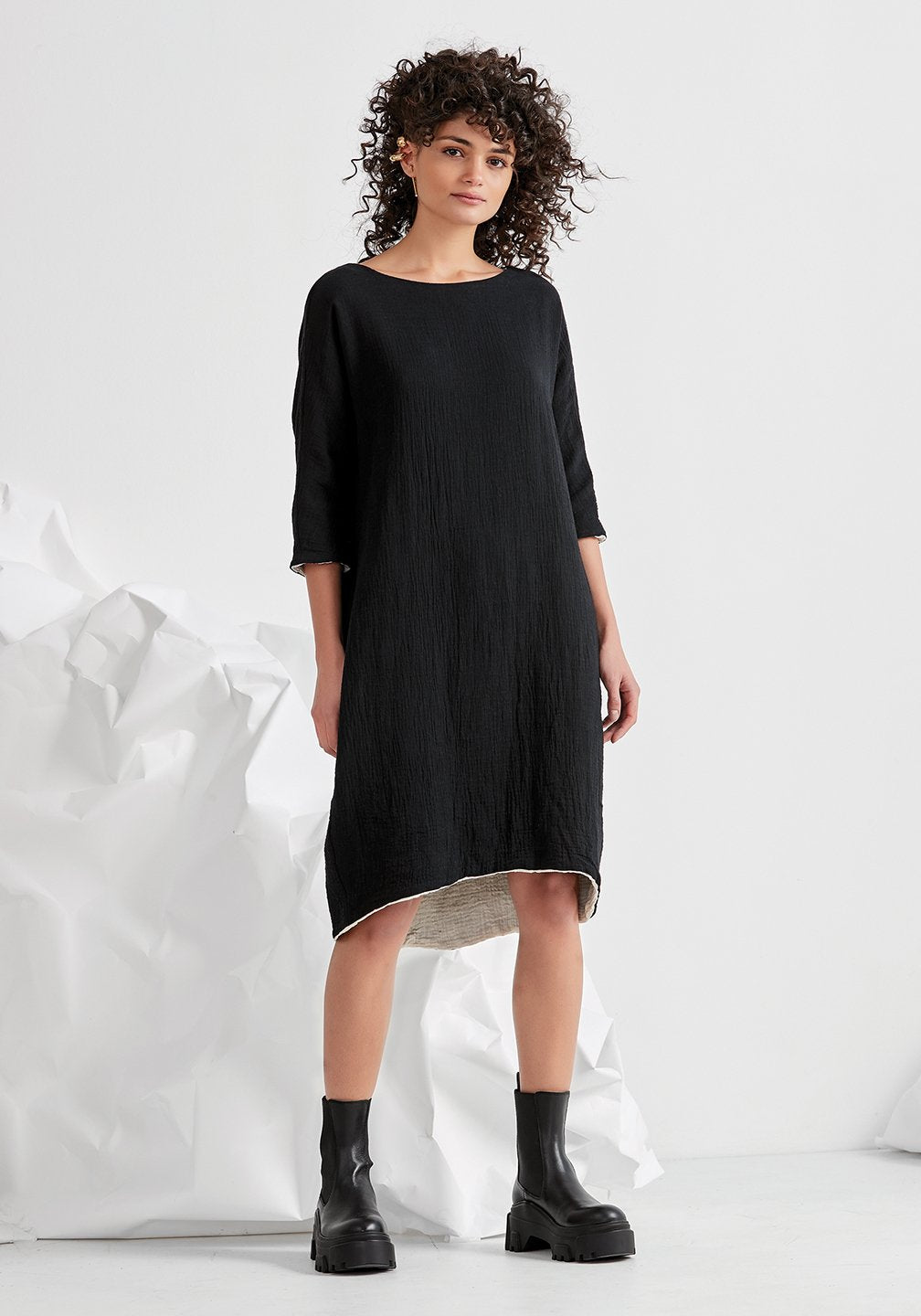 Easy fit dress with 3/4 sleeves, boat neckline and curved hem made of two contrasting layers of textured double gauze.