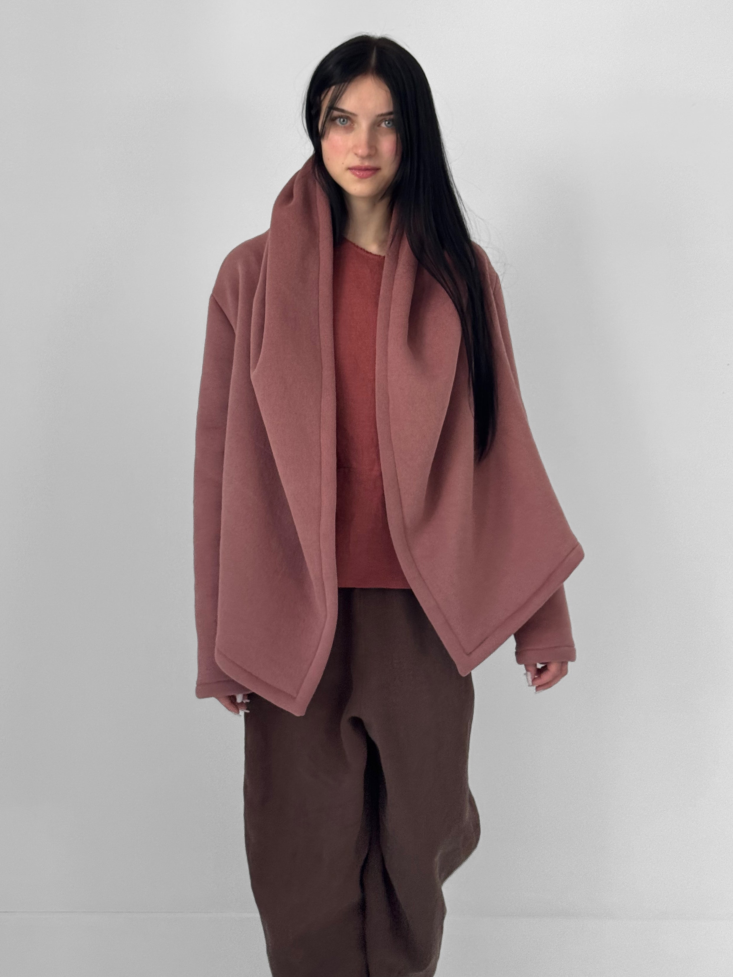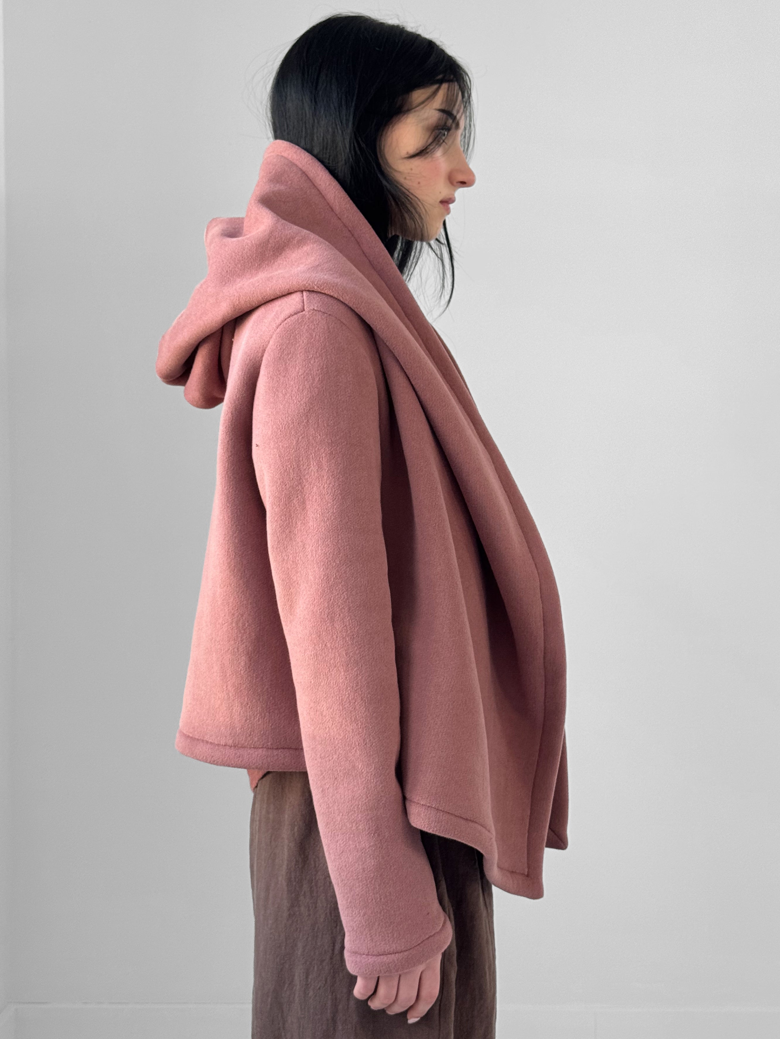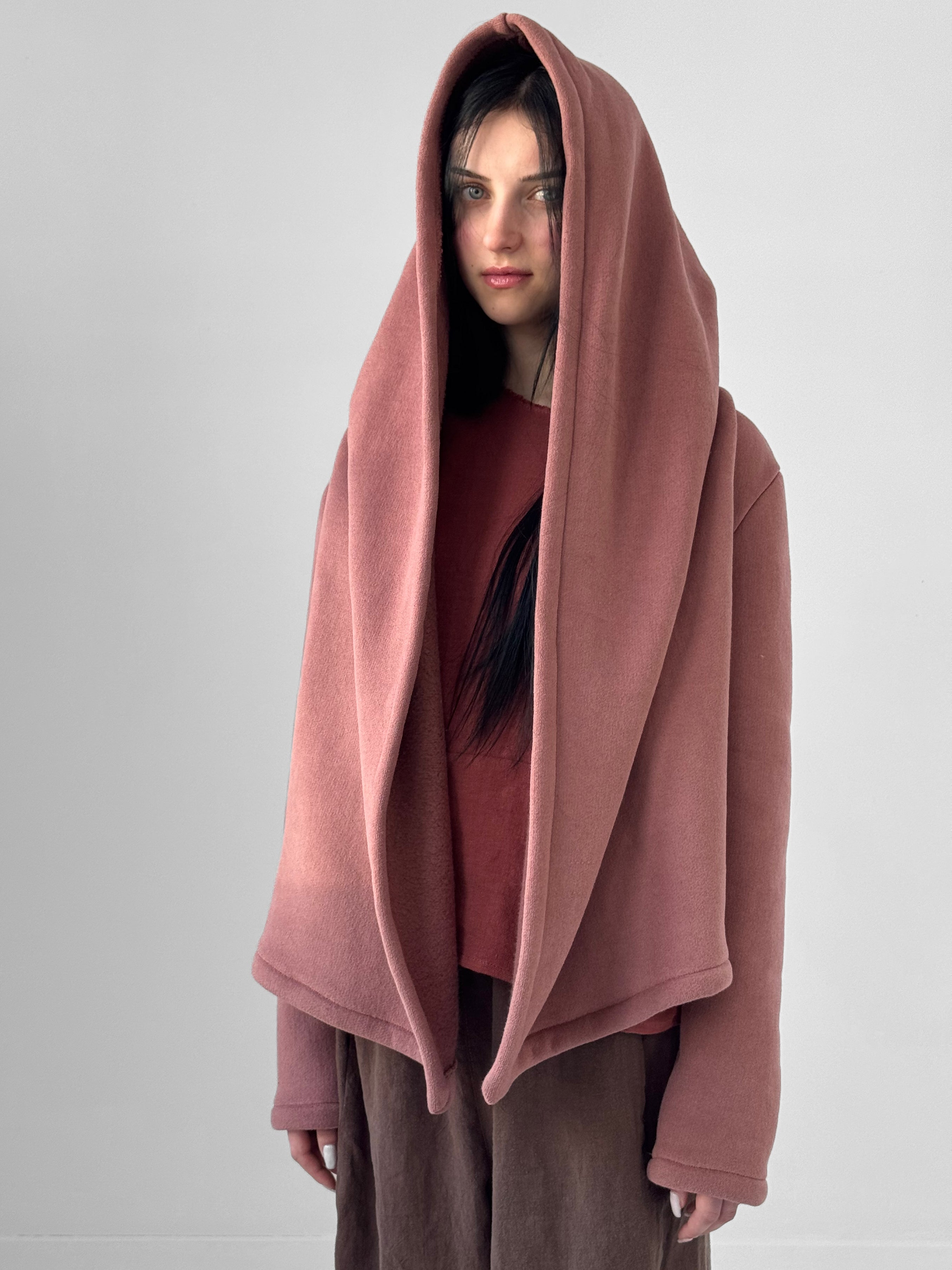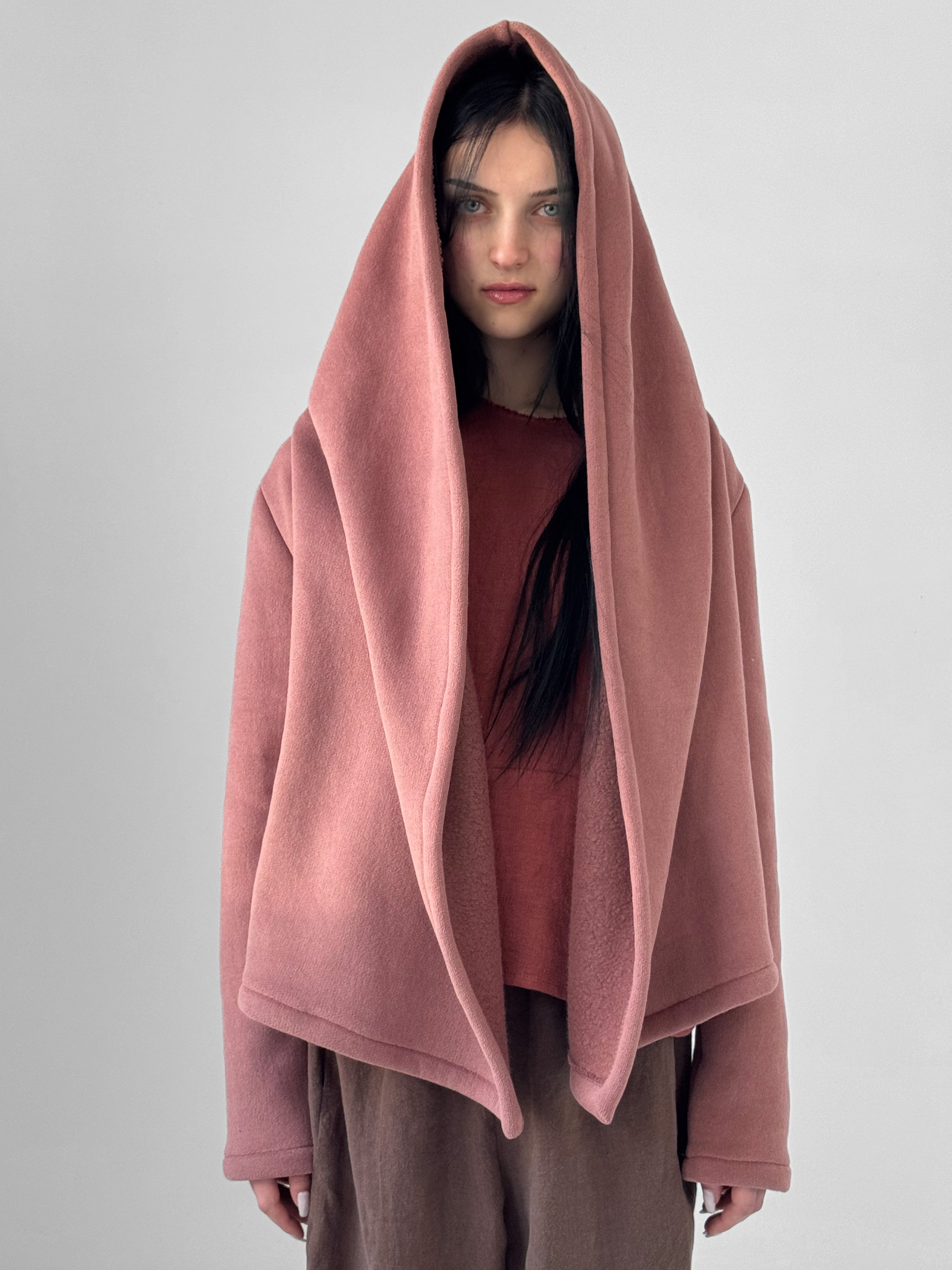 Soft, enveloping, and quietly architectural. The Alder Jacket is crafted in a plush velvet fleece that offers warmth without weight, draping fluidly while holding gentle structure. Designed with an open front, a generously sized hood, and a sculptural lapel, the silhouette falls naturally around the body, creating an effortless sense of ease and refinement.