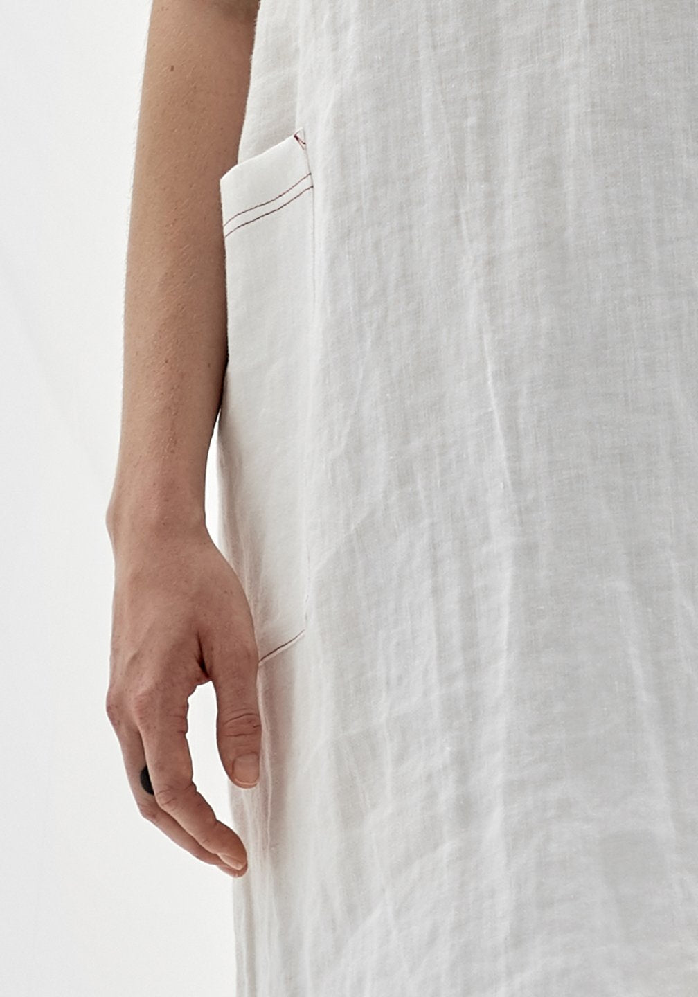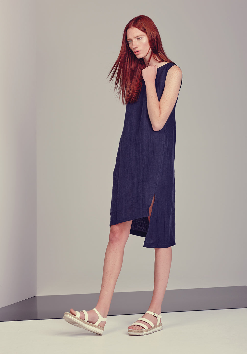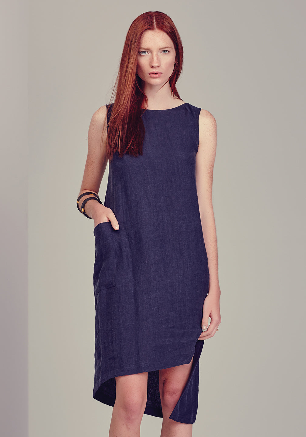 Sleeveless dress with boat neckline asymmetric hem, one side pocket and contrast stitching. DANIELE has raw edge at neck and sleeves