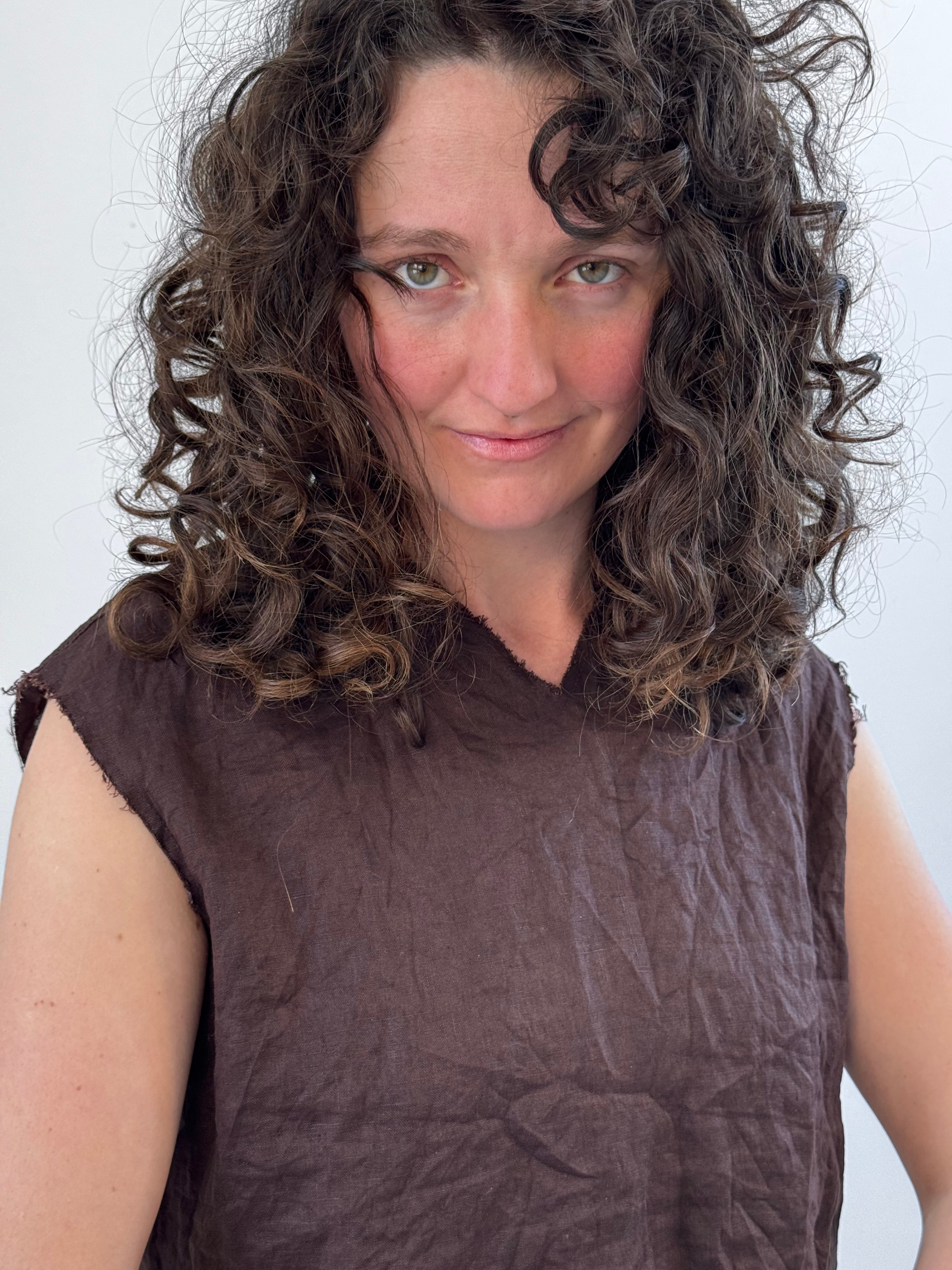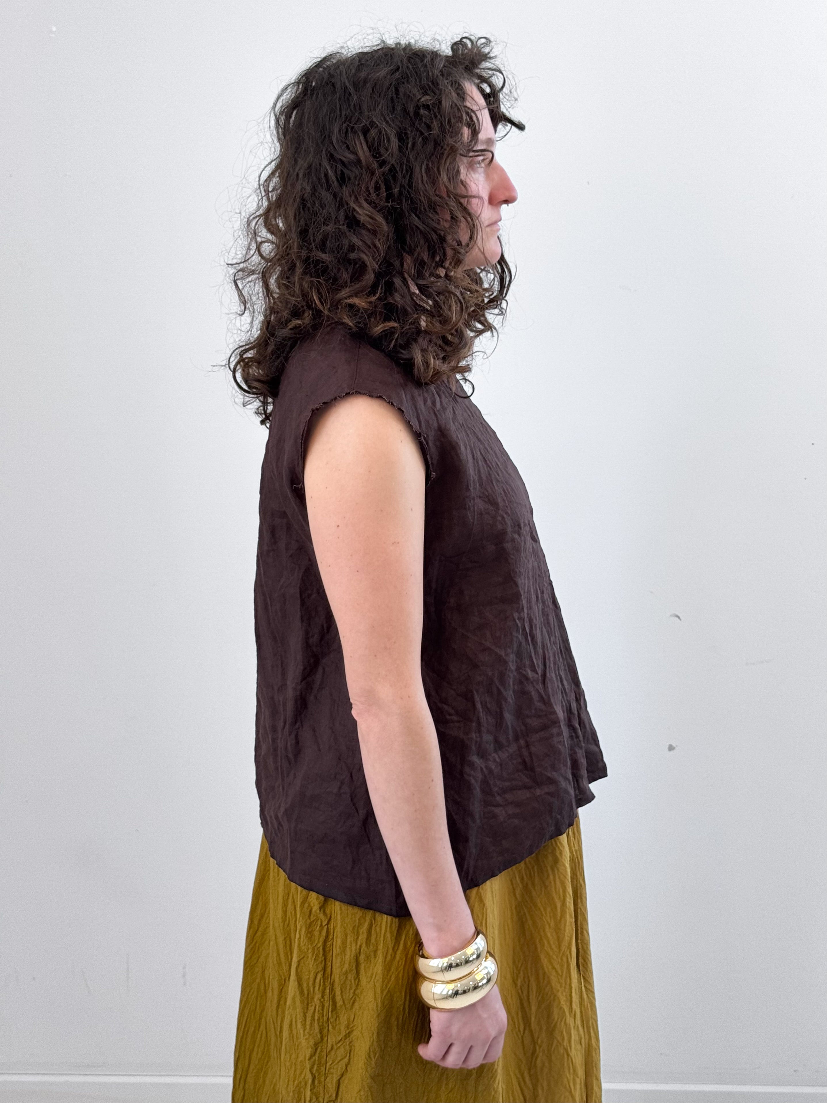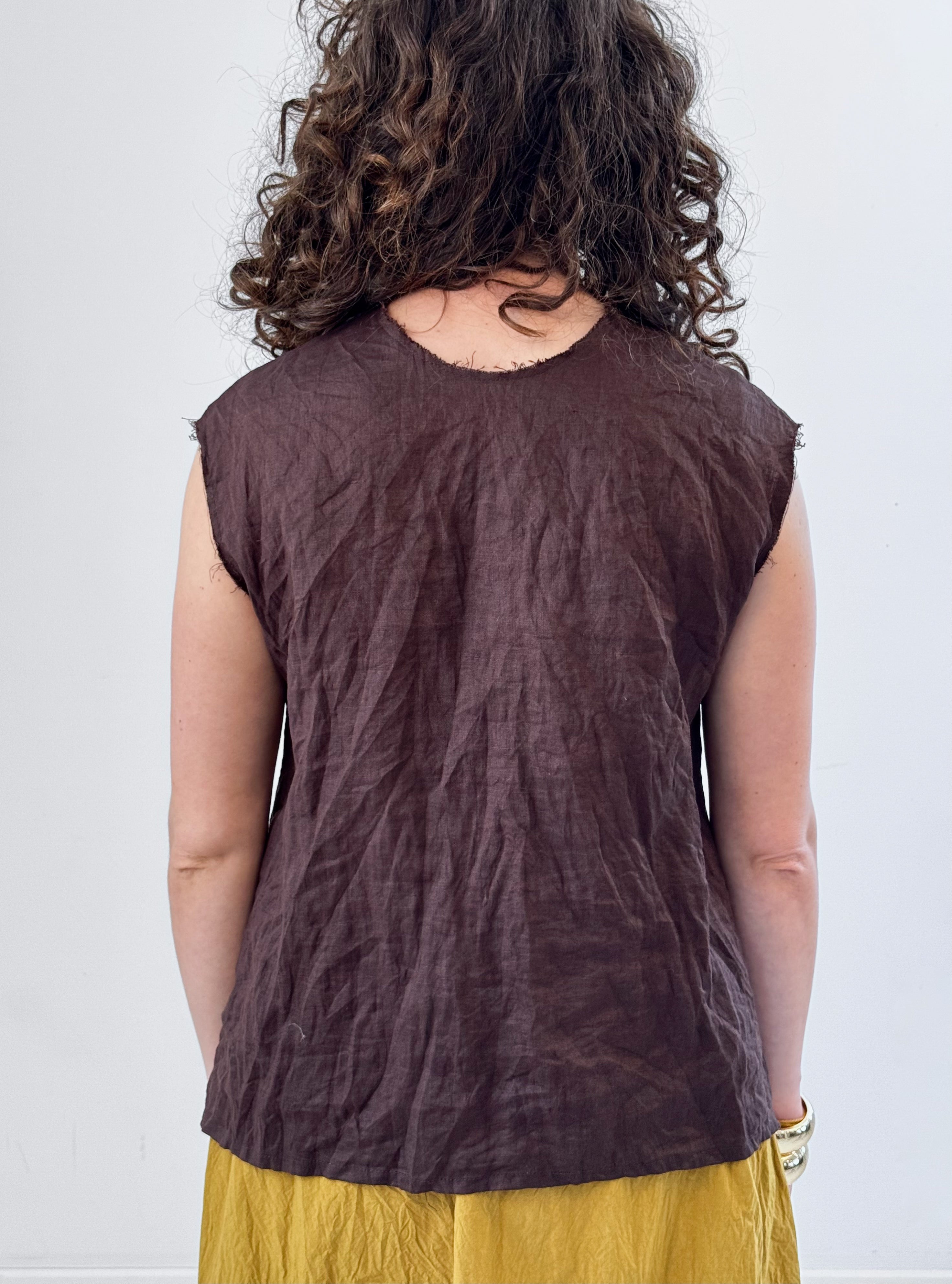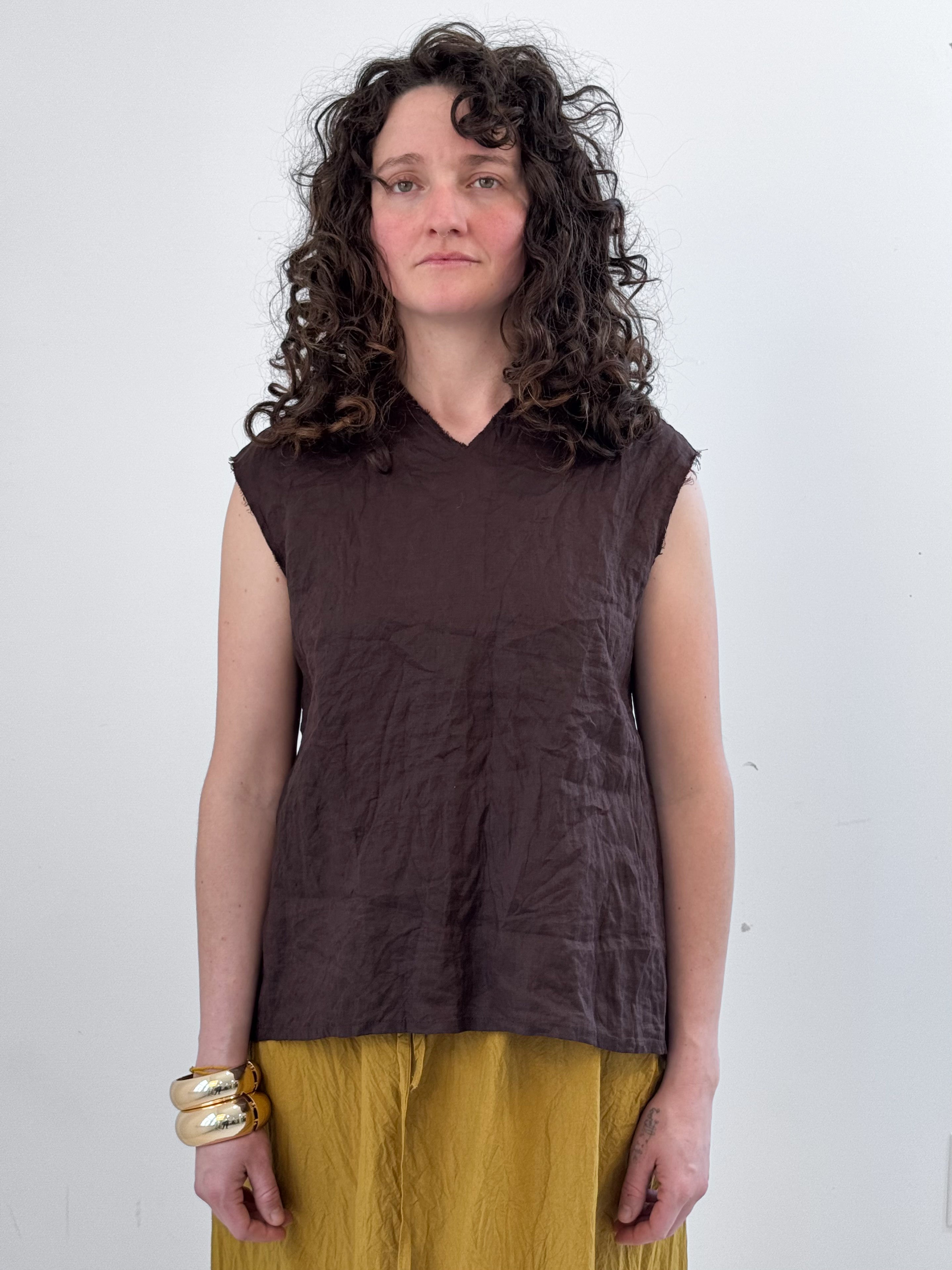Crumpled linen top featuring a high V-neck, and a raw, edgy finish at the sleeves and neckline.