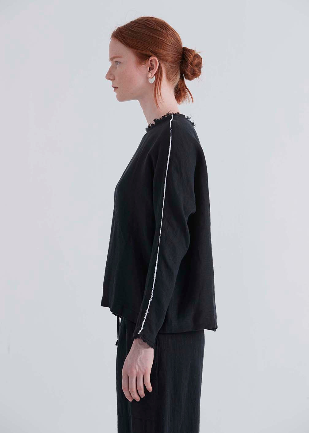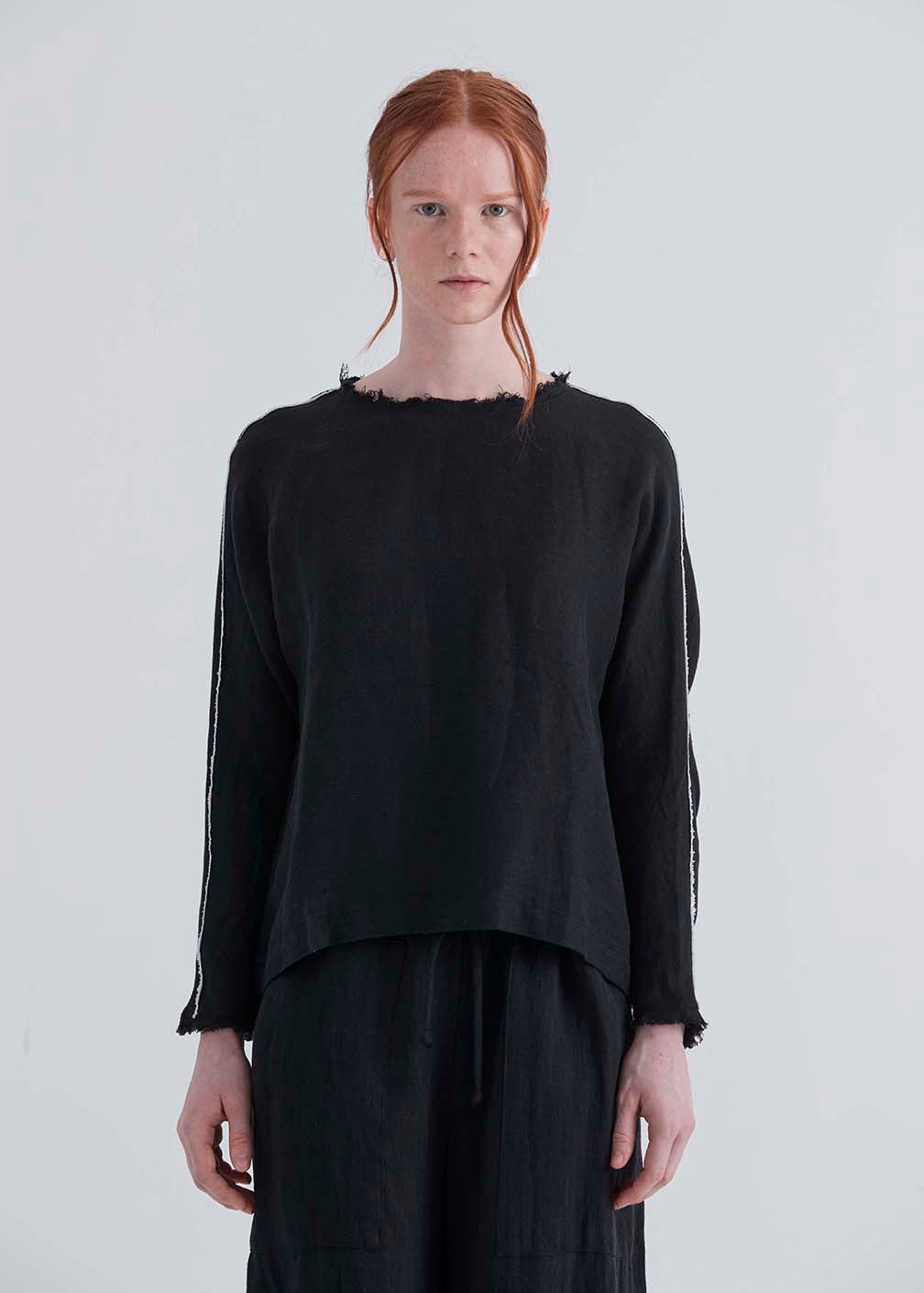 Loose fit top with dolman sleeves and contrasting raw edge piping. Raw edge at neck and sleeve