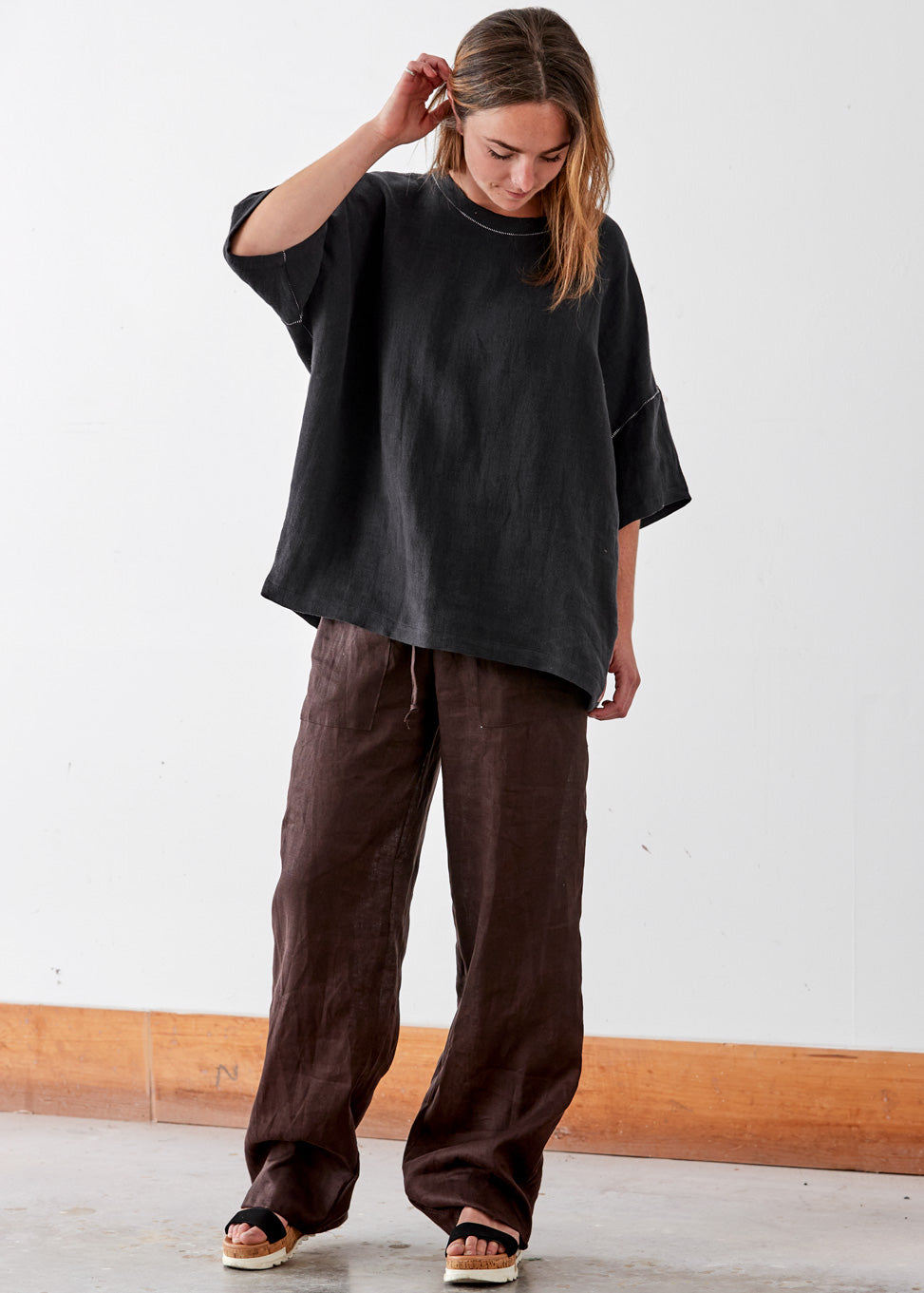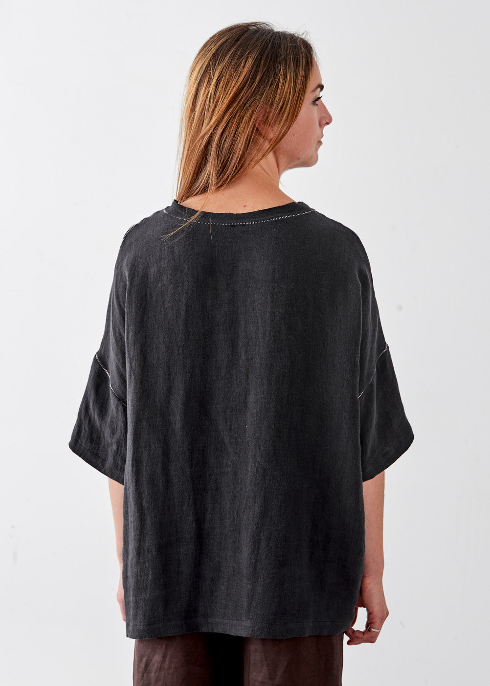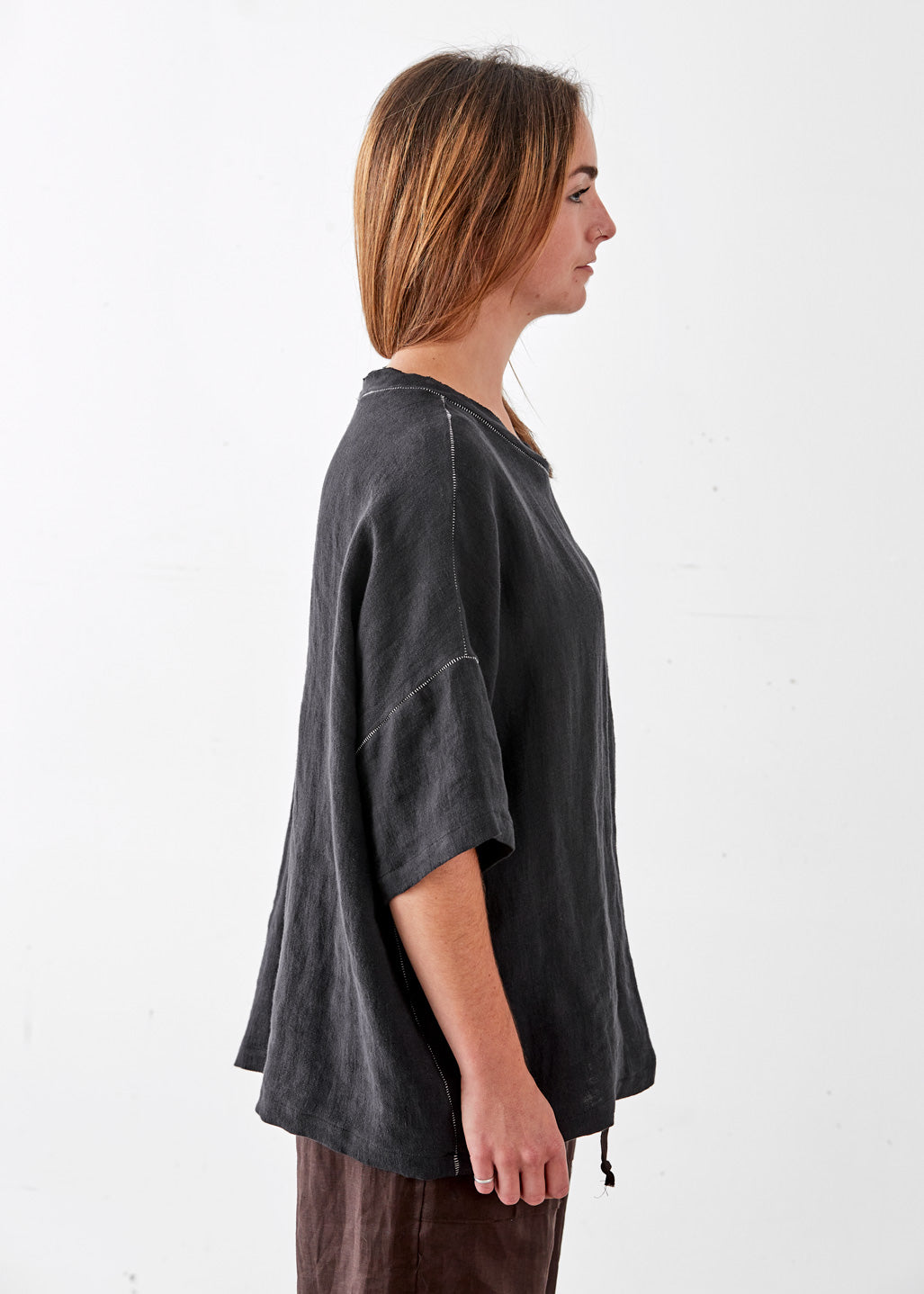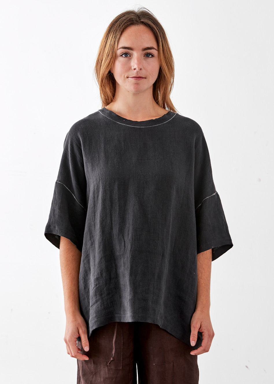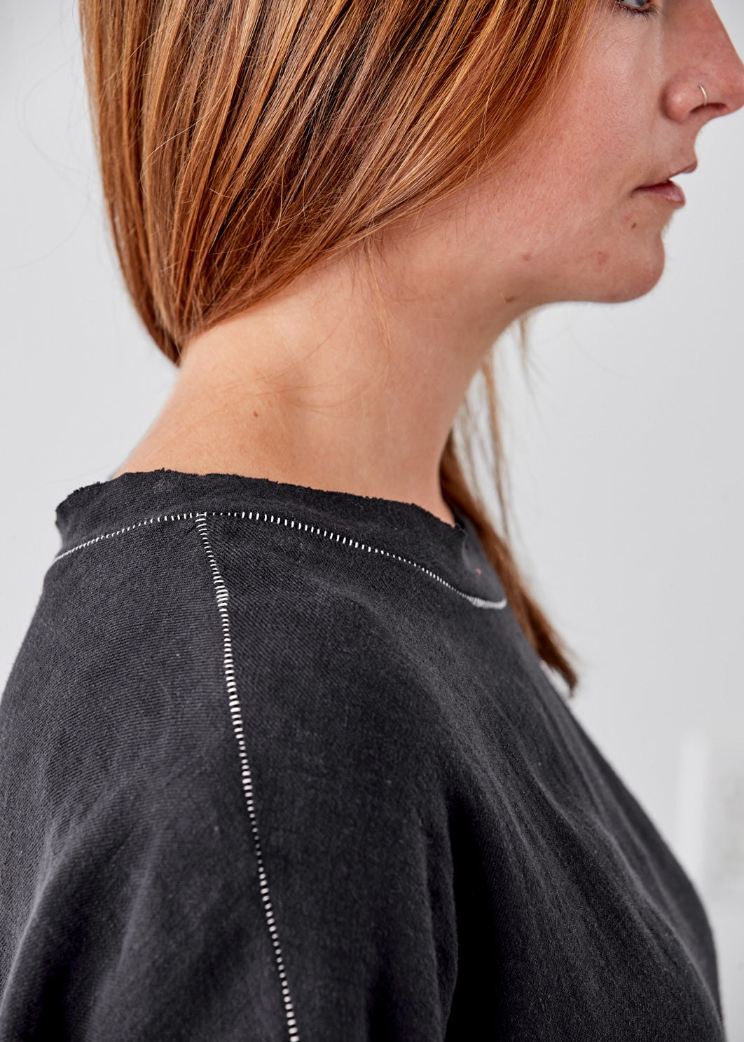 Loose fit top with dolman sleeves and contrasting raw edge piping. Raw edge at neck and sleeve