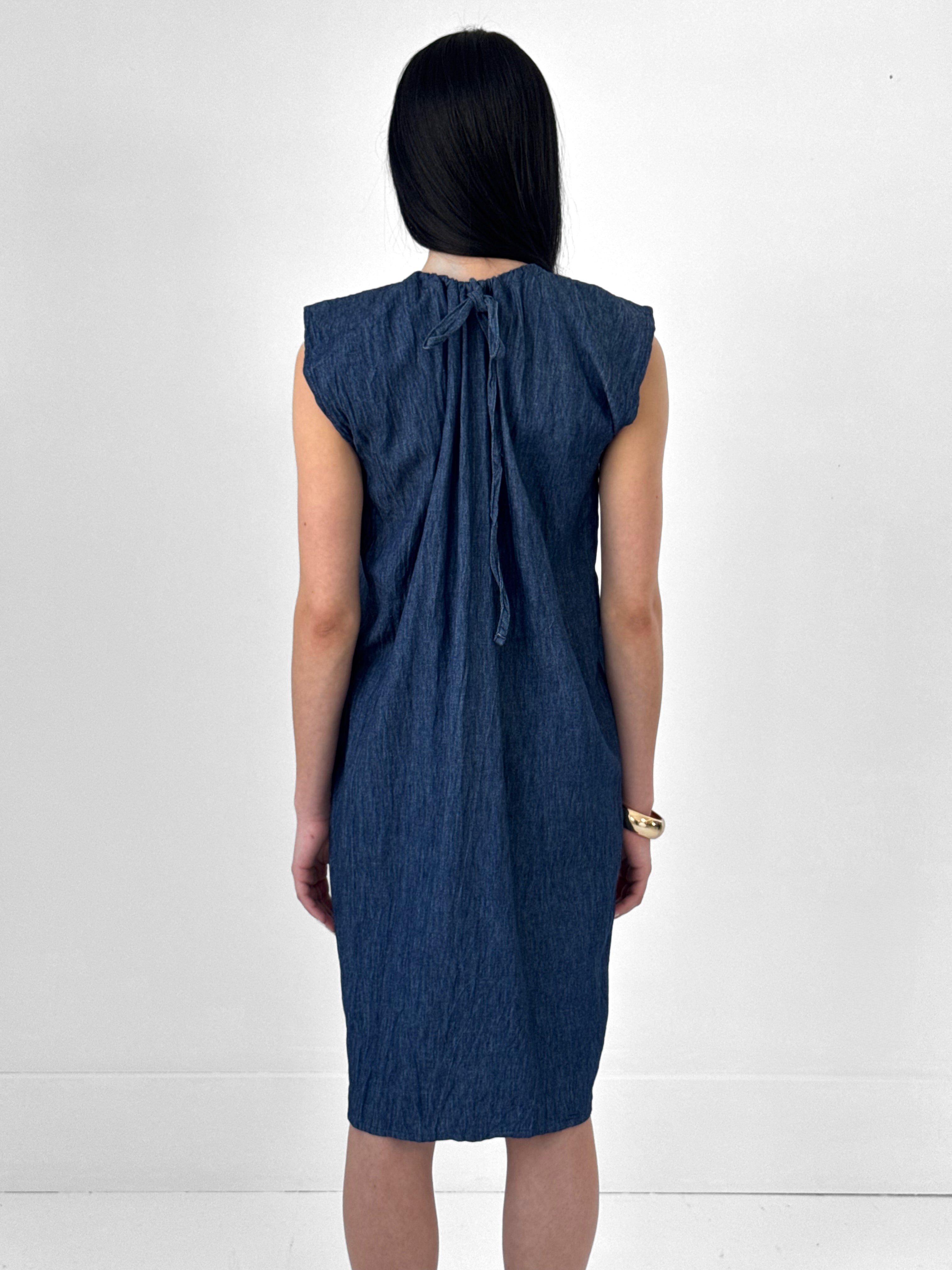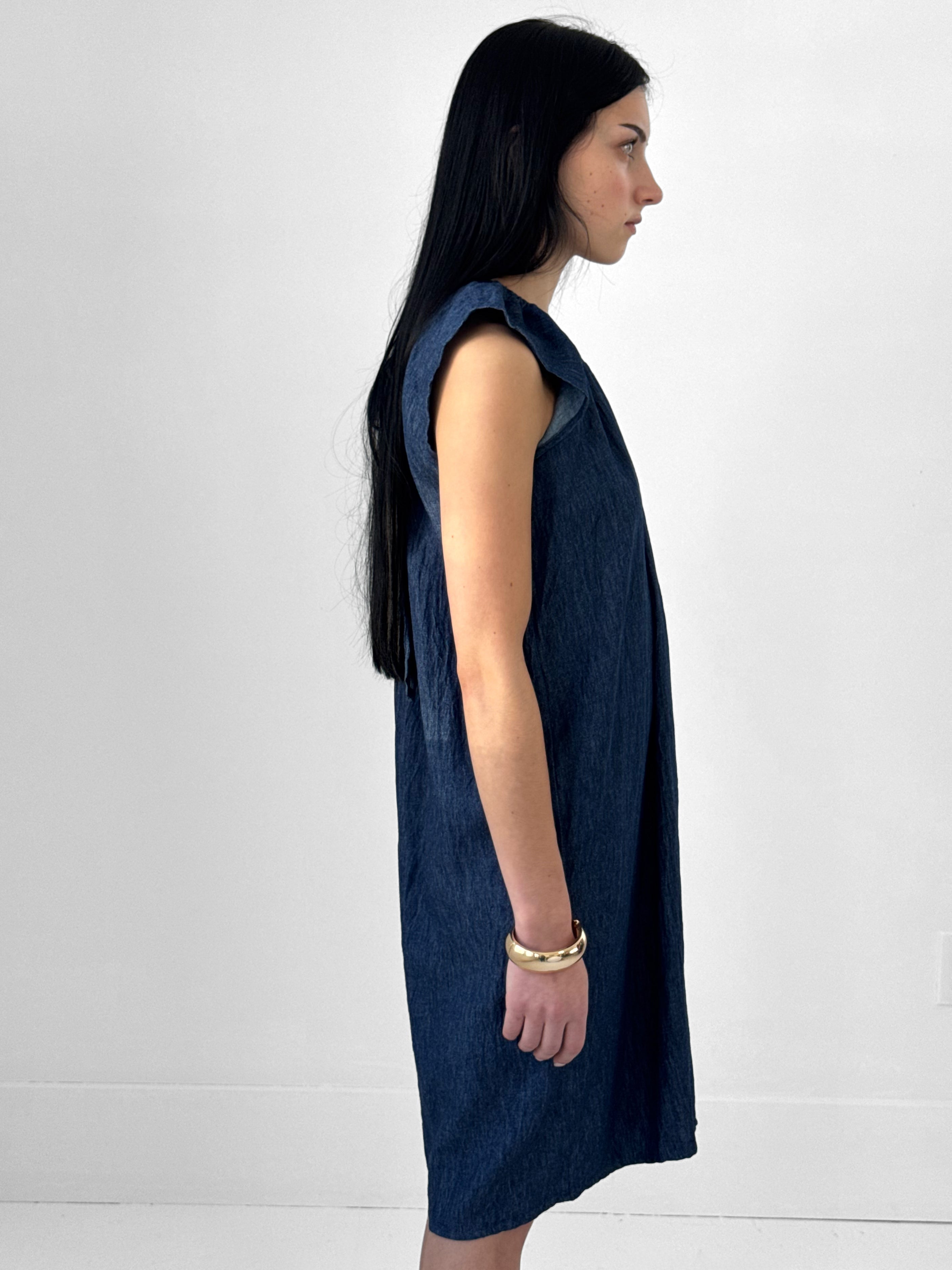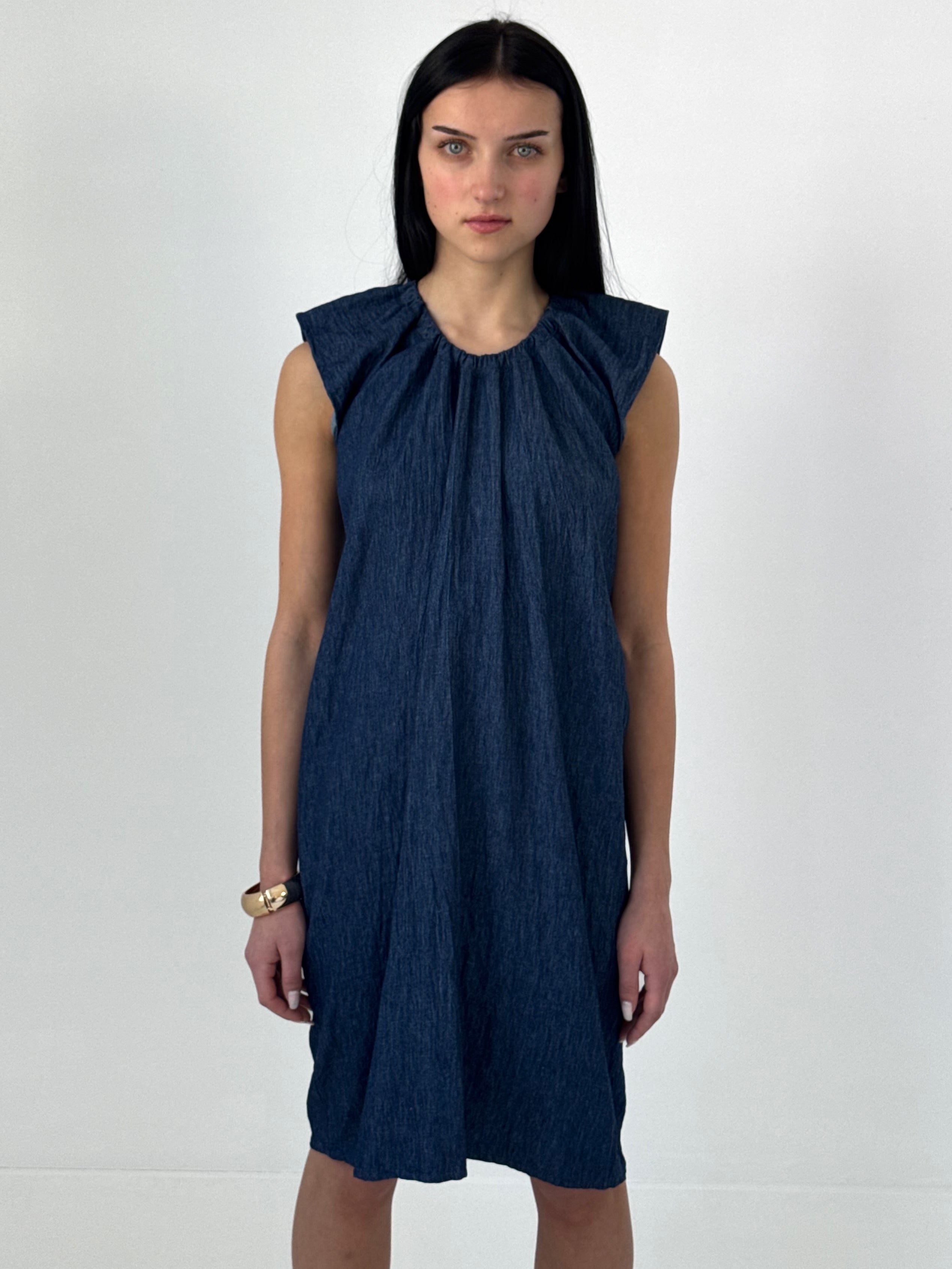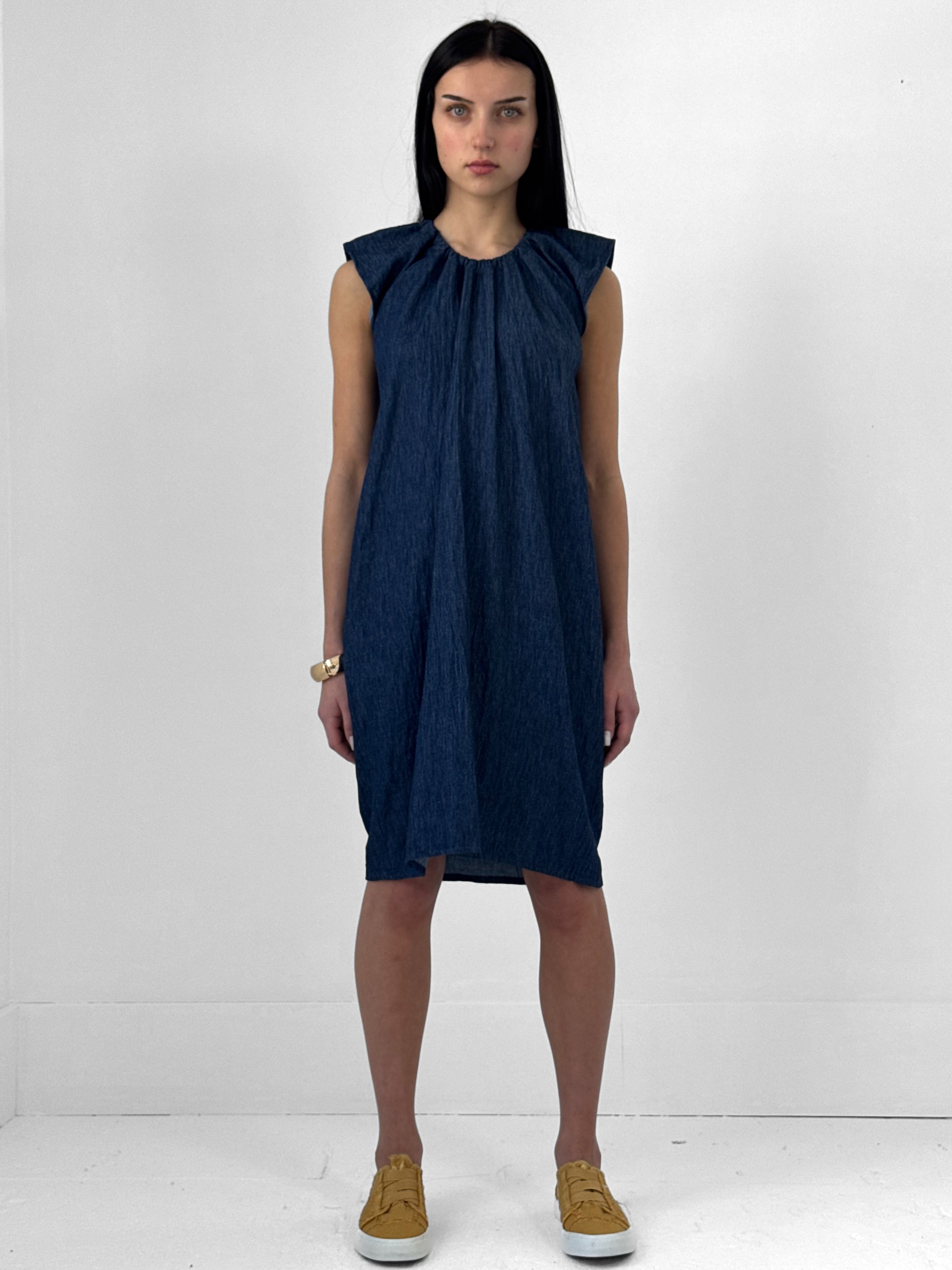 The Drift dress is defined by a softly gathered neckline and delicate ruffling at the shoulder, creating a subtle sense of movement and ease. An adjustable drawstring allows the neckline to shift — worn closer for a more sculpted shape or relaxed for a looser drape.