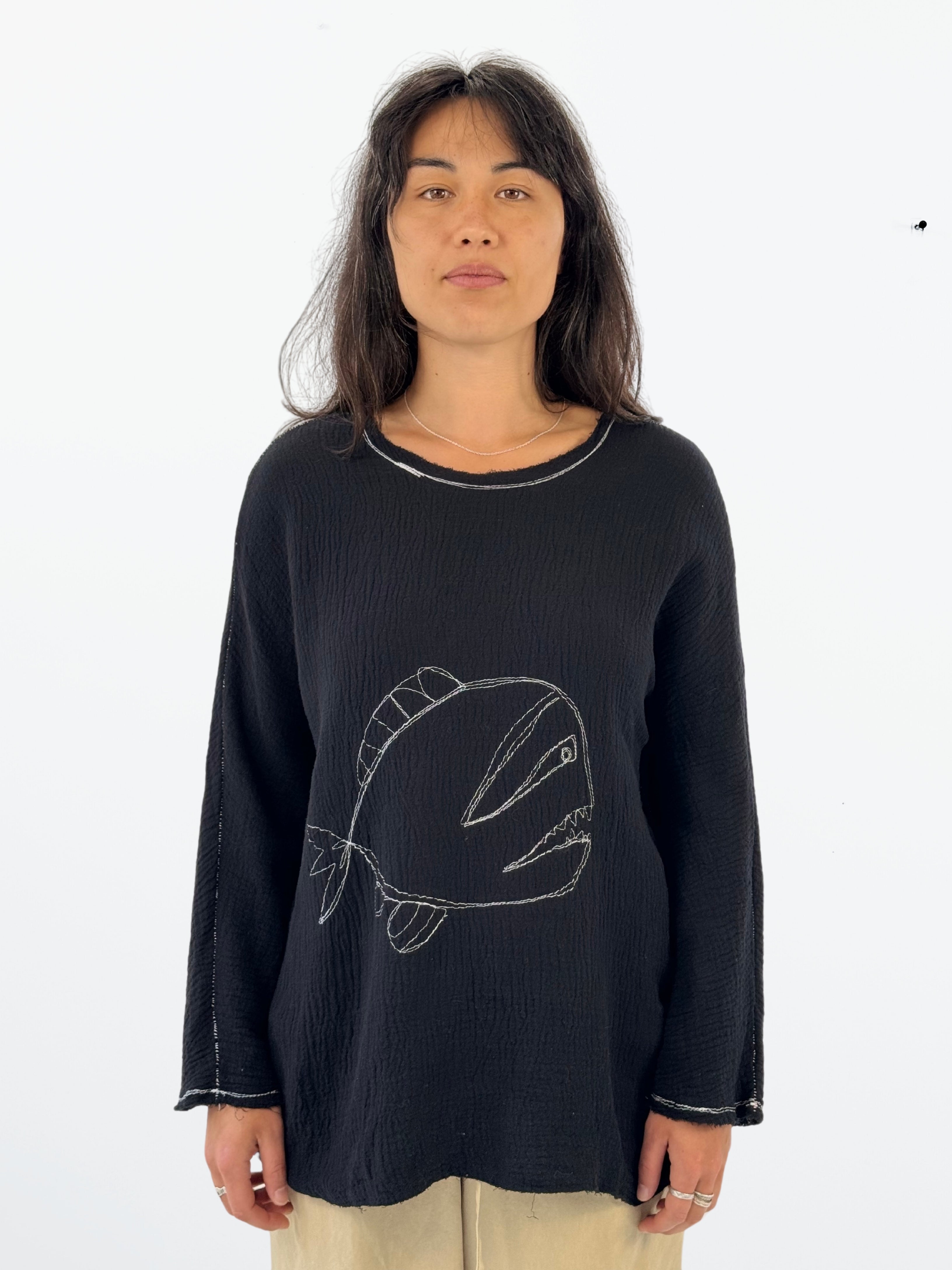 One of a kind easy fit top features raw edge at the sleeve, neck, and hem. The free hand sewing of whimsical characters adds a playful and unique touch.
