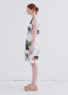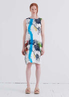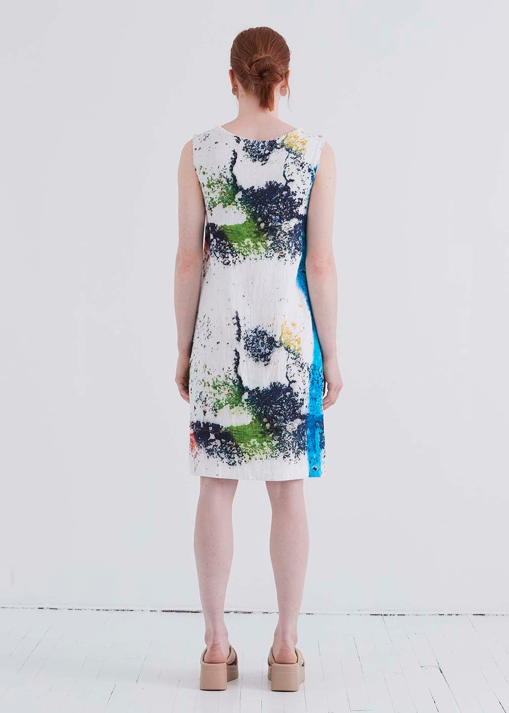 Sleeveless shift dress with cotton lining and raw edge at sleeve and neck