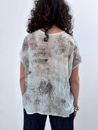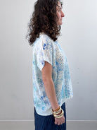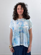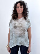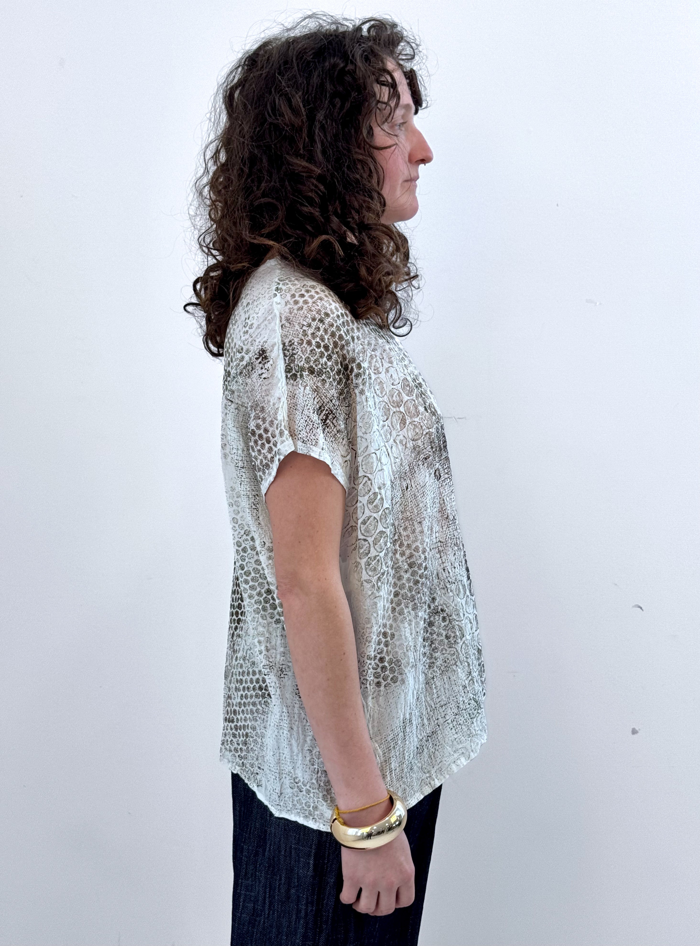 Relaxed fit hand printed T with round neckline and raw edges at neck and seams. Hand printed. Crafted in a slightly sheer washed rayon/silk blend