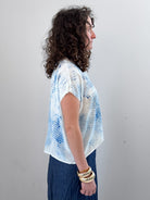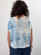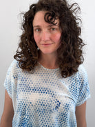 Relaxed fit hand printed T with round neckline and raw edges at neck and seams. Hand printed. Crafted in a slightly sheer washed rayon/silk blend