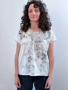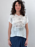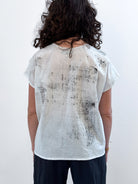 Relaxed fit hand printed T with round neckline and raw edges at neck and seams. Hand printed. Crafted in a slightly sheer washed rayon/silk blend or cotton voile
