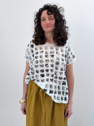 Relaxed fit hand printed T with round neckline and raw edges at neck and seams. Hand printed. Crafted in a slightly sheer washed rayon/silk blend