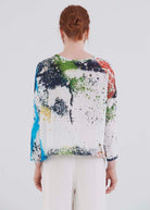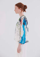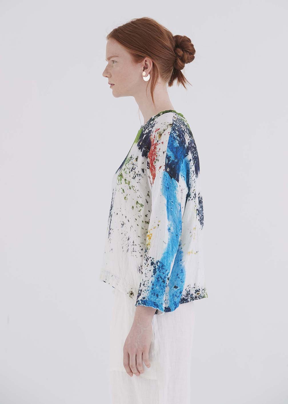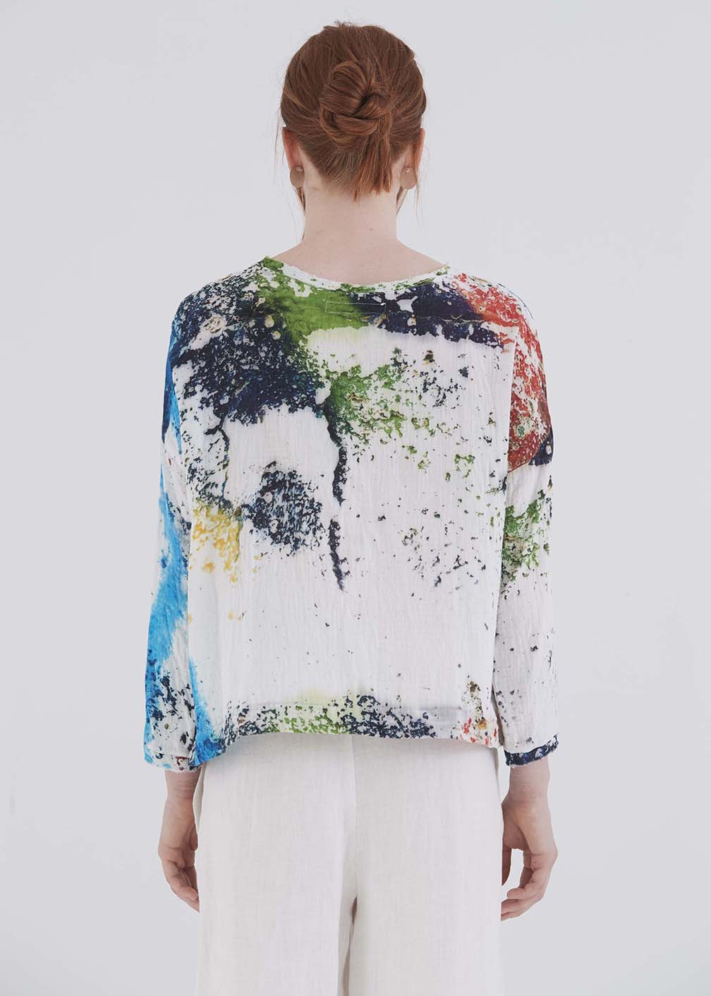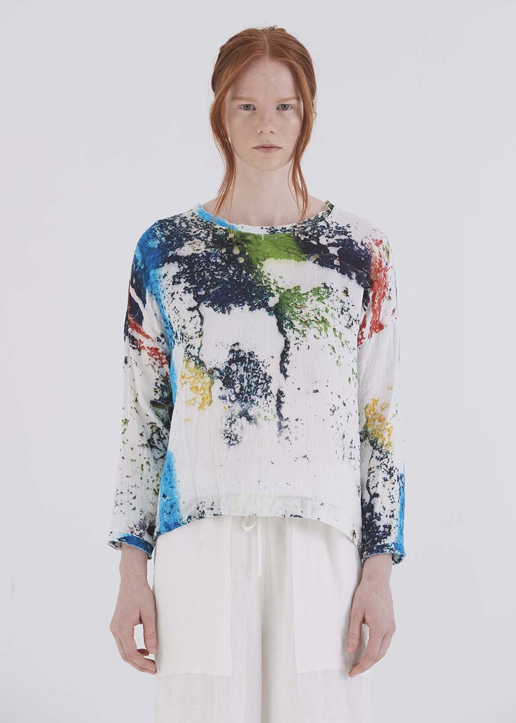 Loose fit gauzy top with raw edge at sleeve and neckline.