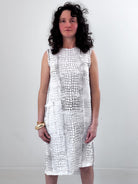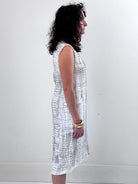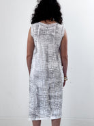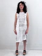 Hand printed sleeveless dress with boat neckline asymmetric hem, one side pocket and contrast stitching. DANIELE has raw edge at neck and sleeves