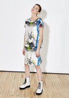 Loose fit digitally printed knee-length t-shirt dress with boat neckline and cap sleeves.