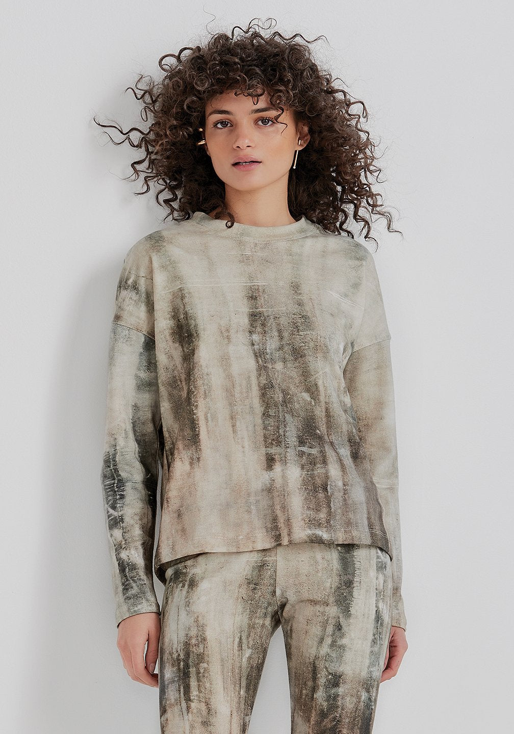 Boxy fit sweatshirt with crew neck and drop shoulders. Made with our digital in house print organic fleece.