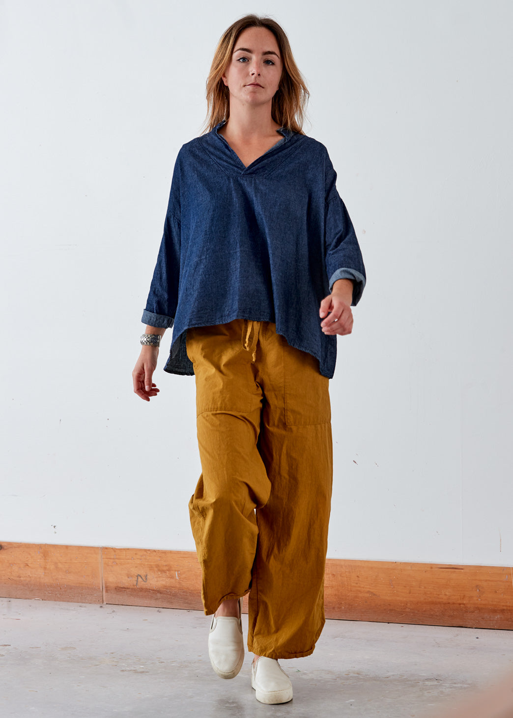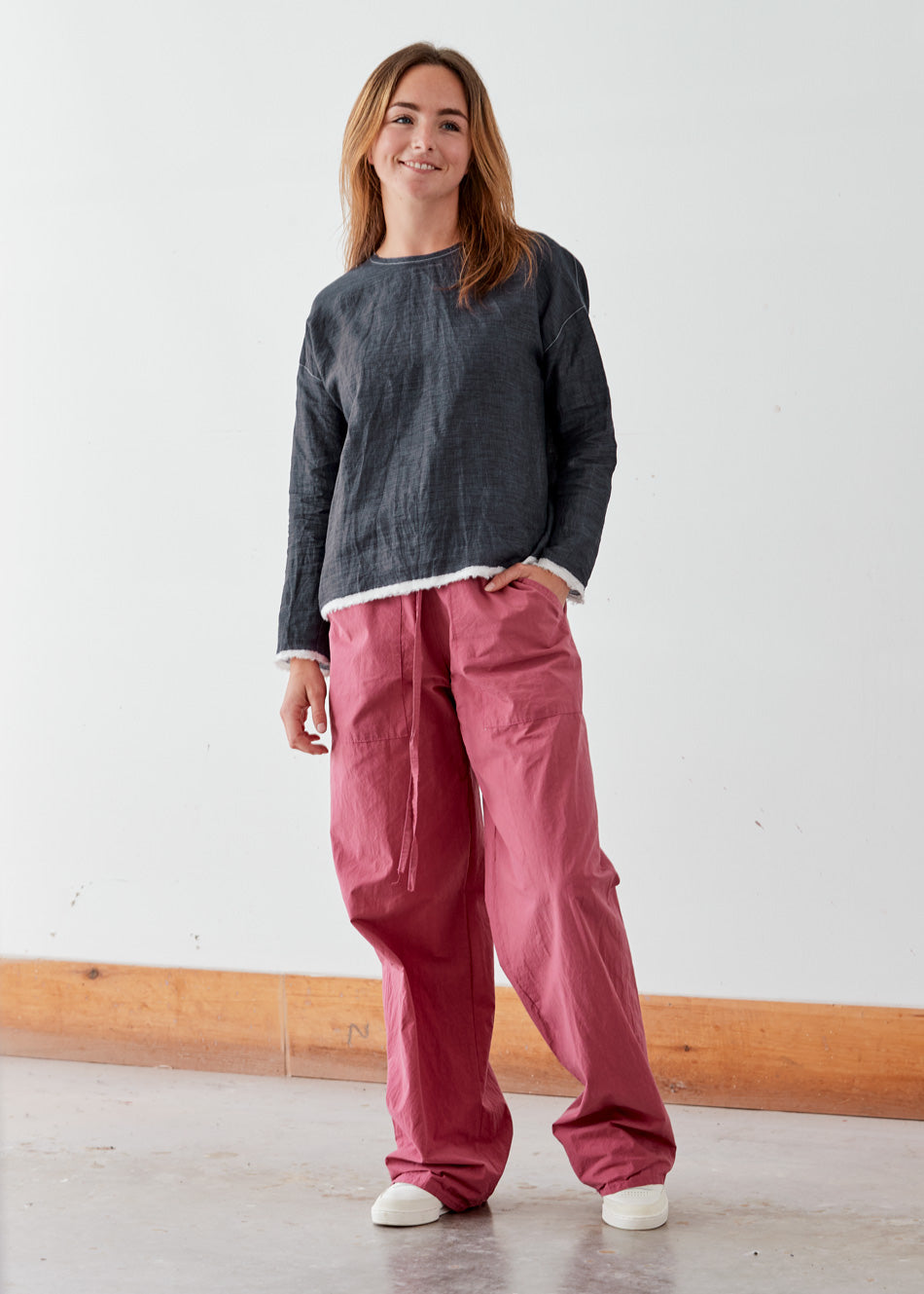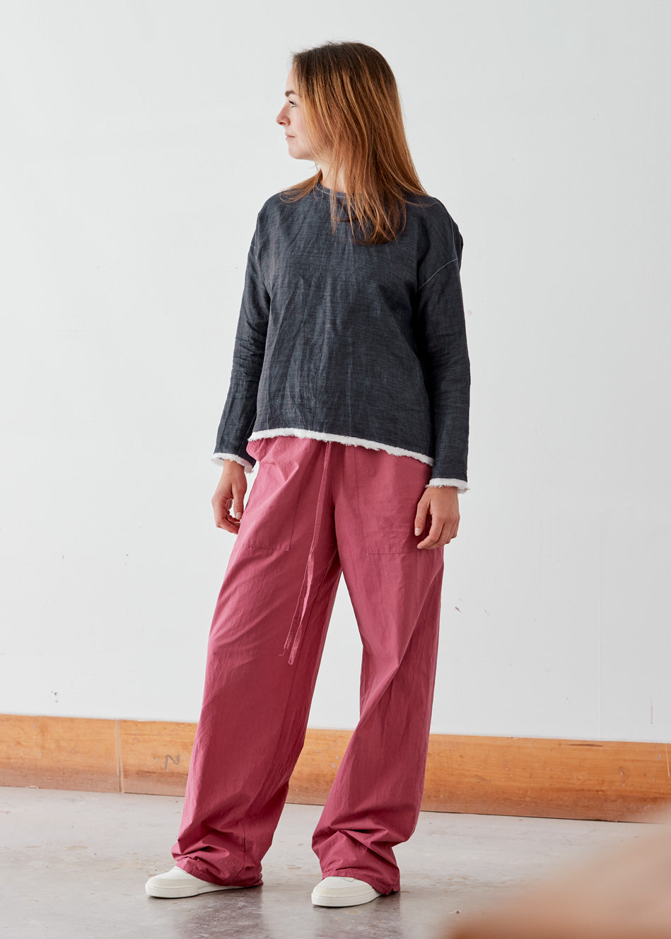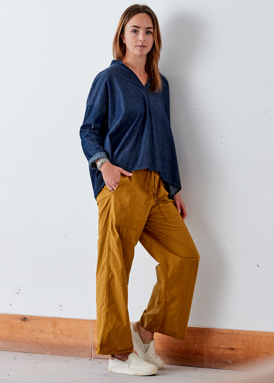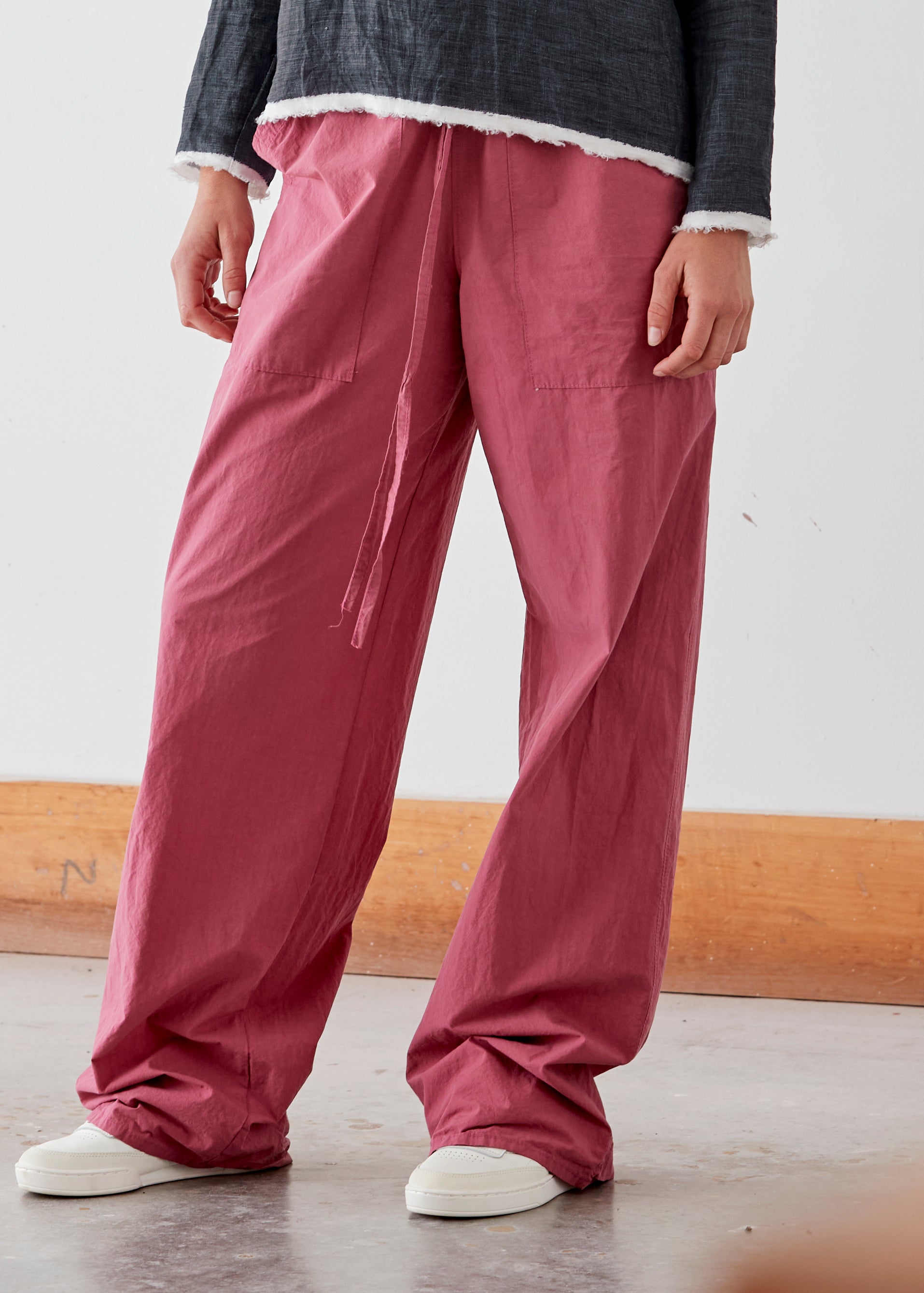 Relaxed fit wide leg pants with drawstring waist and side pockets. Crafted with crisp paper cotton