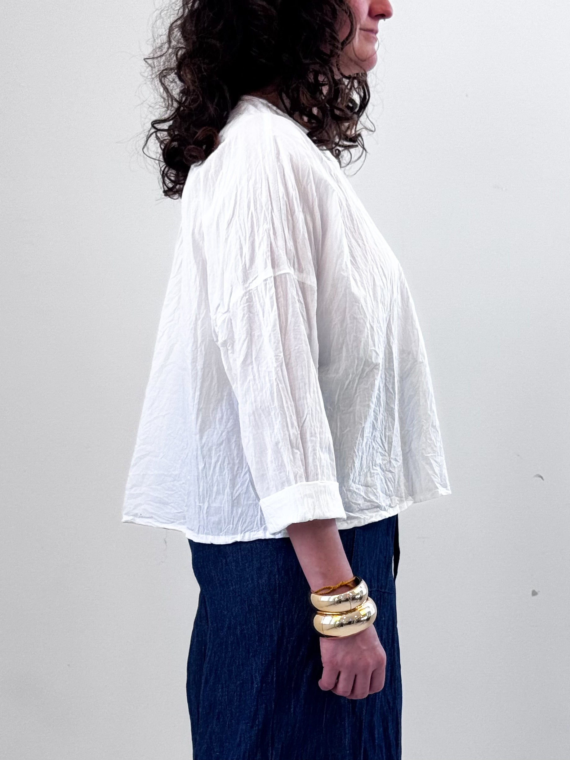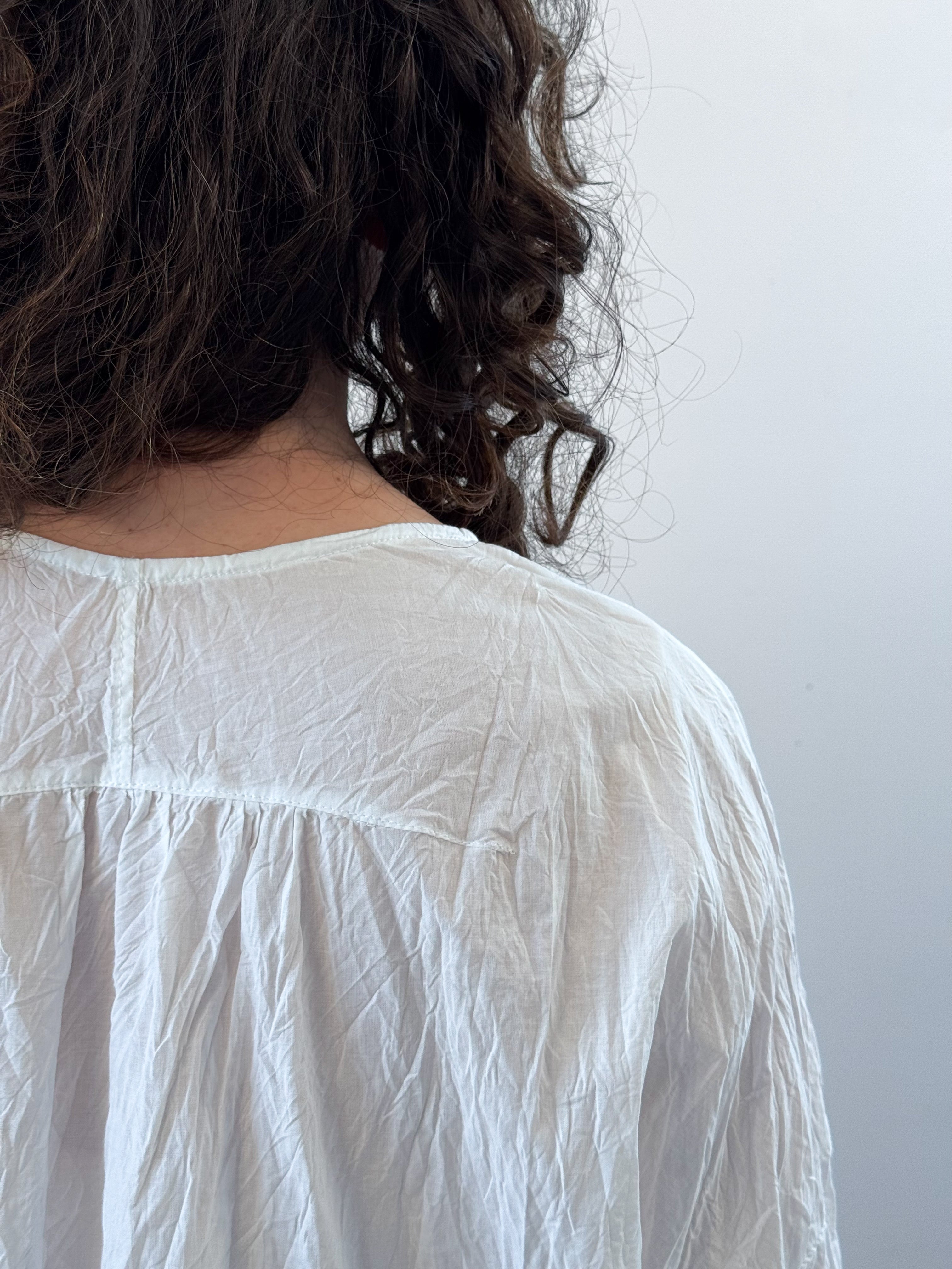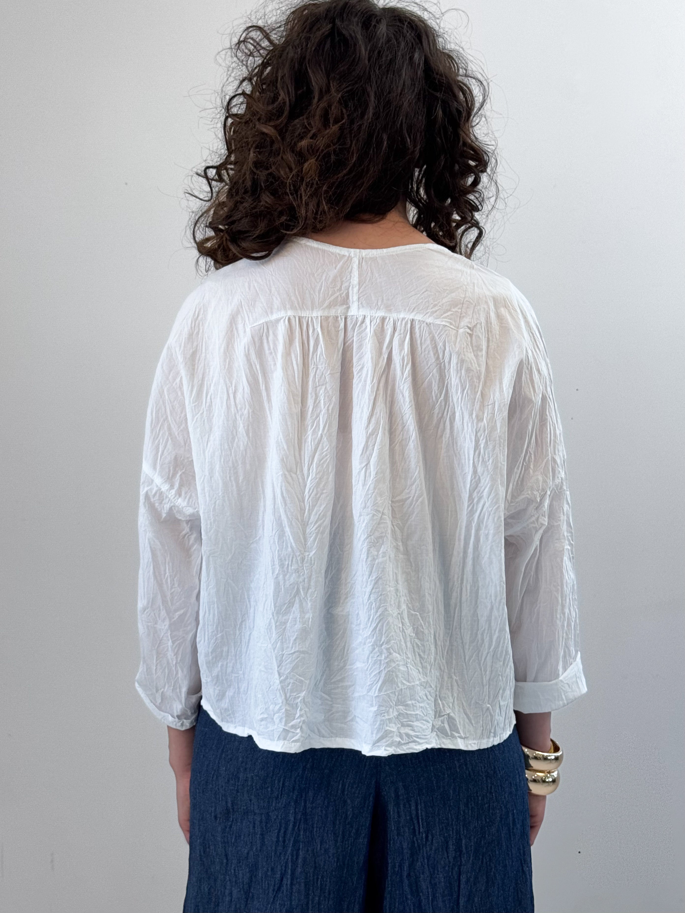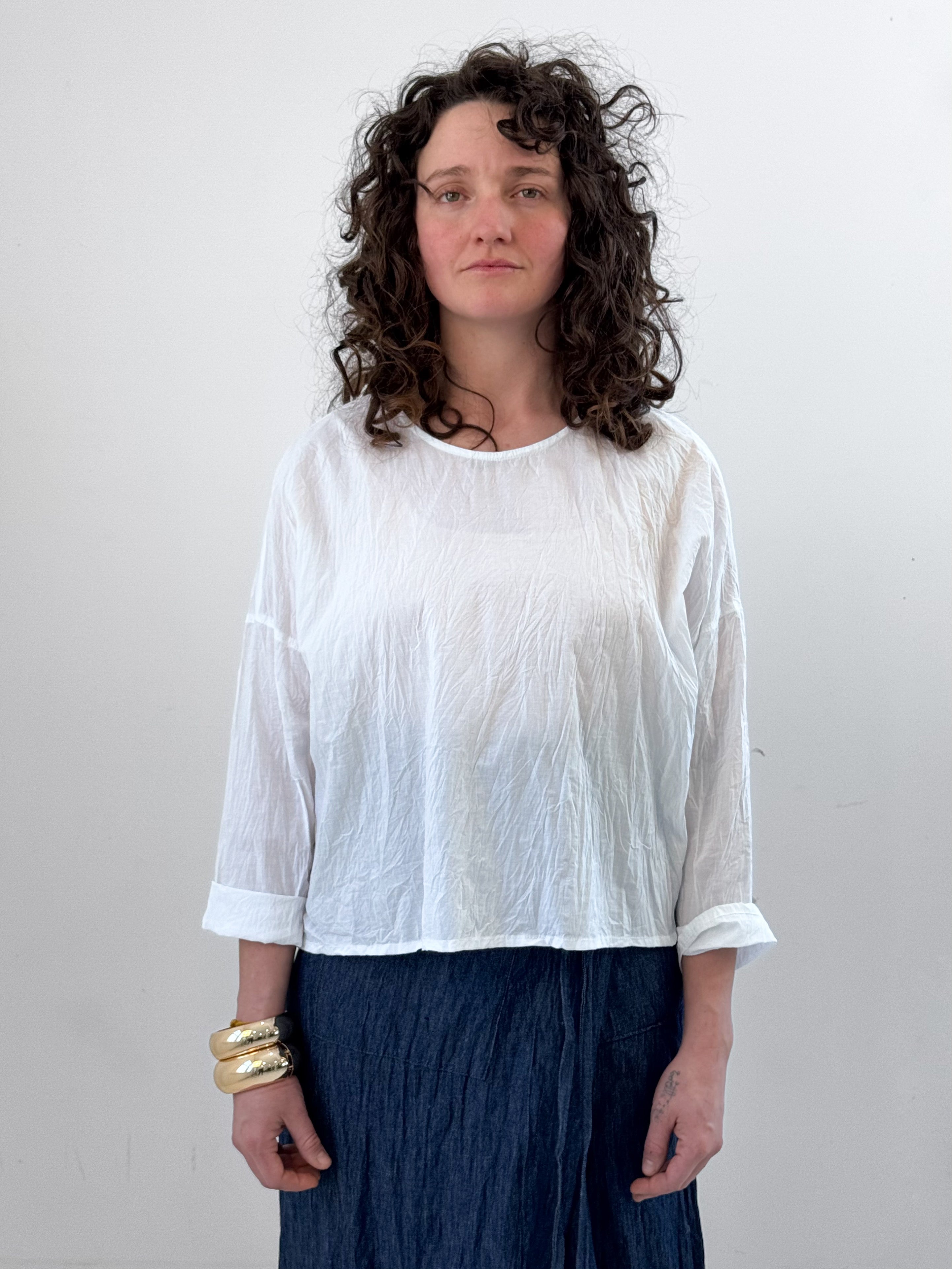 The ALEXA top is the perfect simple summer go-to. Made with an airy washed cotton voile it features a boxy cut, a raw edge neckline and feminine gathers at back. Pair it with denim or linen. Easy Breezy