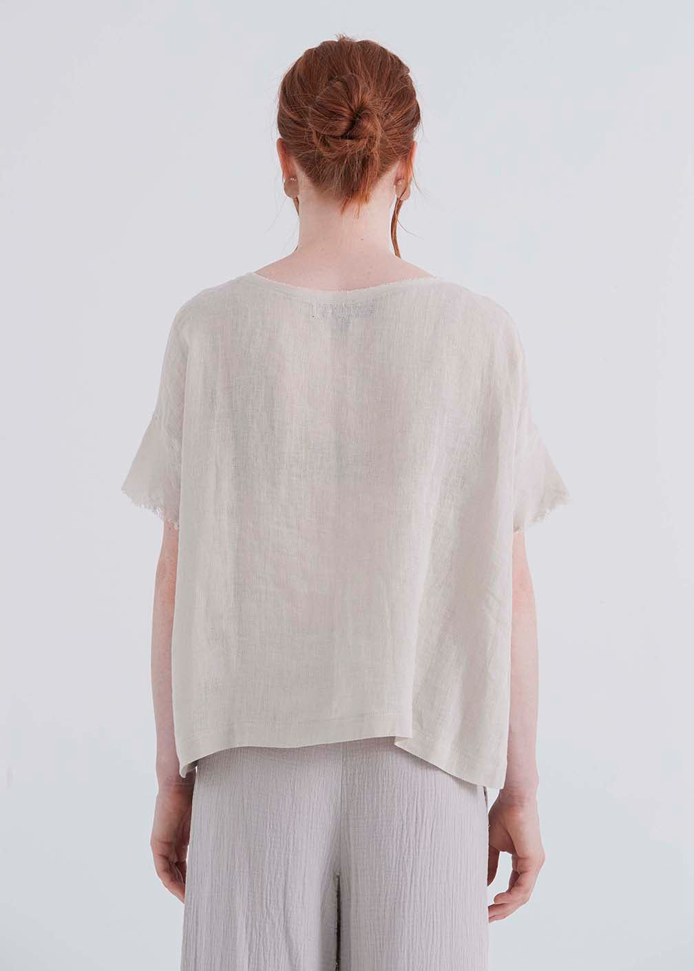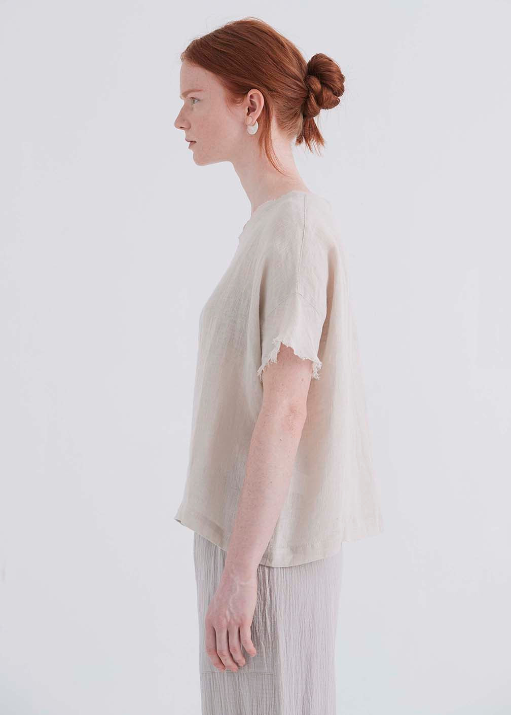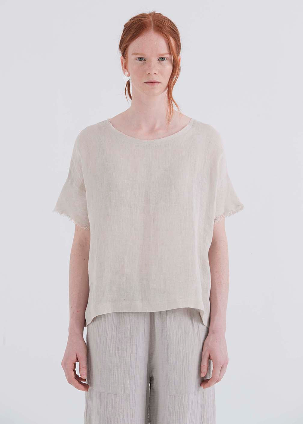 Loose fit sheer linen gauze tee with boat neck and bias cut short sleeves. Raw edge at sleeve and neckline