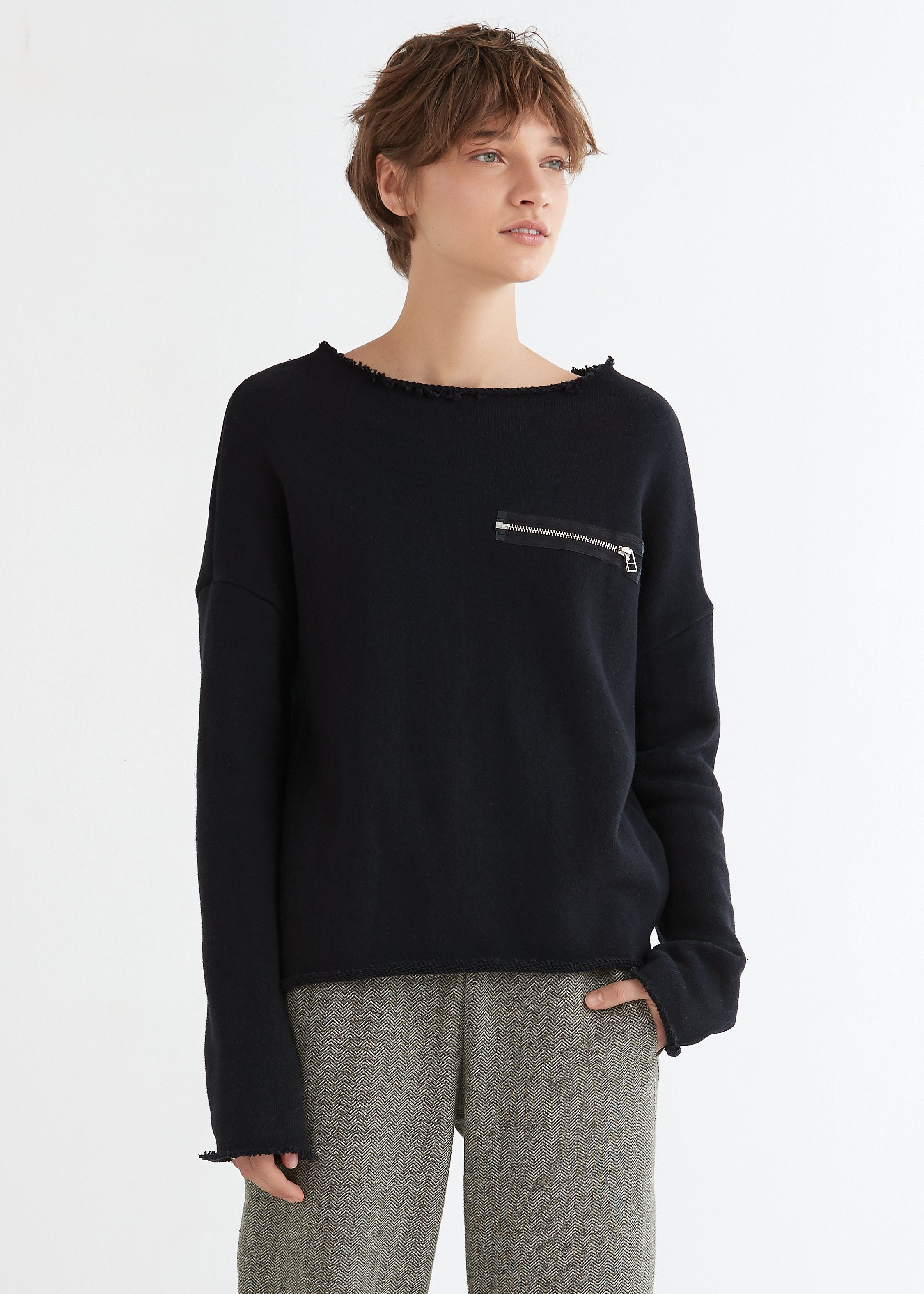 Boxy loop terry sweatshirt with drop sleeves and zipper detail.