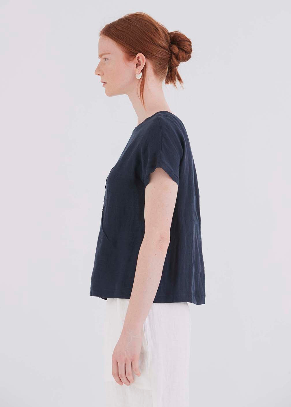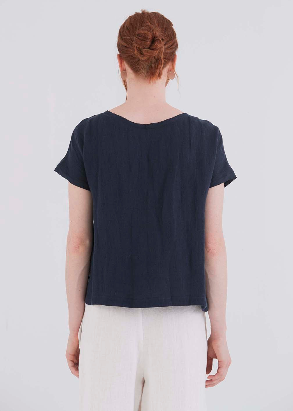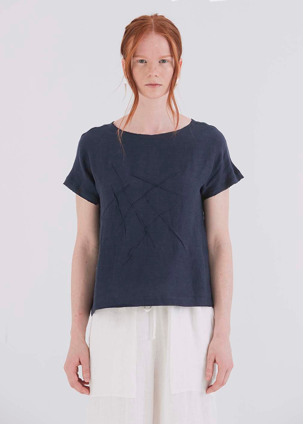 Loose fit linen top with stitching detail at front and raw edge at neck and sleeves