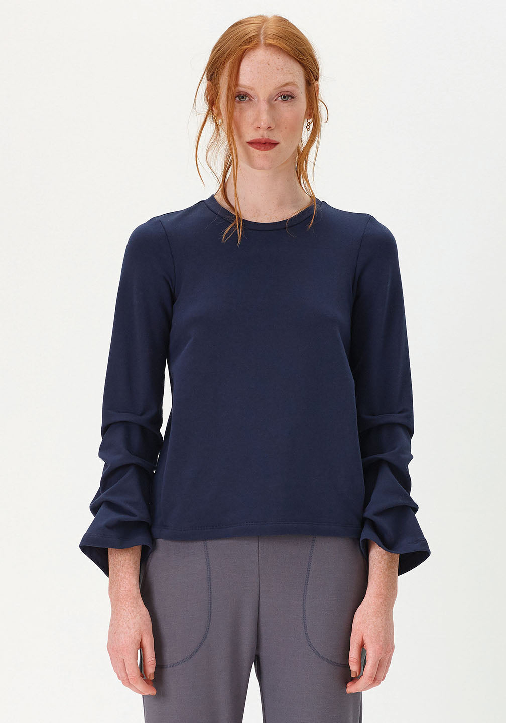 Classic pullover with graceful bell sleeve ruching and hidden kangouroo pockets
