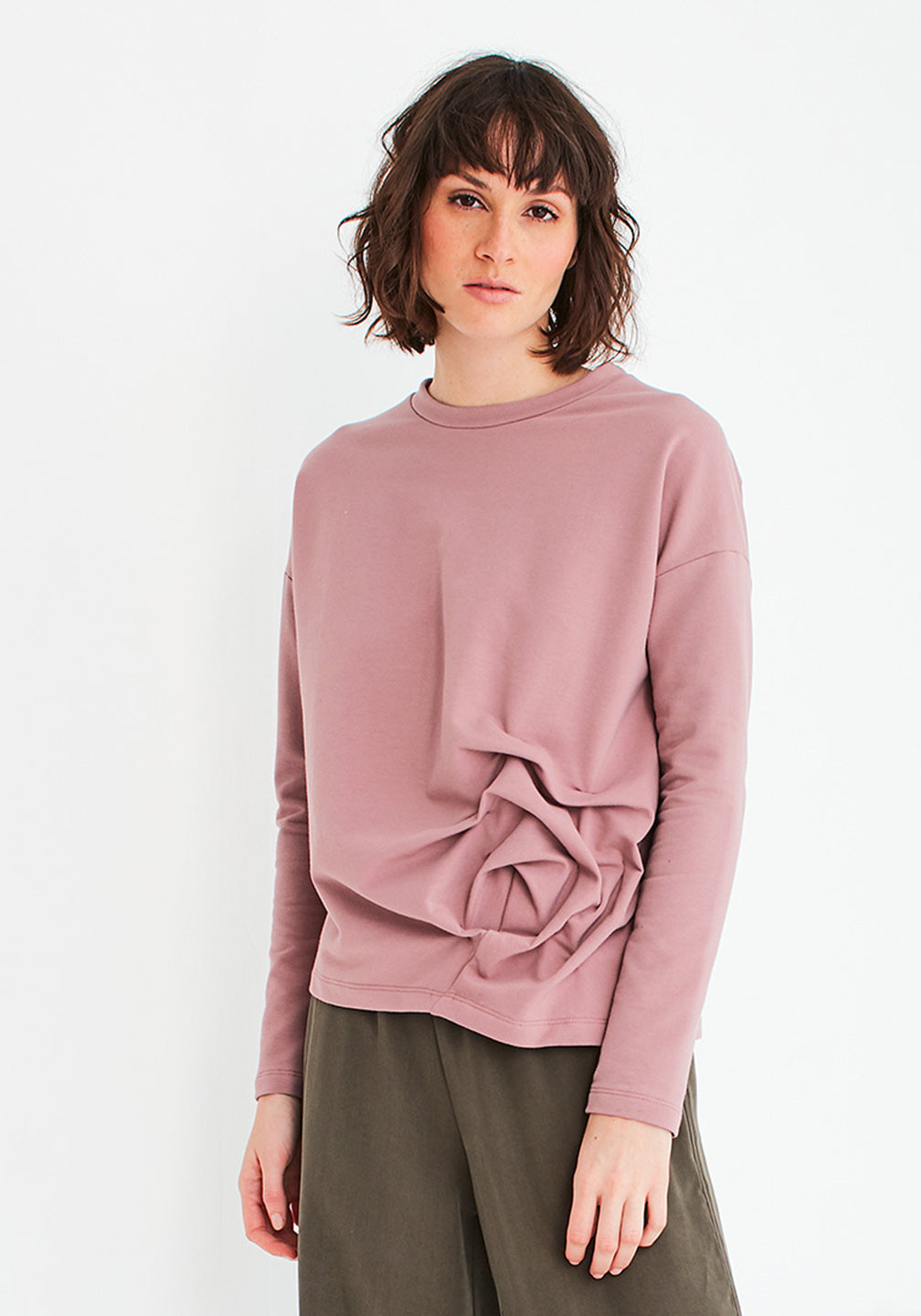 Crew neck fleece top with deconstructed pleating at side