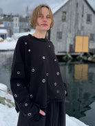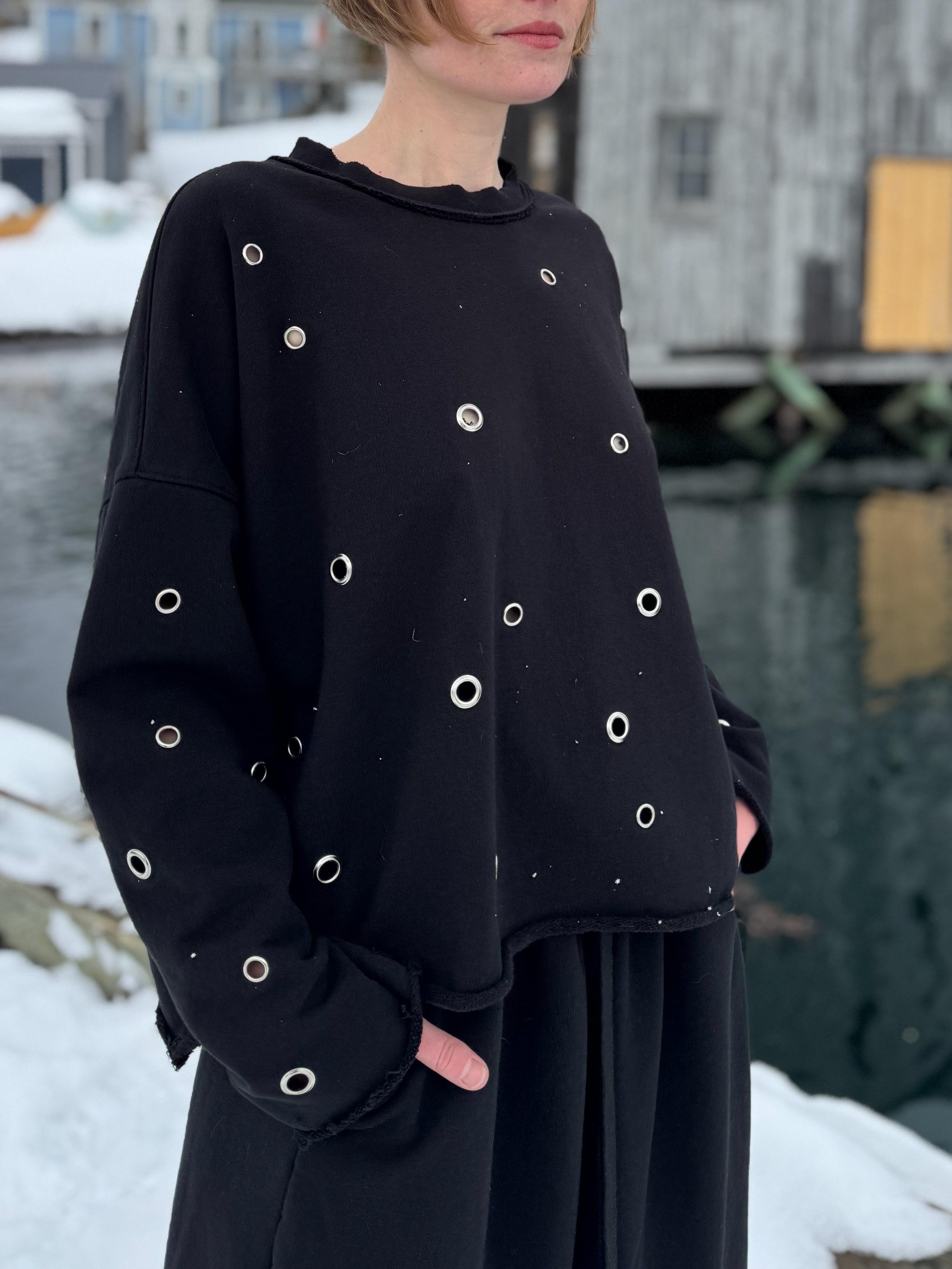 The ORBIT fleece top is cut from thick cotton fleece and finished with scattered metal grommets that create subtle points of contrast across the deep black surface. Raw edges soften the silhouette while the relaxed shape allows the garment to drape naturally around the body.