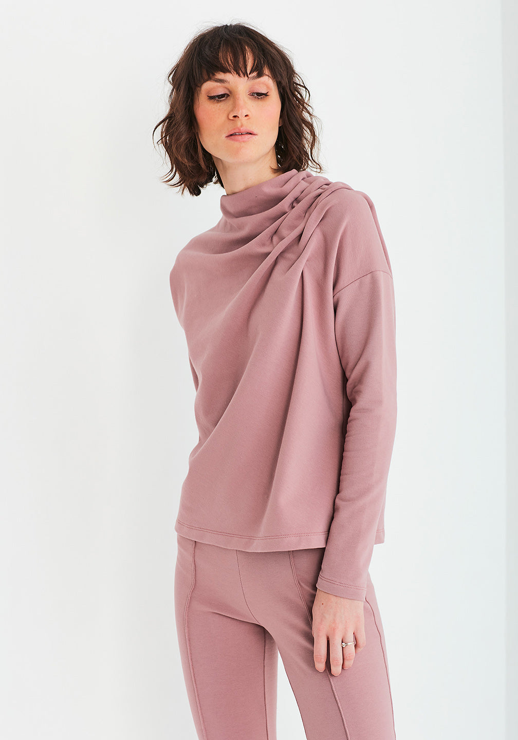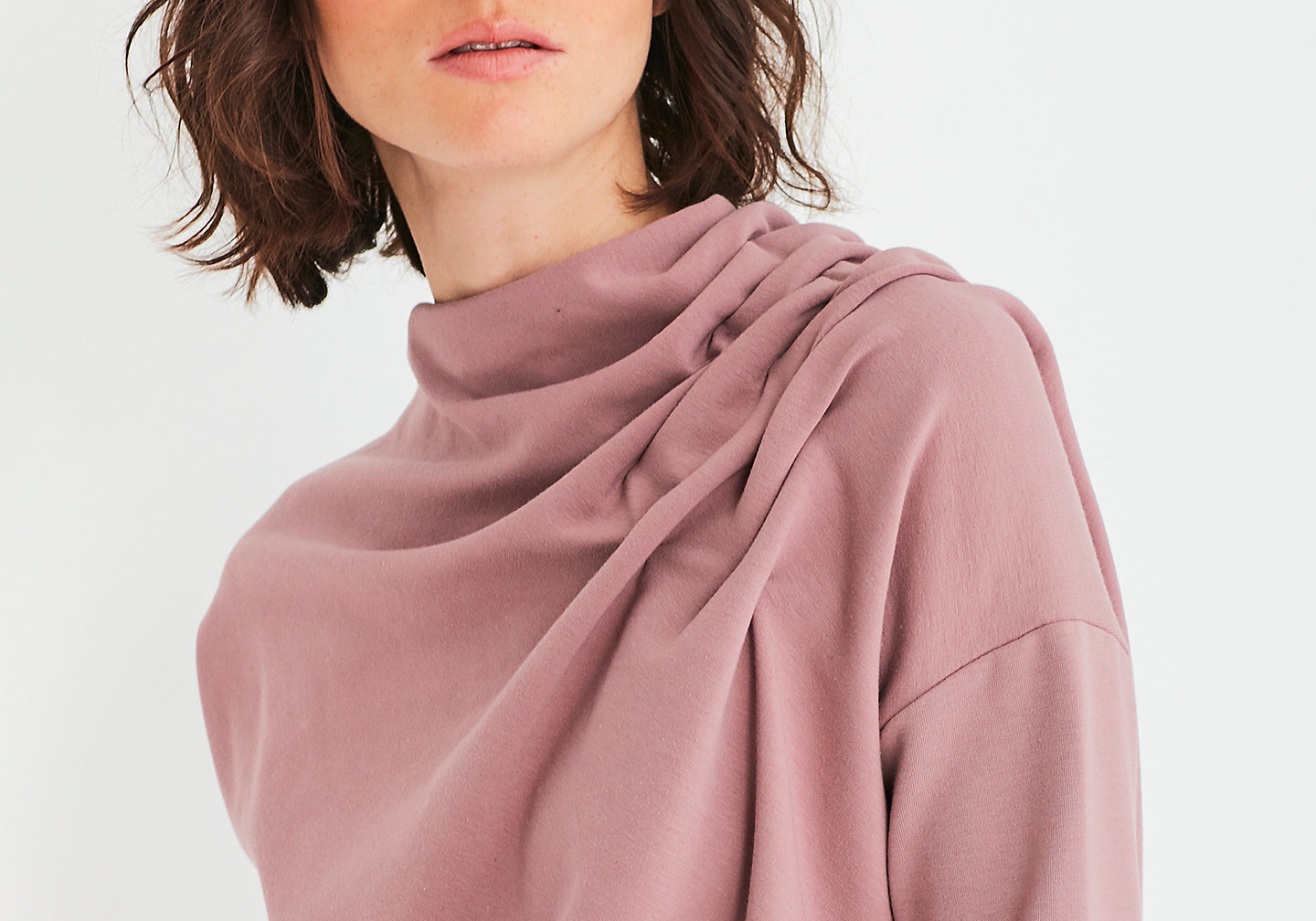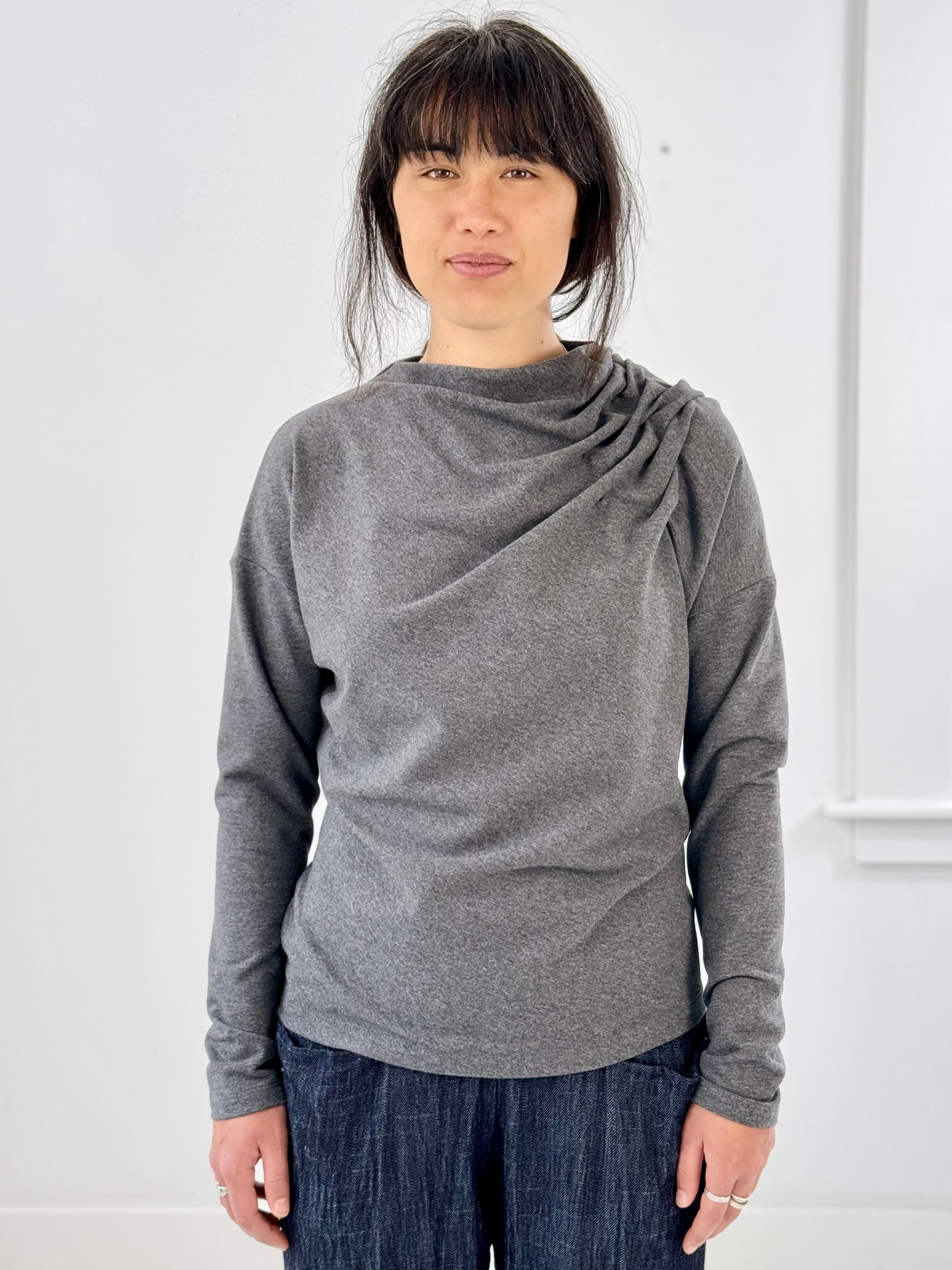 Soft structure meets sculptural design. The Ruby Top features a signature draped fold that creates effortless shape and quiet movement across the front. Made in cozy black French fleece, this piece blends comfort with modern elegance—perfect for elevated everyday wear.